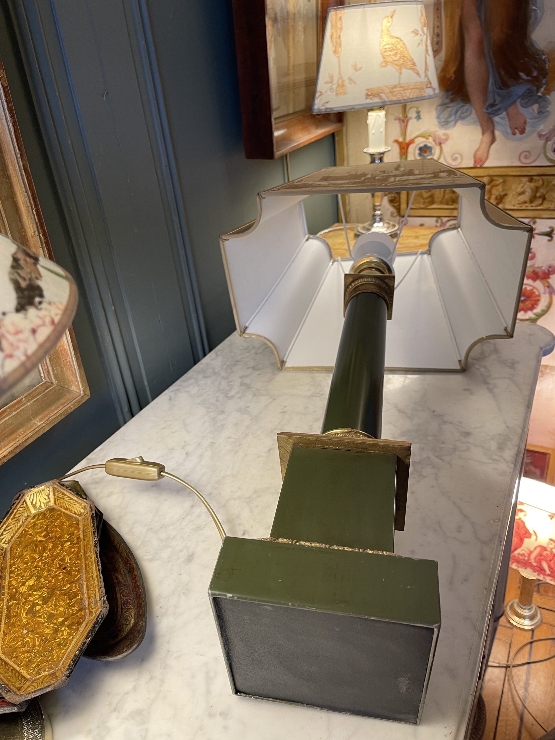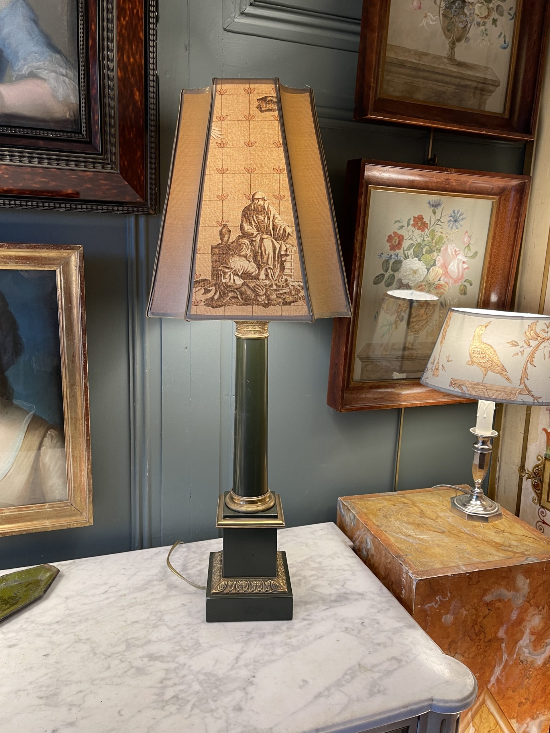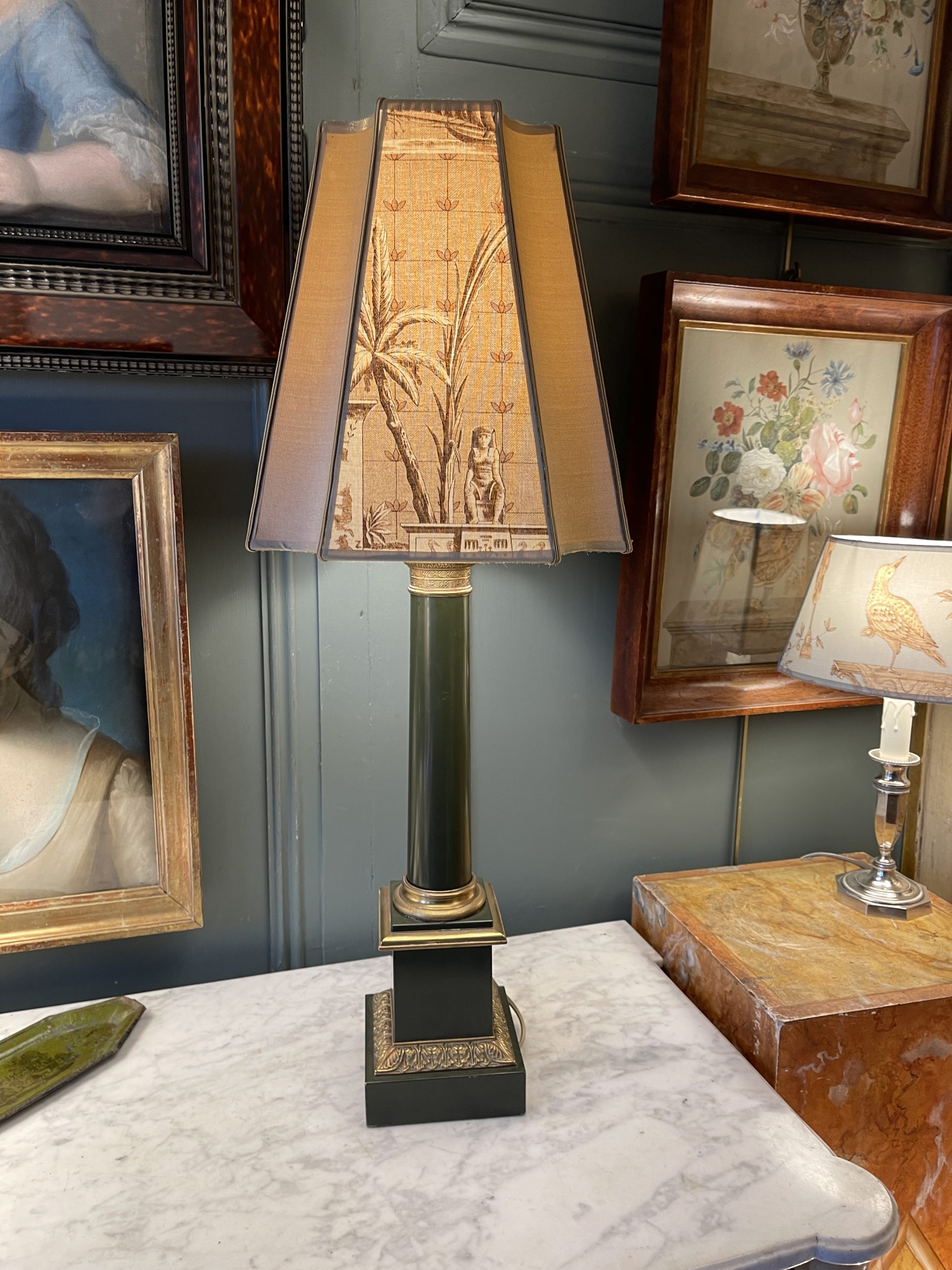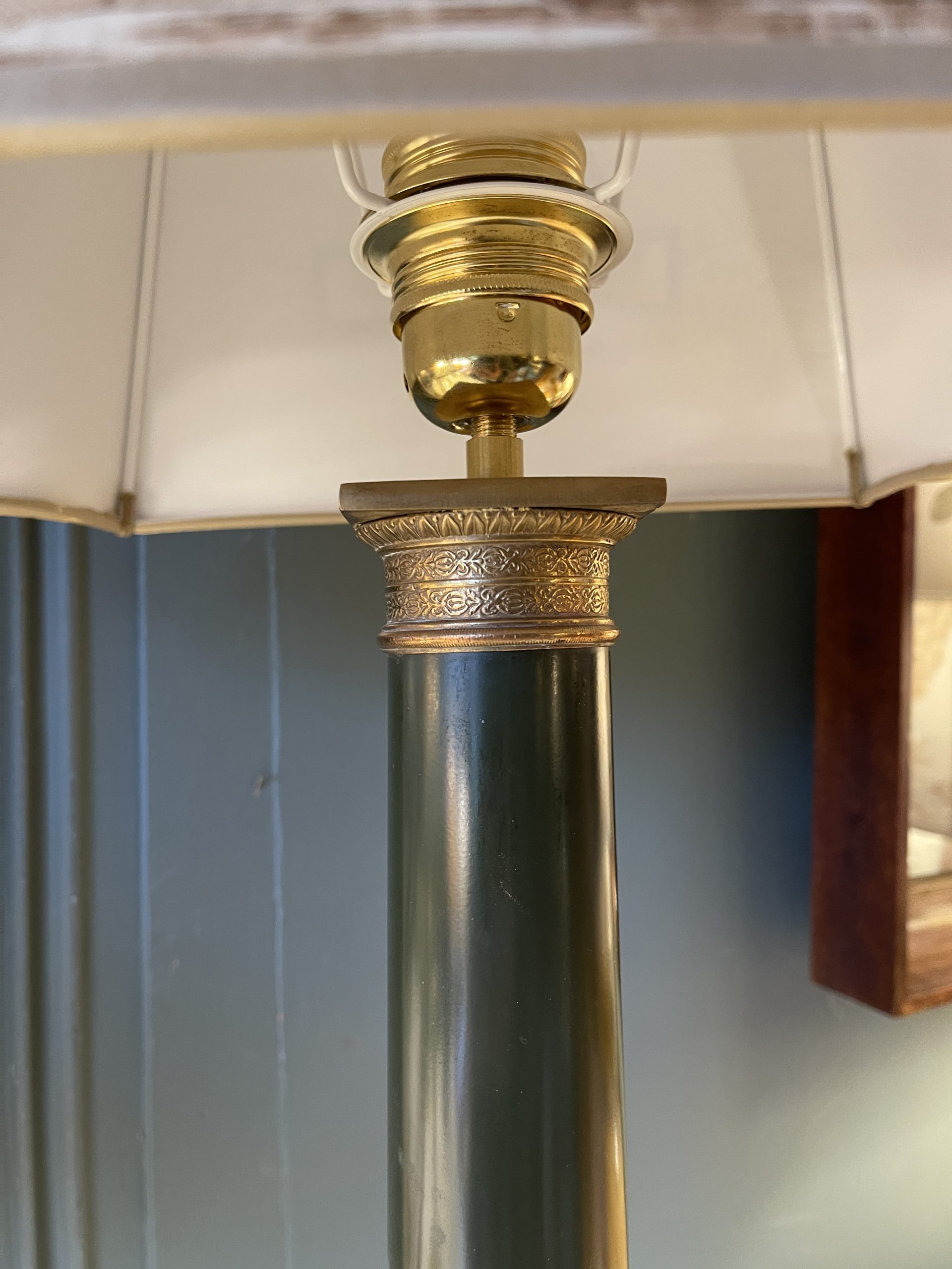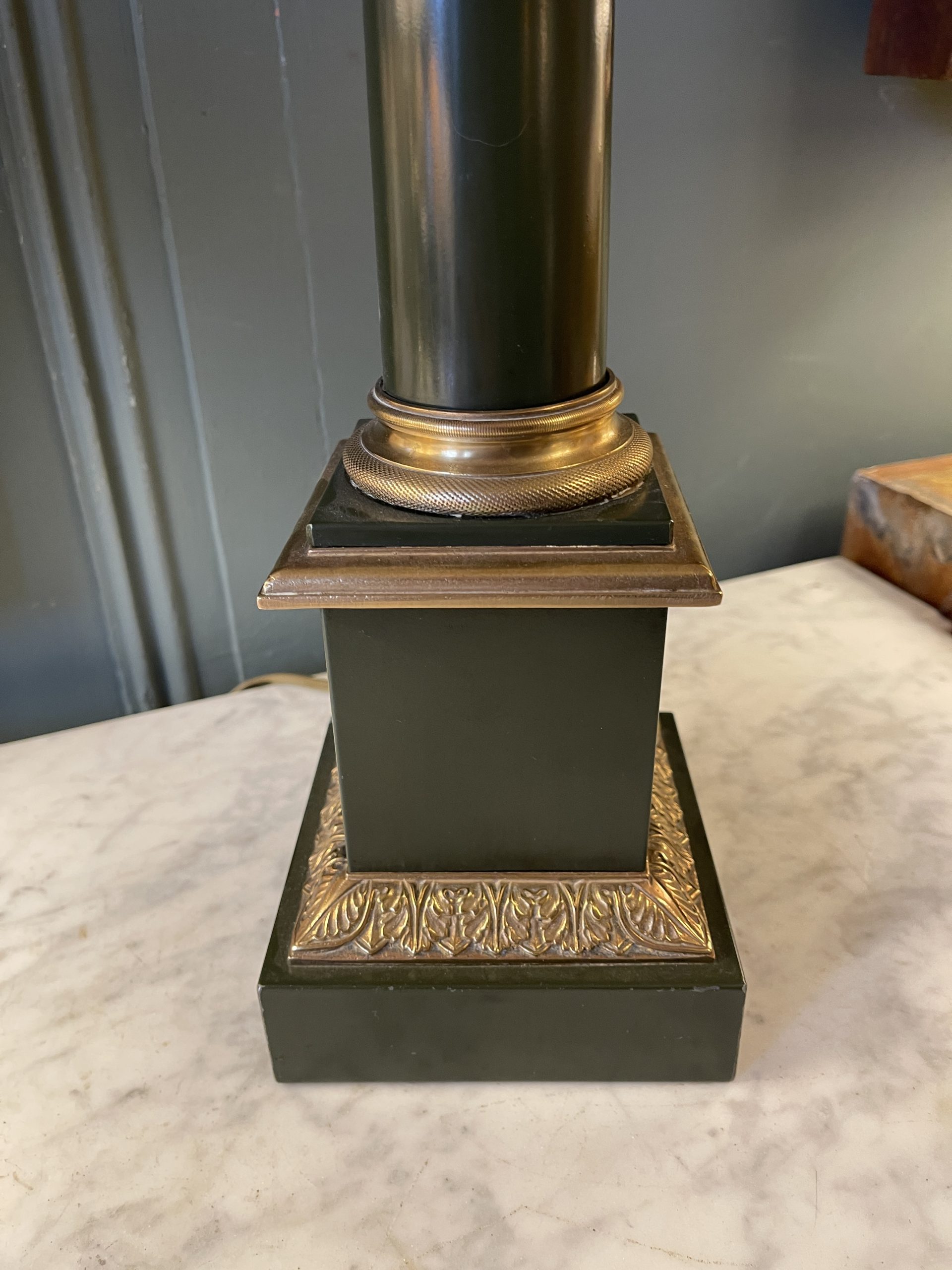 Lampe style Carcel en tôle peinte de couleur vert foncé et laiton en forme de colonne d’ordre Toscan stylisée, époque XXème.
