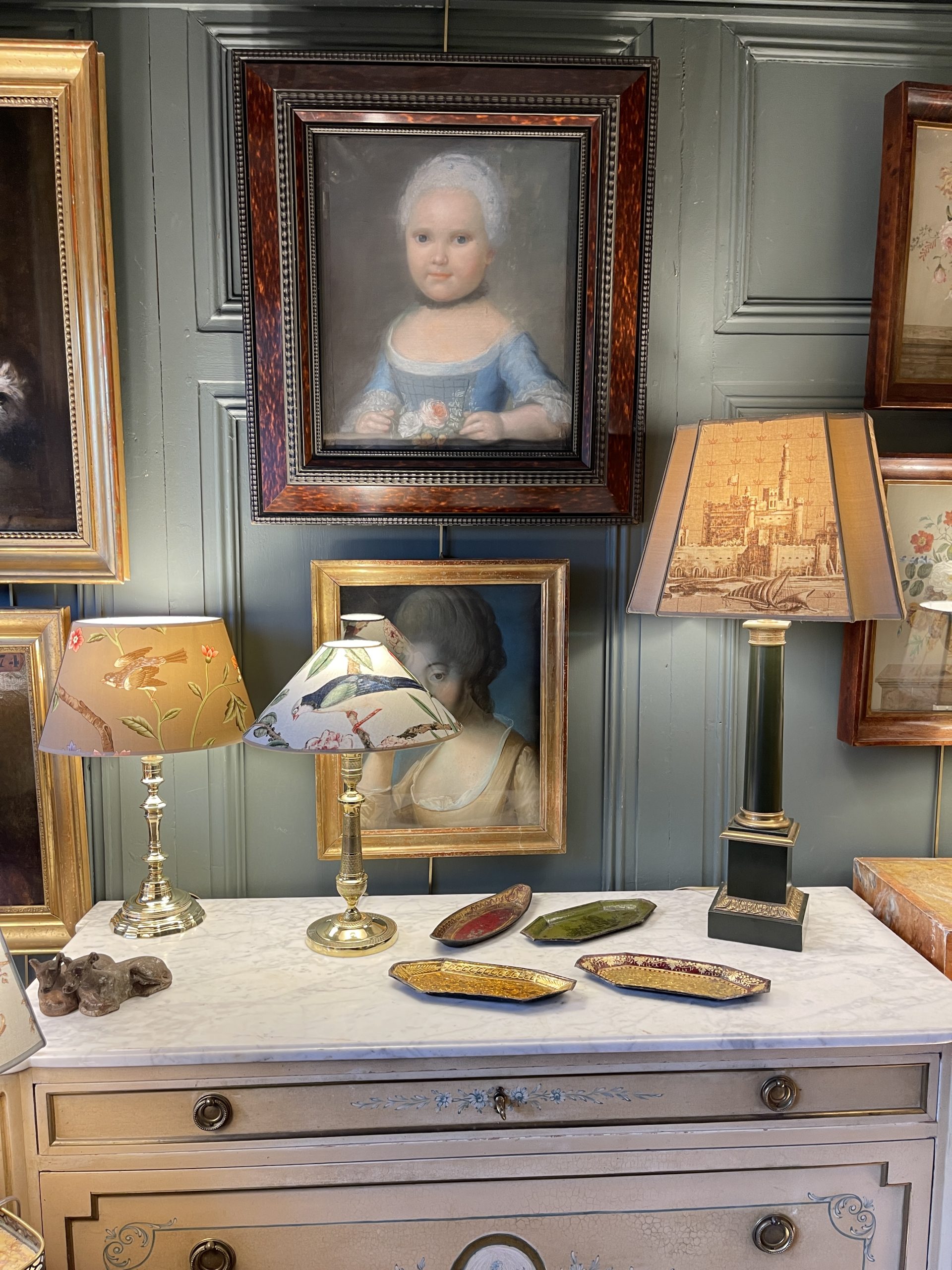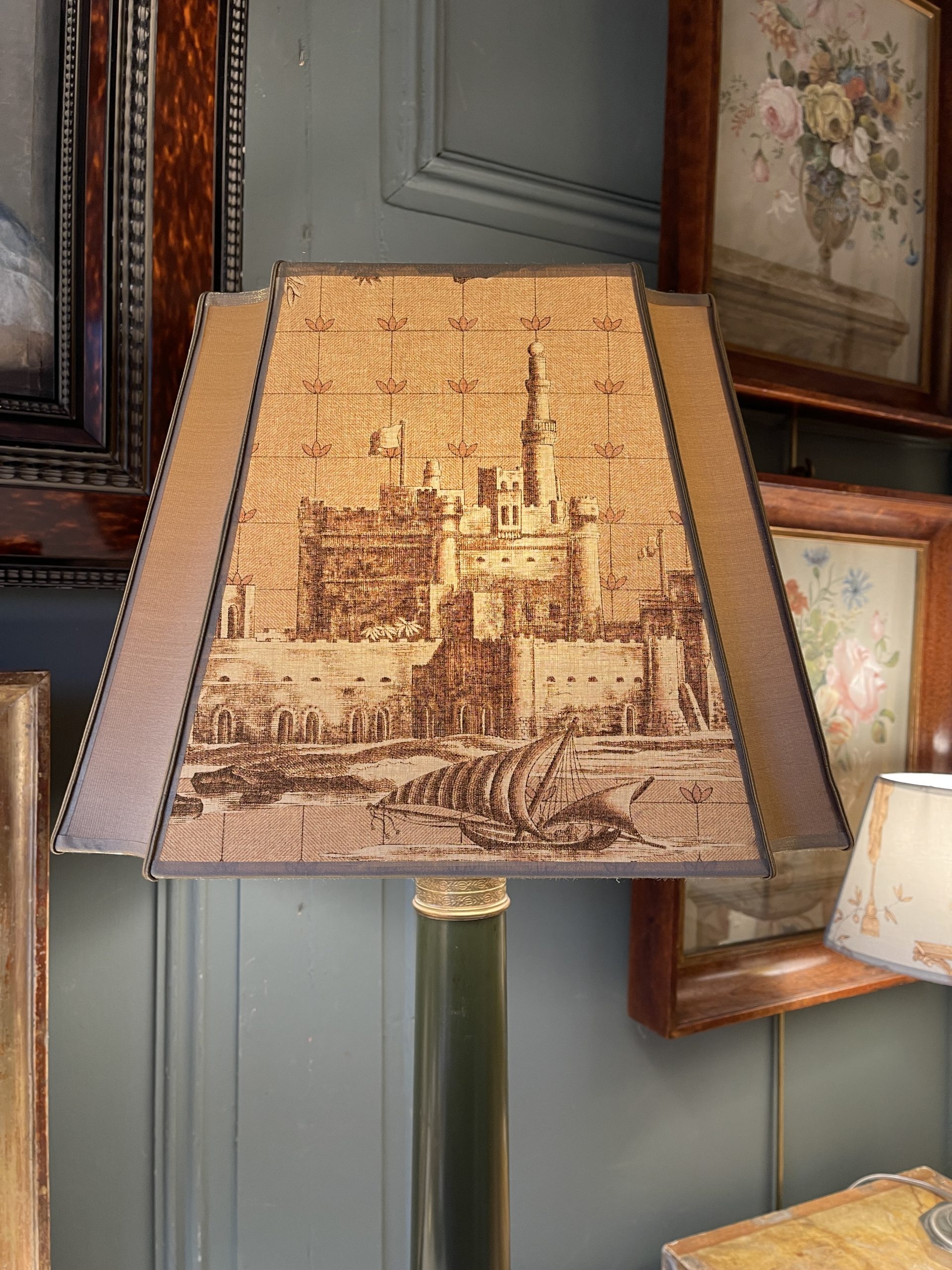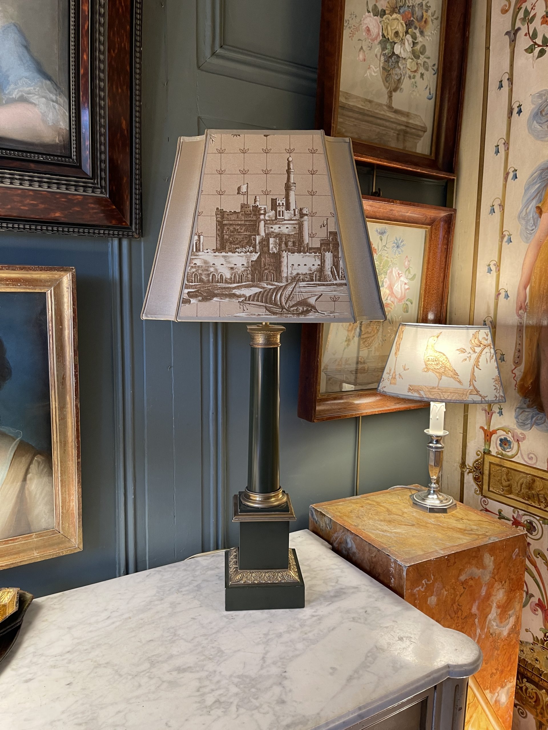 Son abat-jour de forme carré espagnol, a été créé sur mesure à partir d’un tissu « Monuments d’Egypte » de la maison Braquenié.