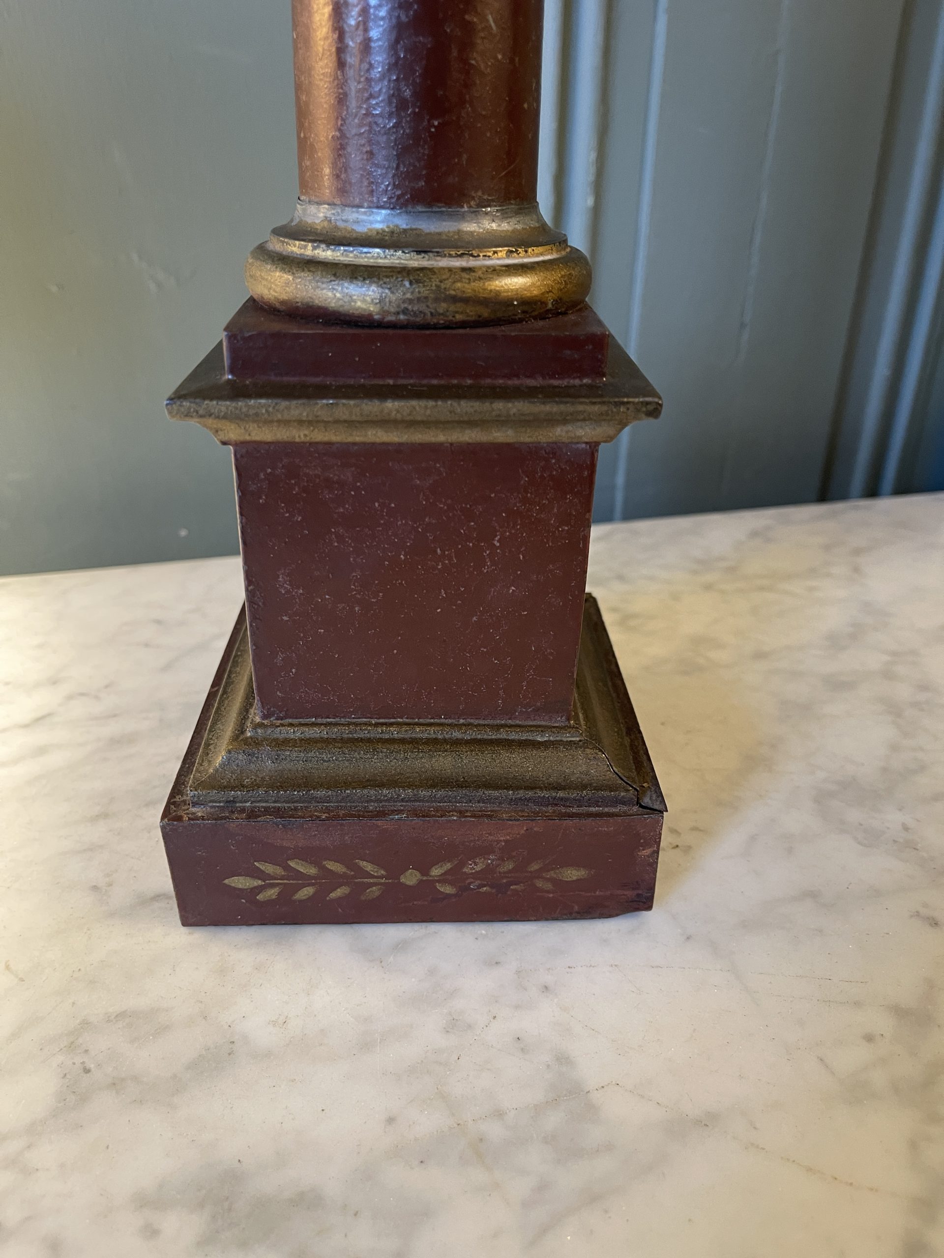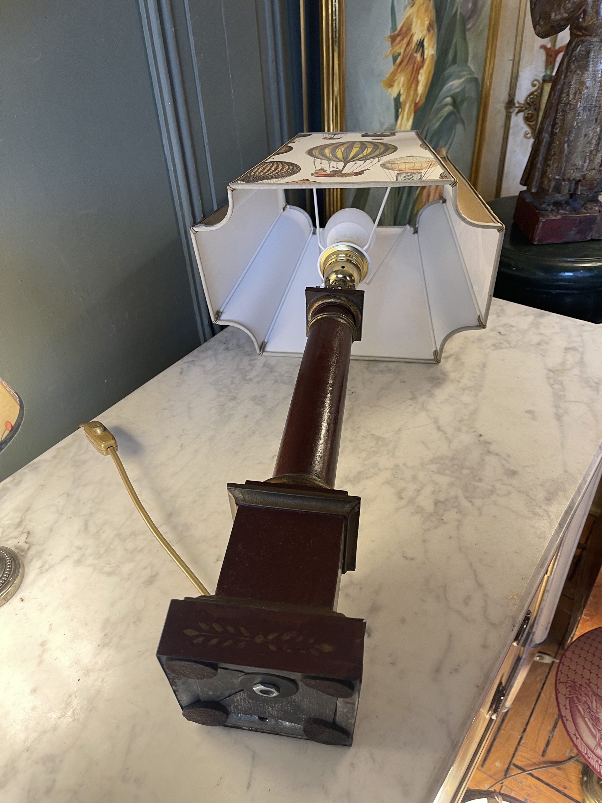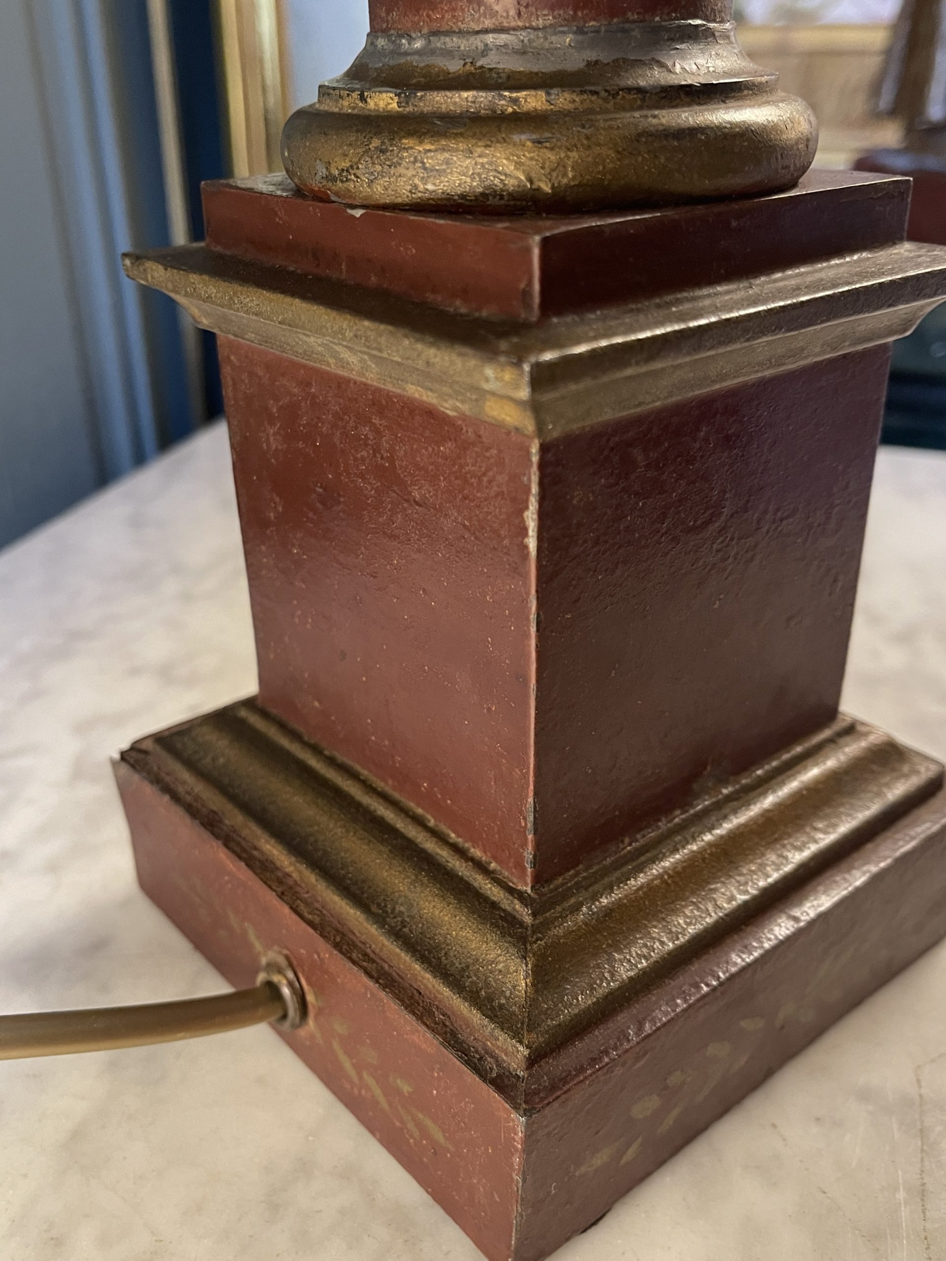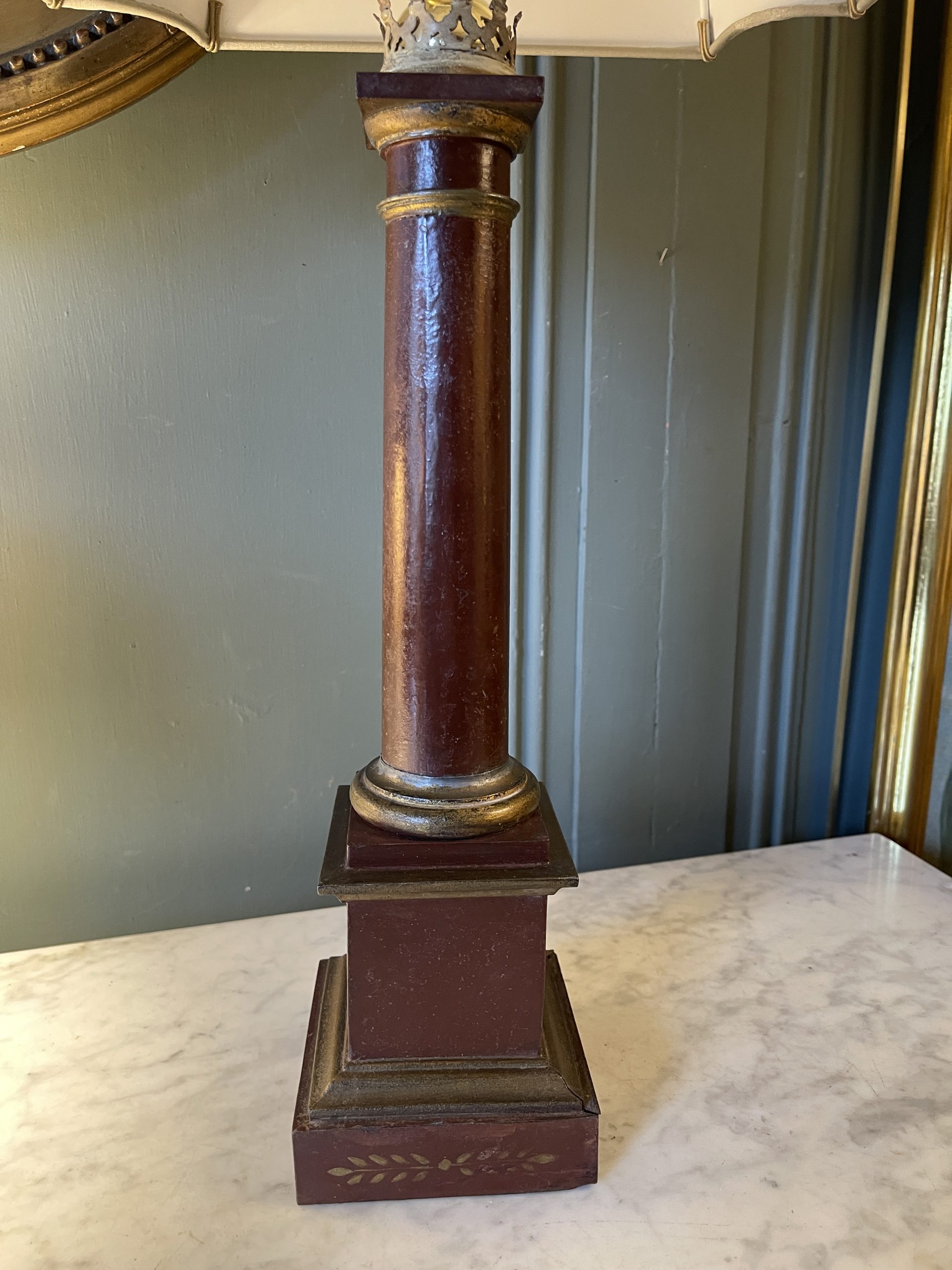 Lampe en tôle peinte en forme de colonne d’ordre Toscan de couleur rouge « sang de boeuf » et doré époque XIXème.