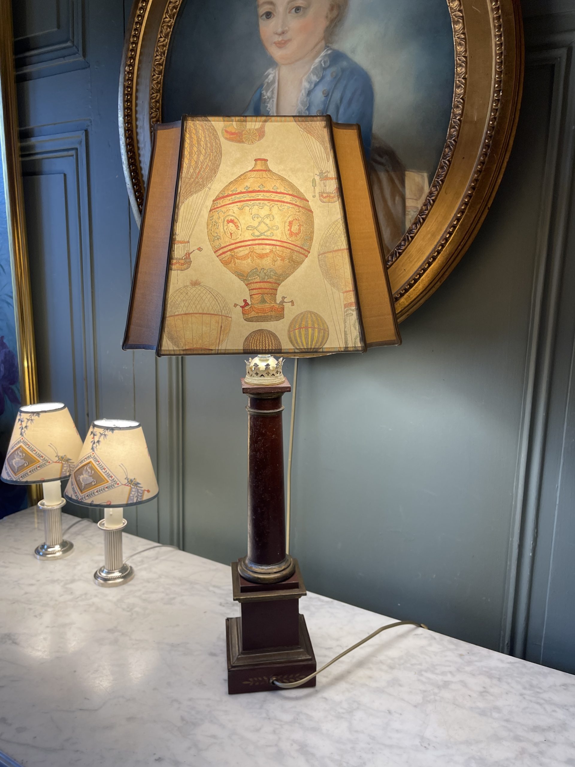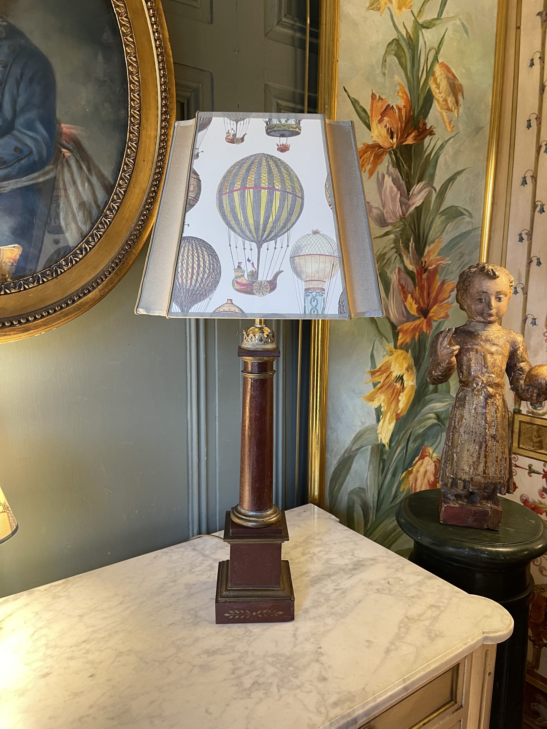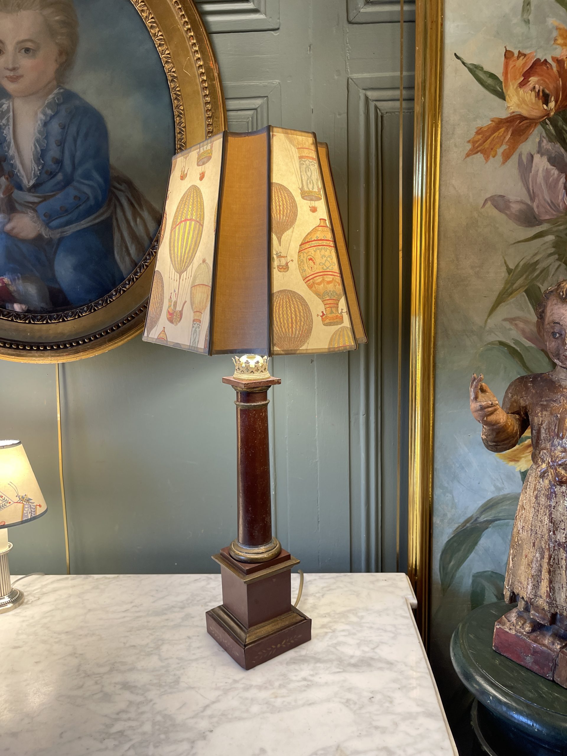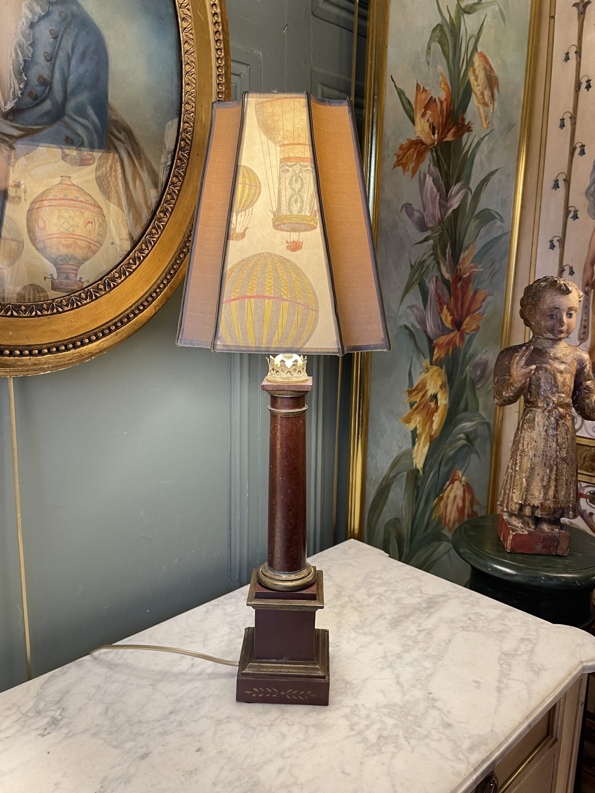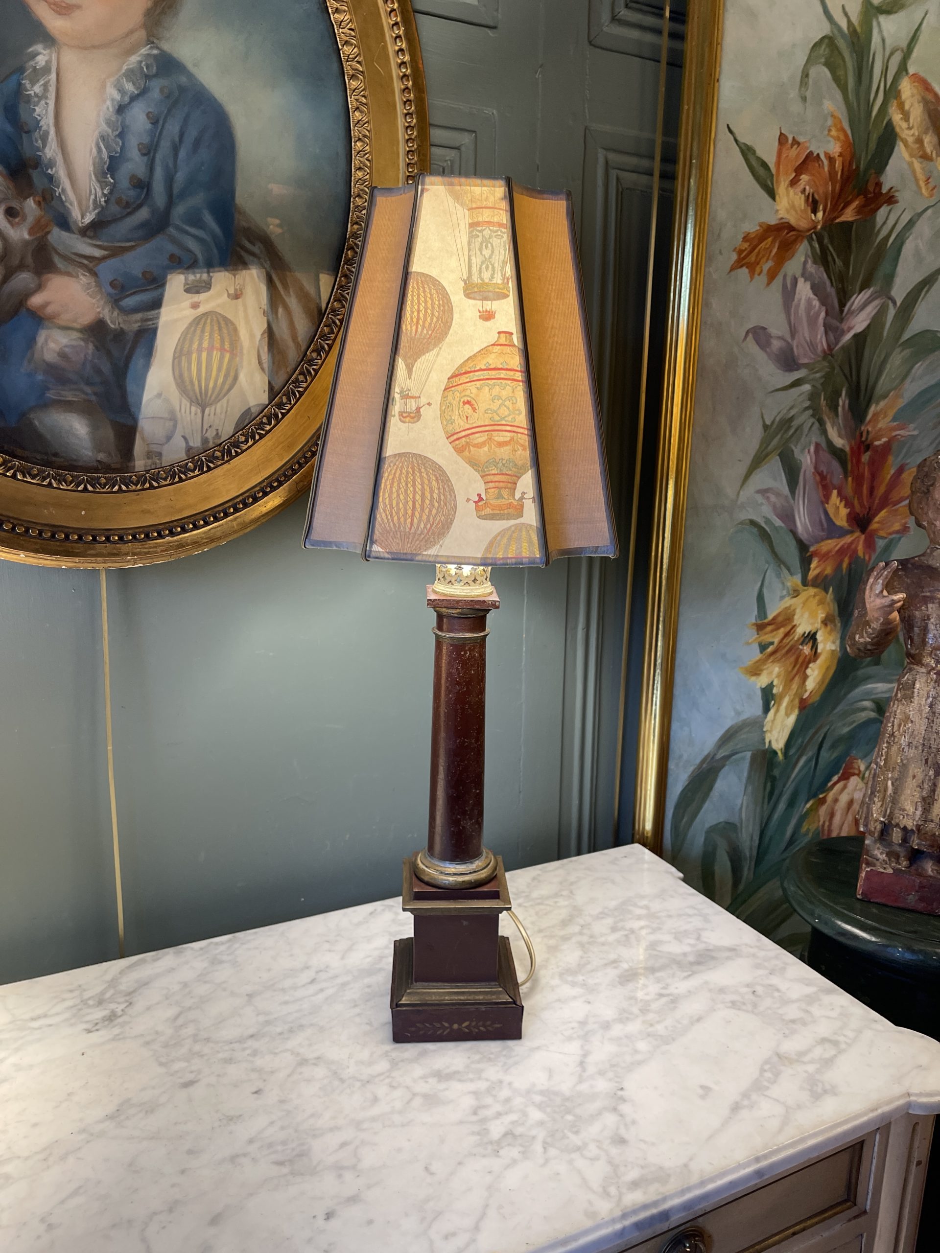 Lampe en tôle peinte en forme de colonne d’ordre Toscan de couleur rouge « sang de boeuf » et doré époque XIXème.