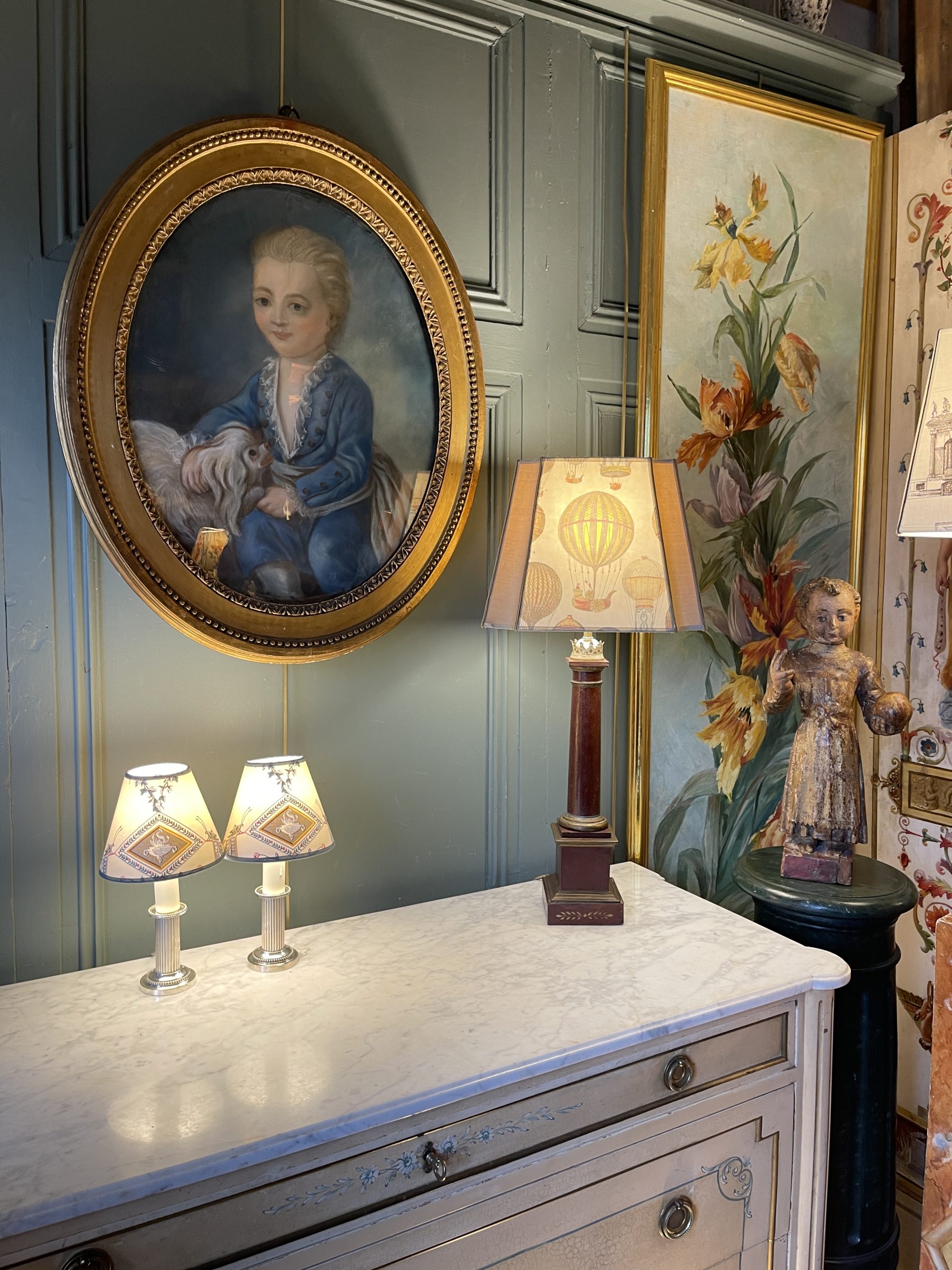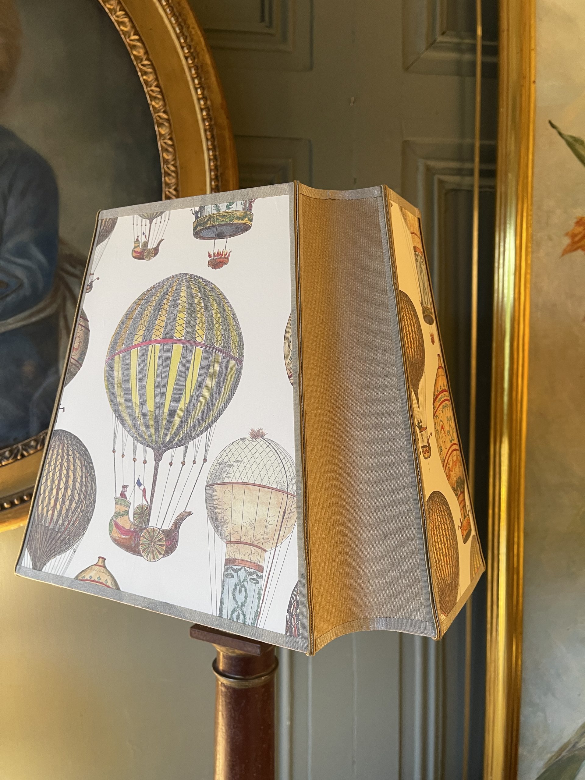 Son abat-jour de forme carré espagnol, a été créé à partir d’un papier peint à décor de montgolfières avec un tissu en satin de couleur ocre doré.