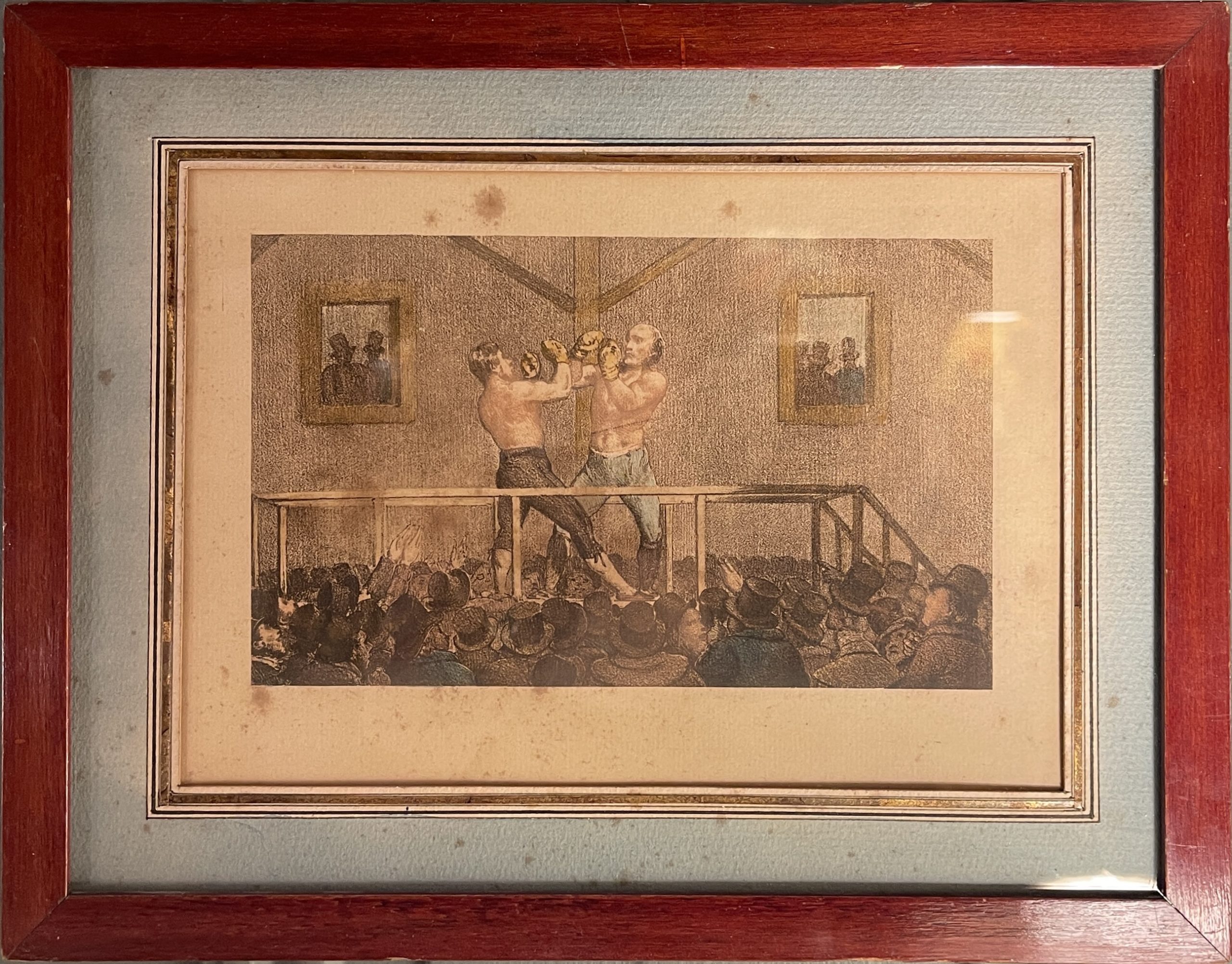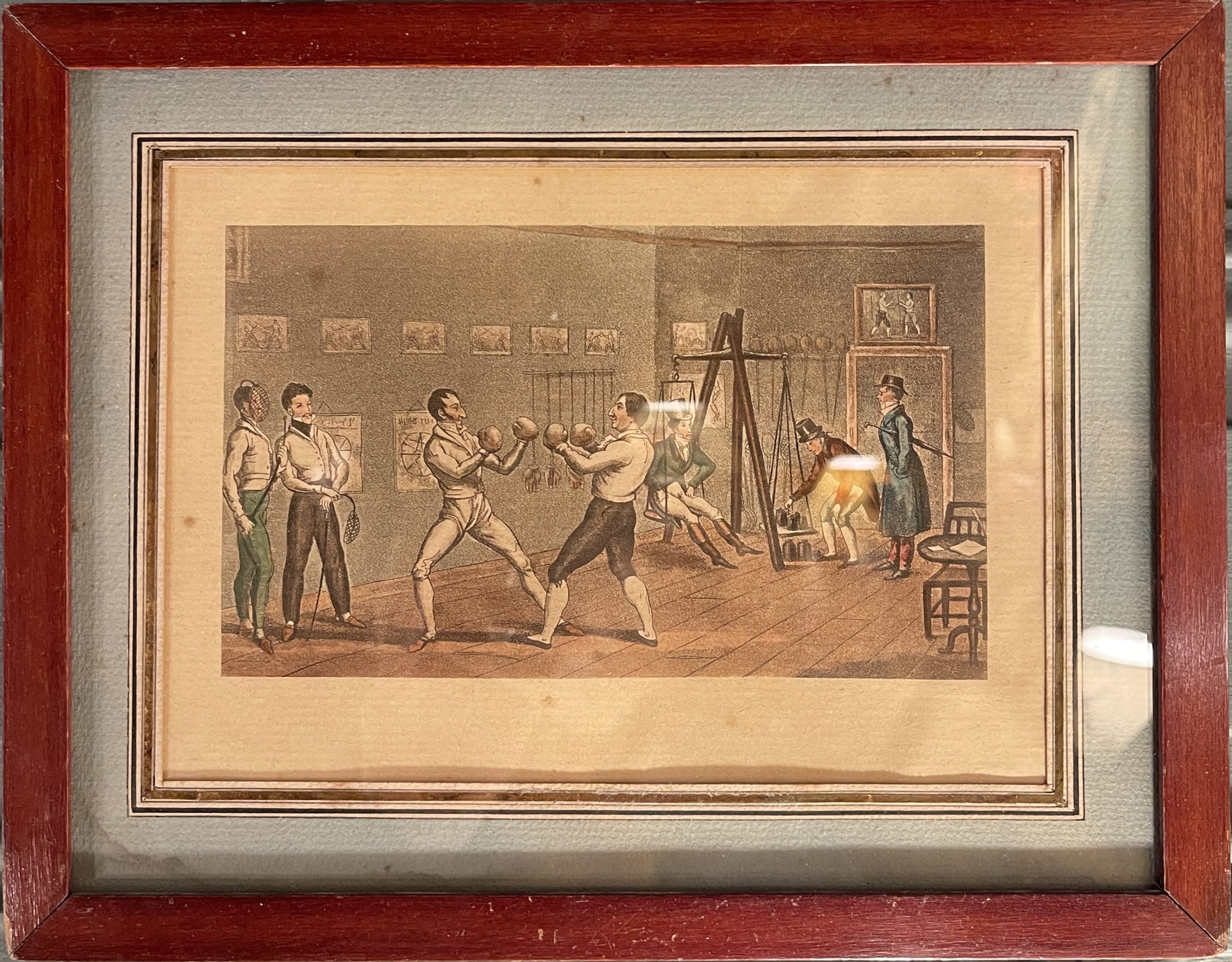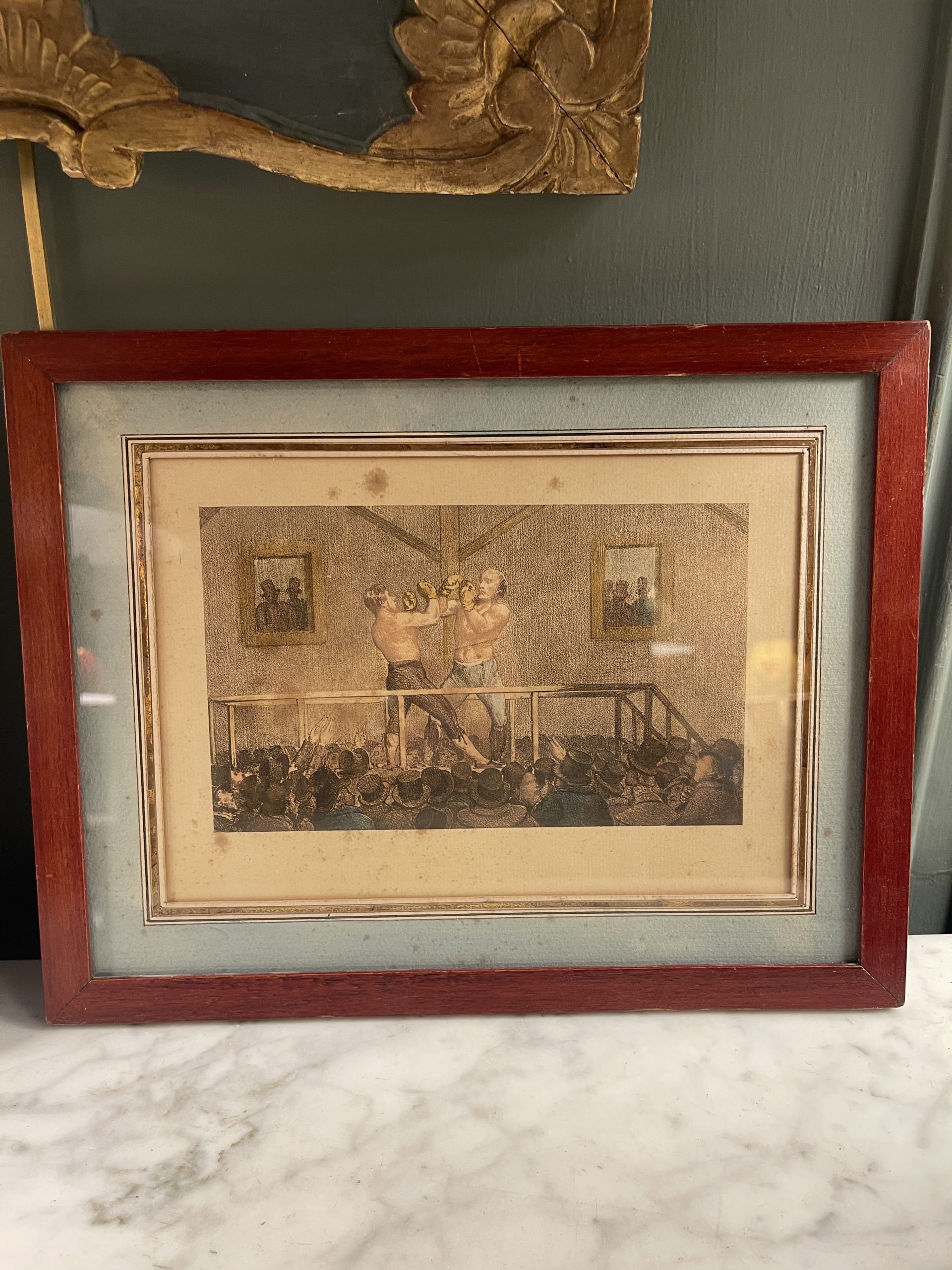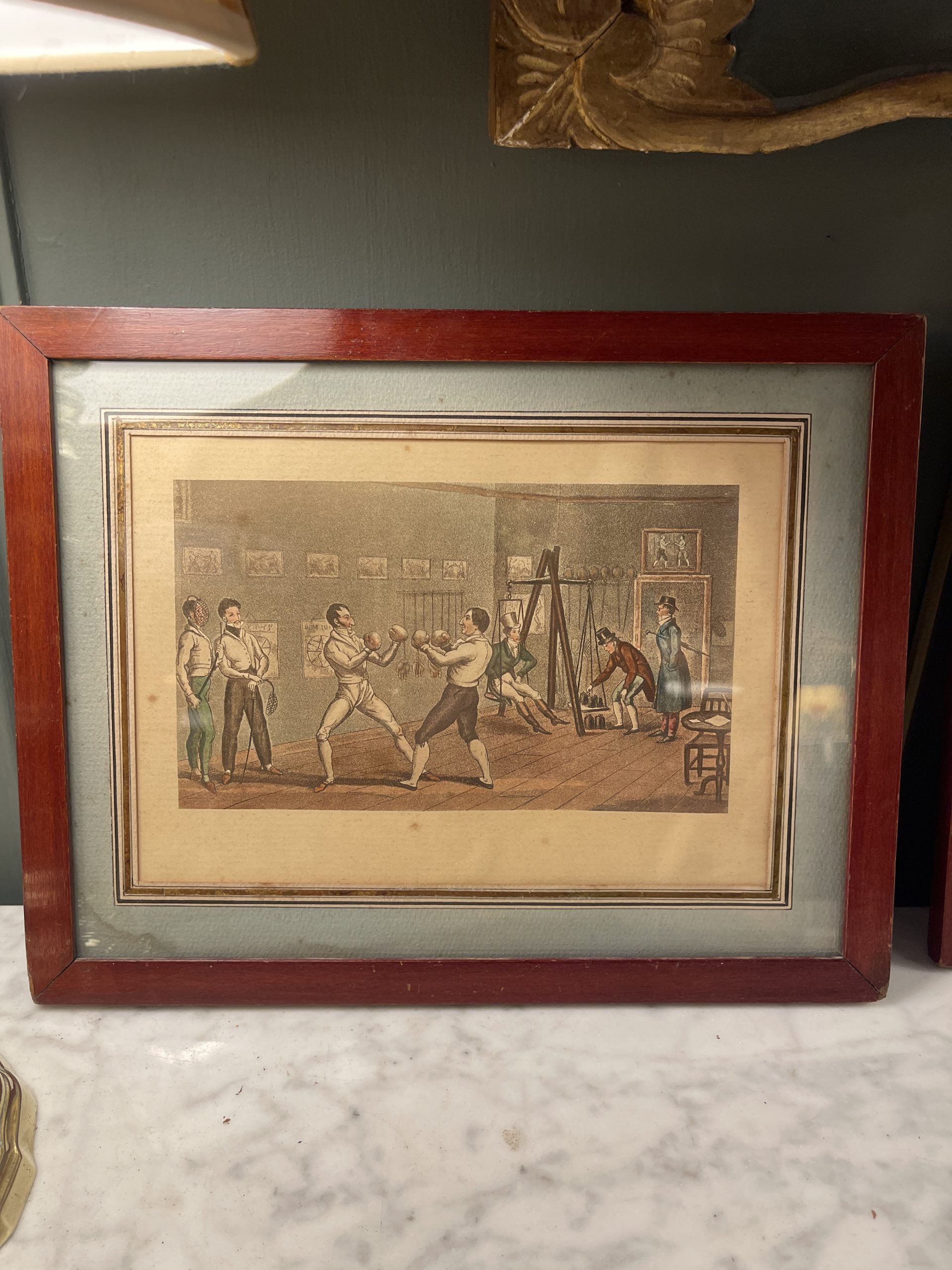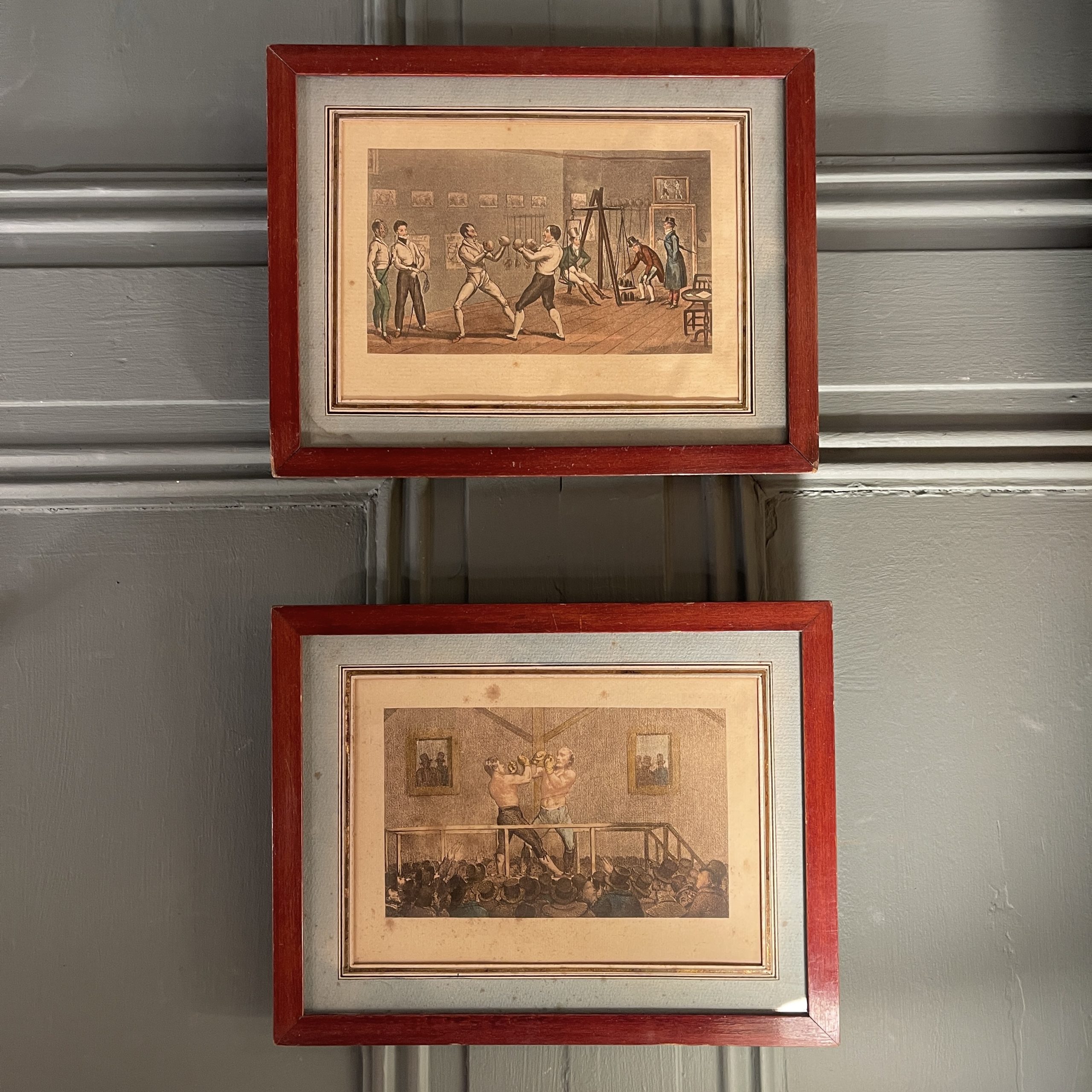 Paire d’estampes representant un cour de self-defense et un match de boxe tirée de l’ouvrage « Life in London; or, The Day and Night Scenes of Jerry Hawthorn » publié en 1821.