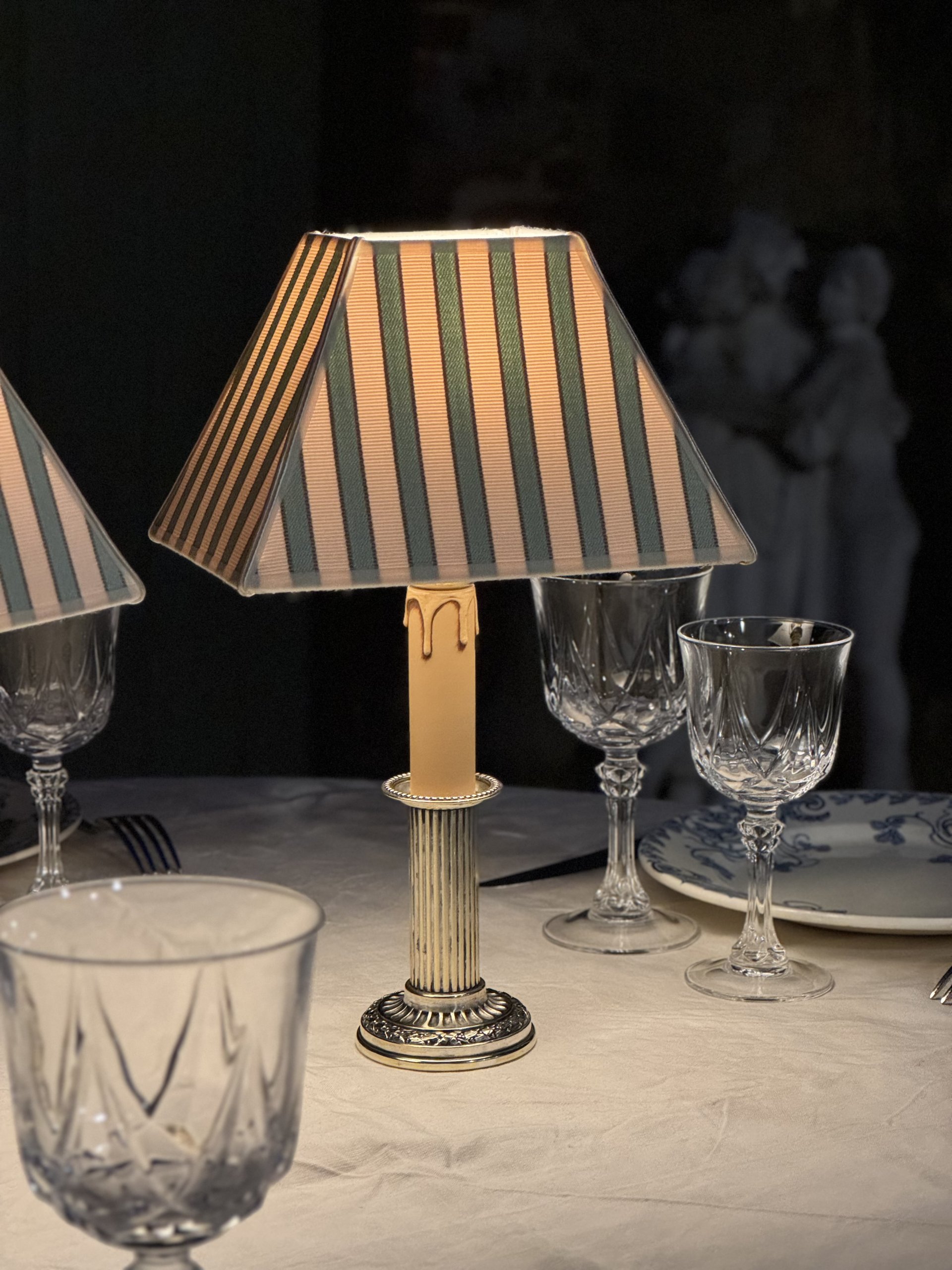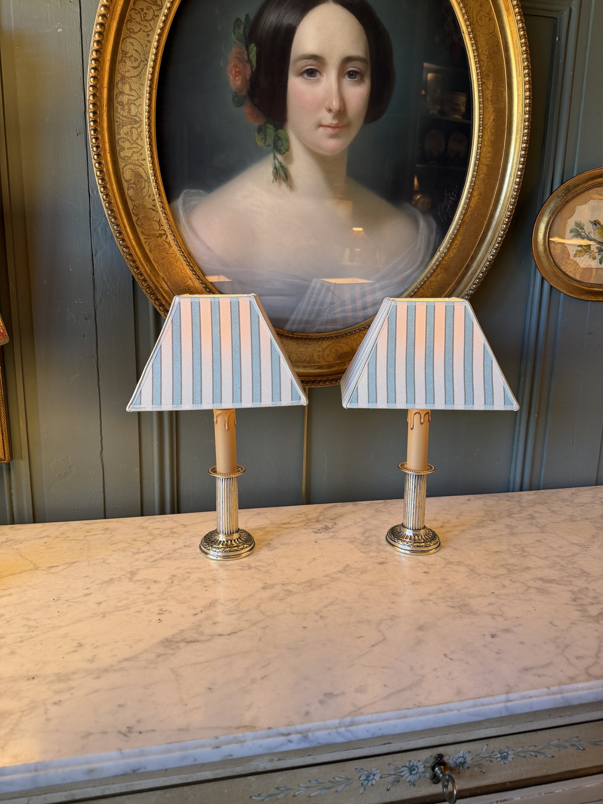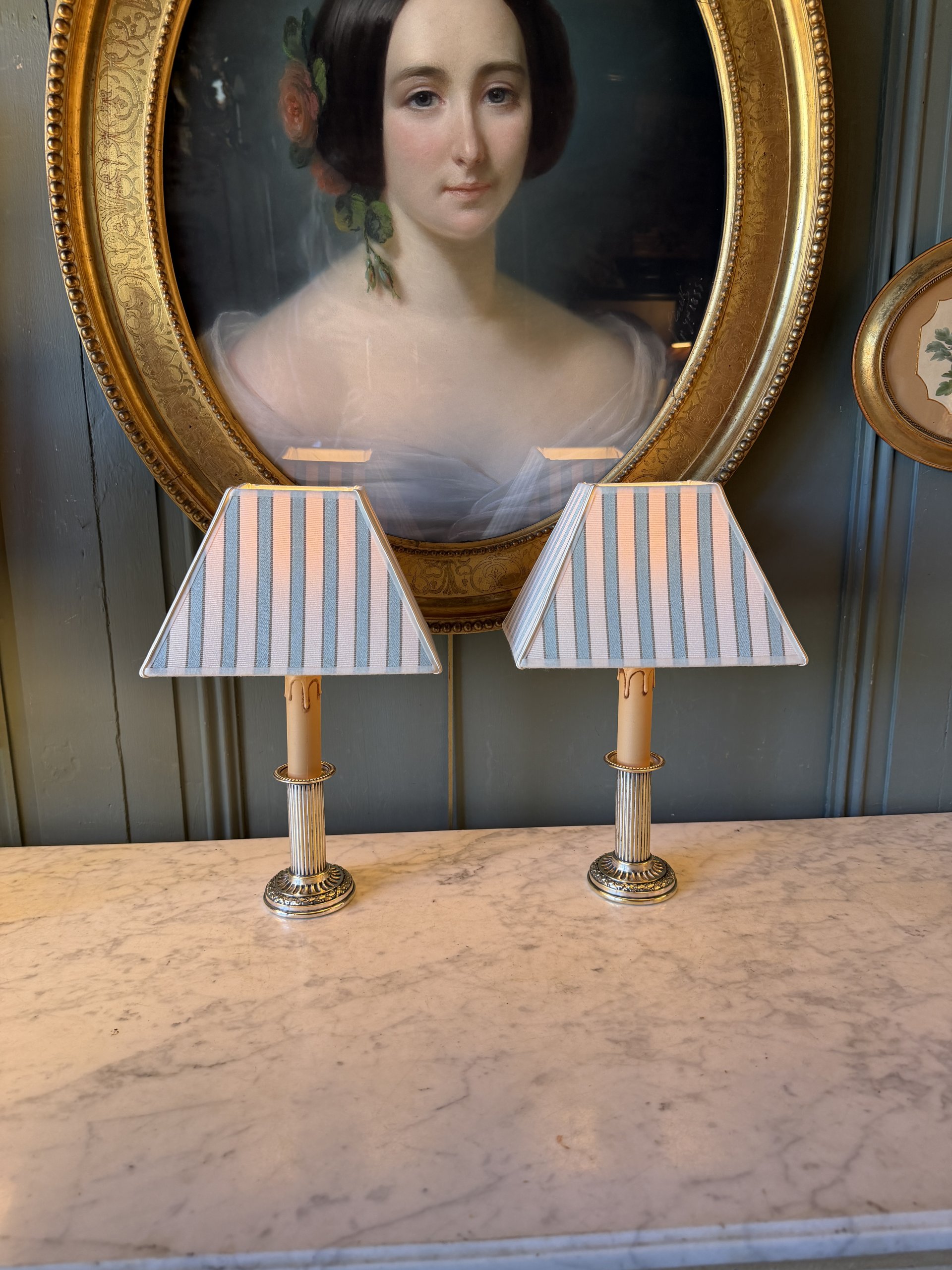 Les abat-jour de forme rectangle ont été créés à partir d’un tissu de Manuel Canovas « Sophie » coloris Jade.