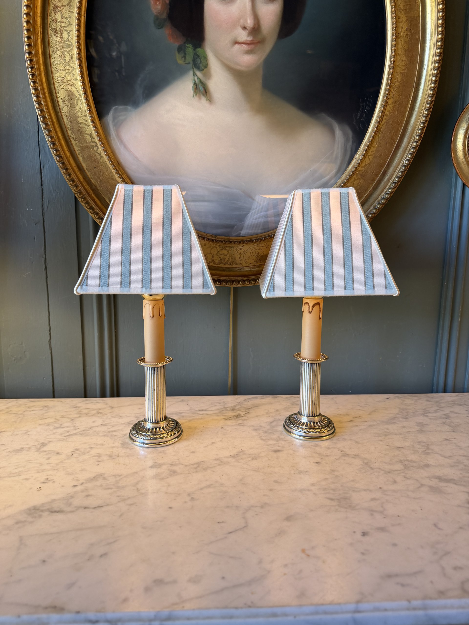 Paire de bougeoirs de table en métal argenté de style Louis XVI époque XXème montés en lampes sans fil.