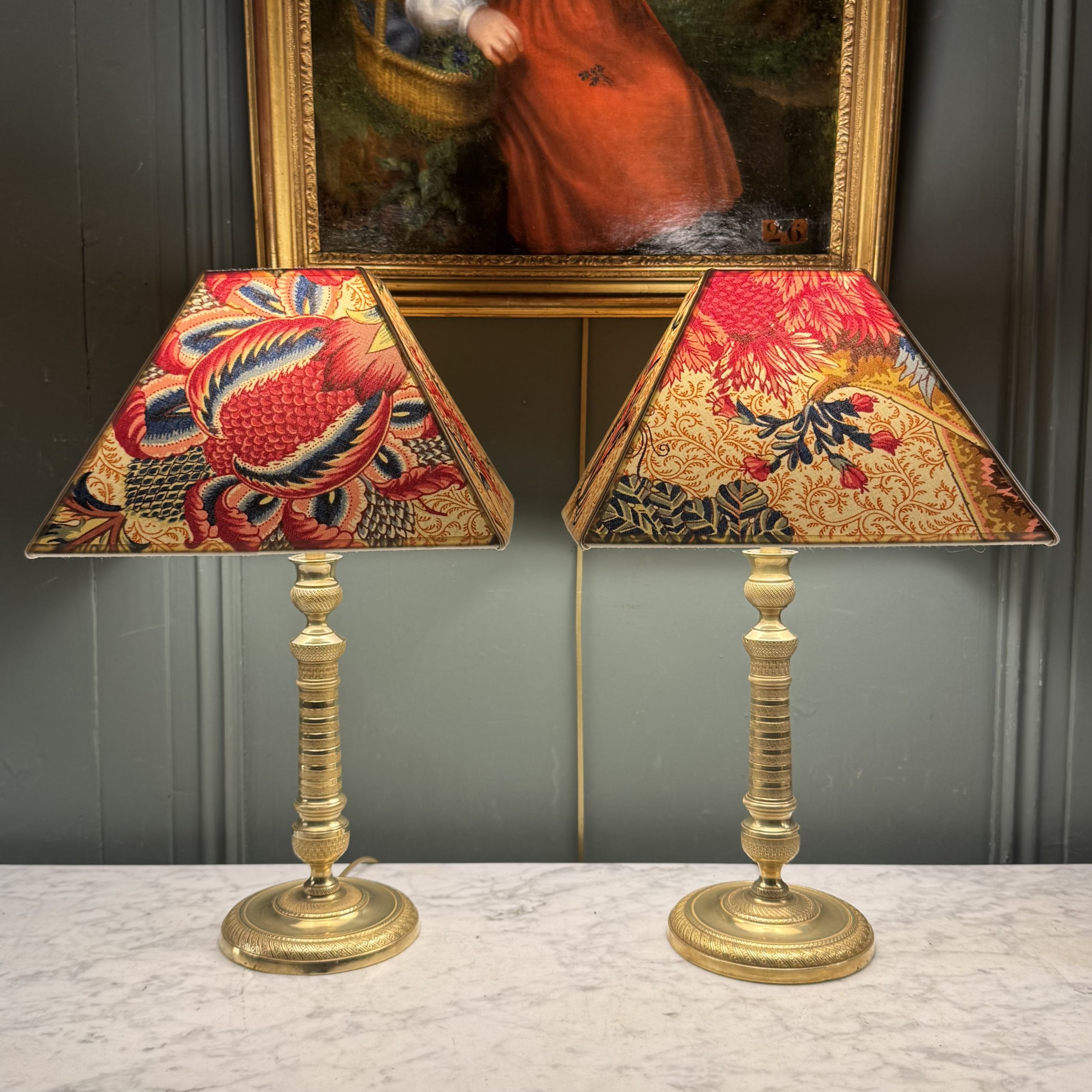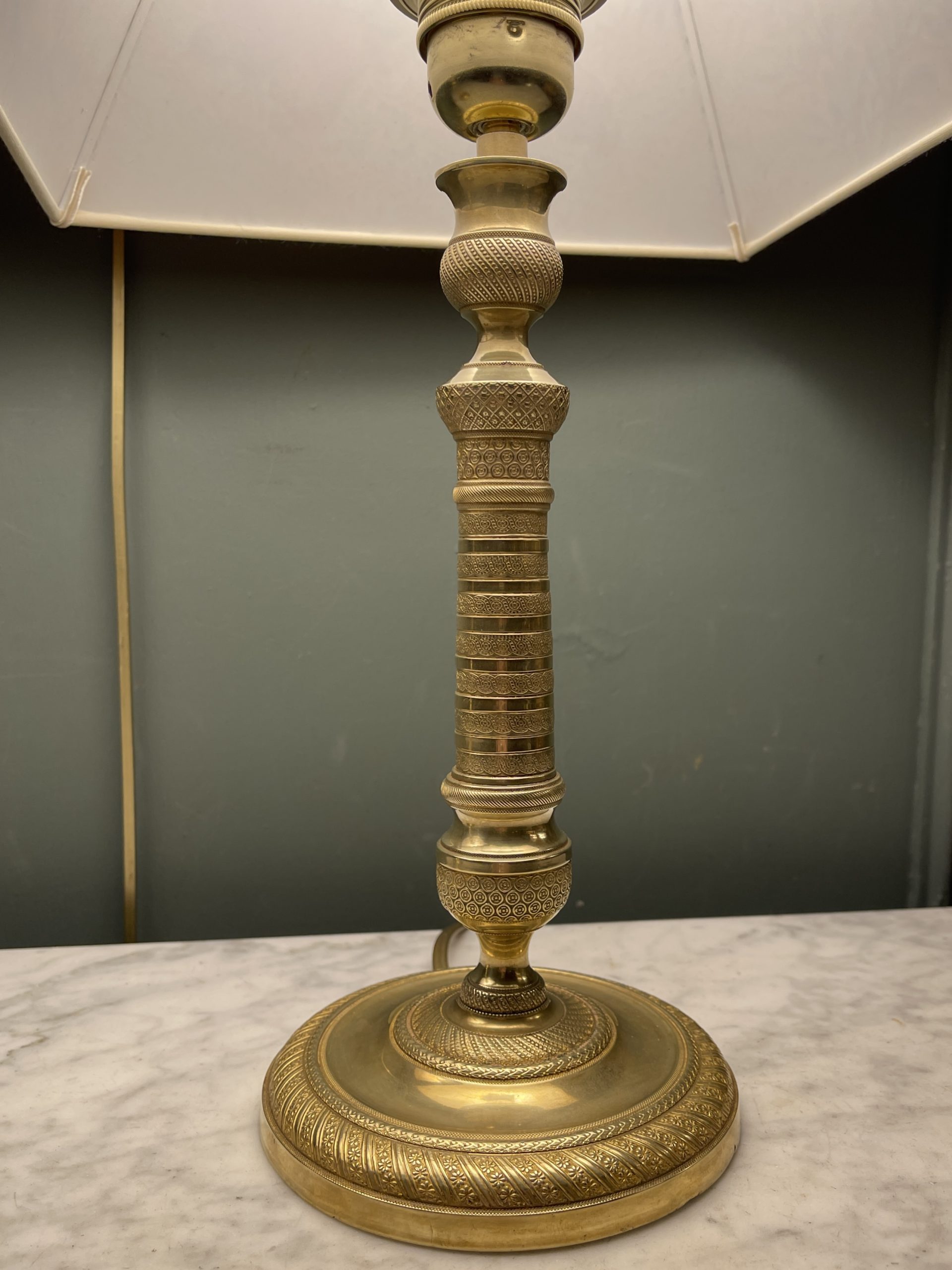 Paire de bougeoirs en bronze doré finement ciselé et guilloché époque Restauration montés en lampes.