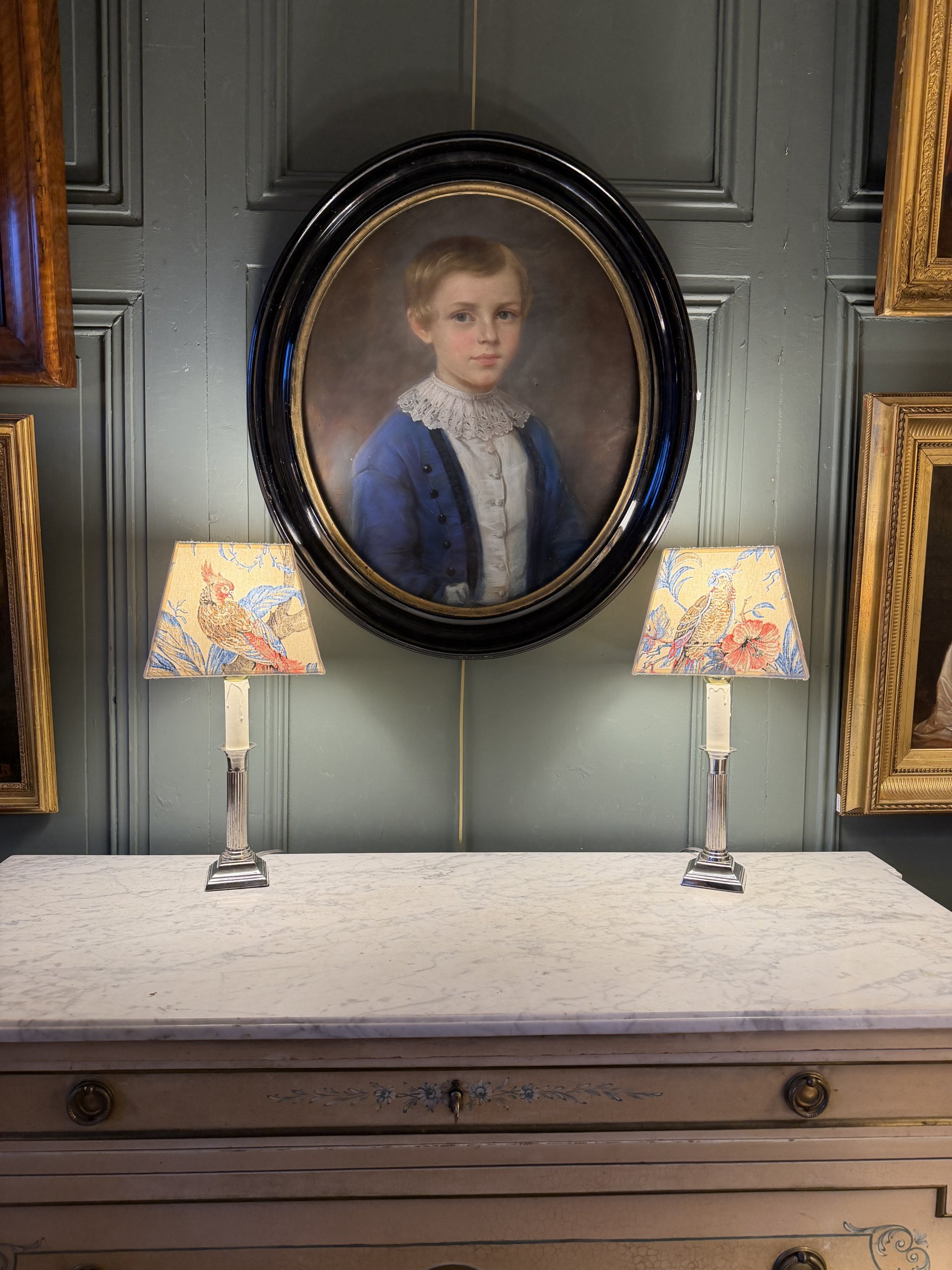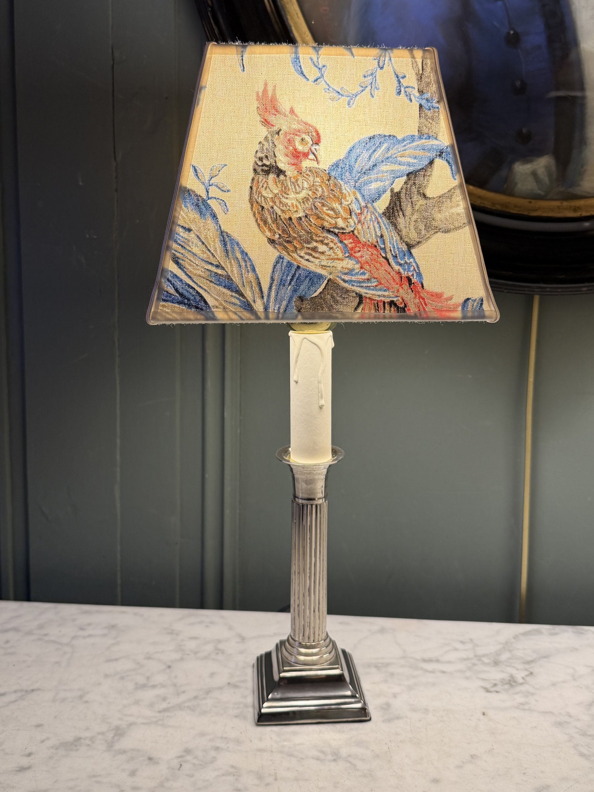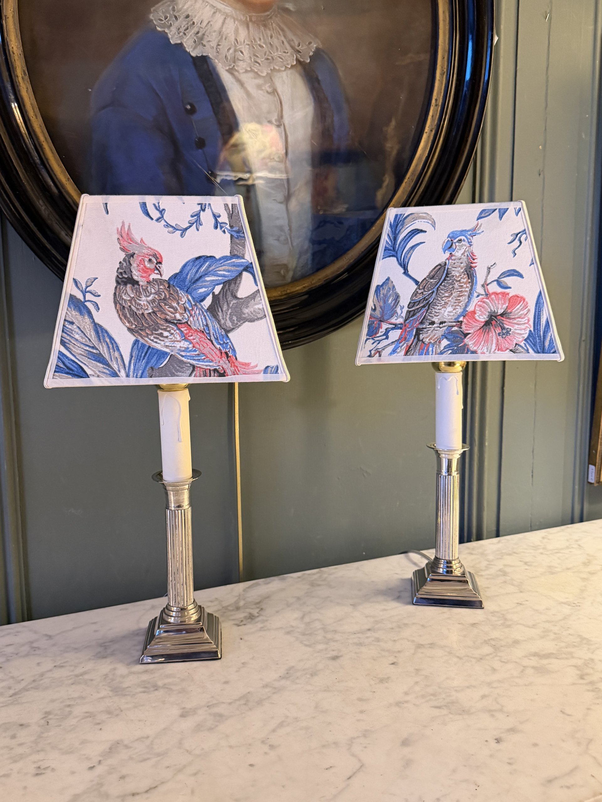Leur abat-jour de forme pagode  ont été créés à partir d’un tissu à décor d’oiseaux exotiques.