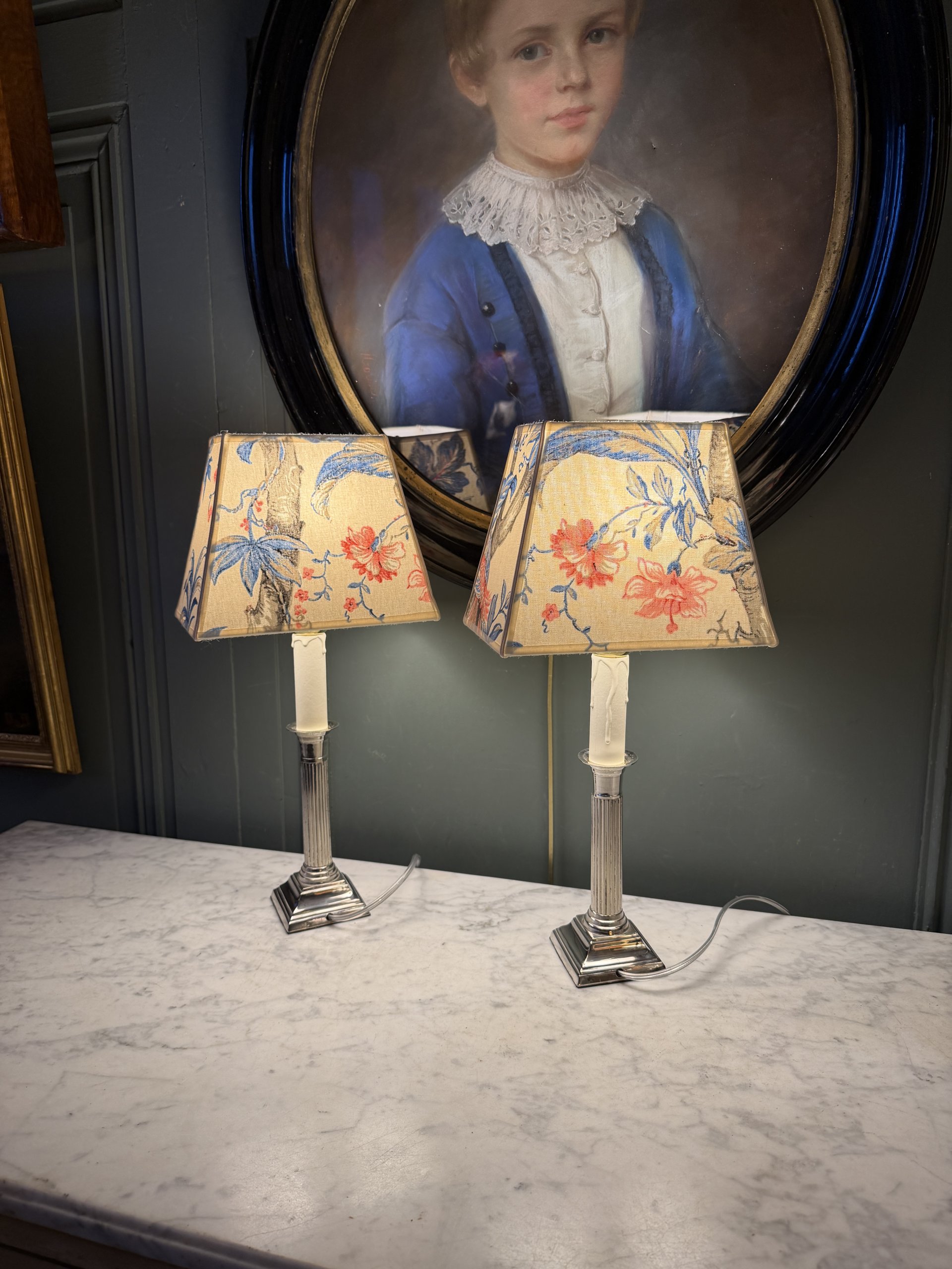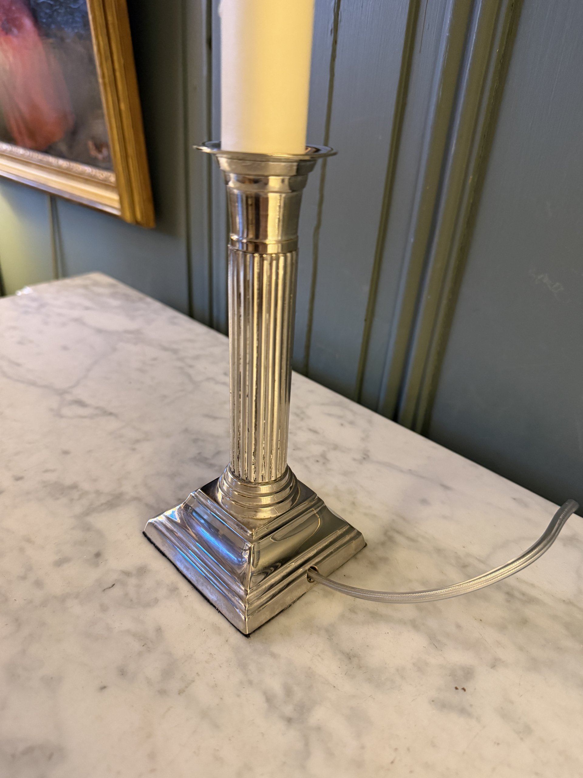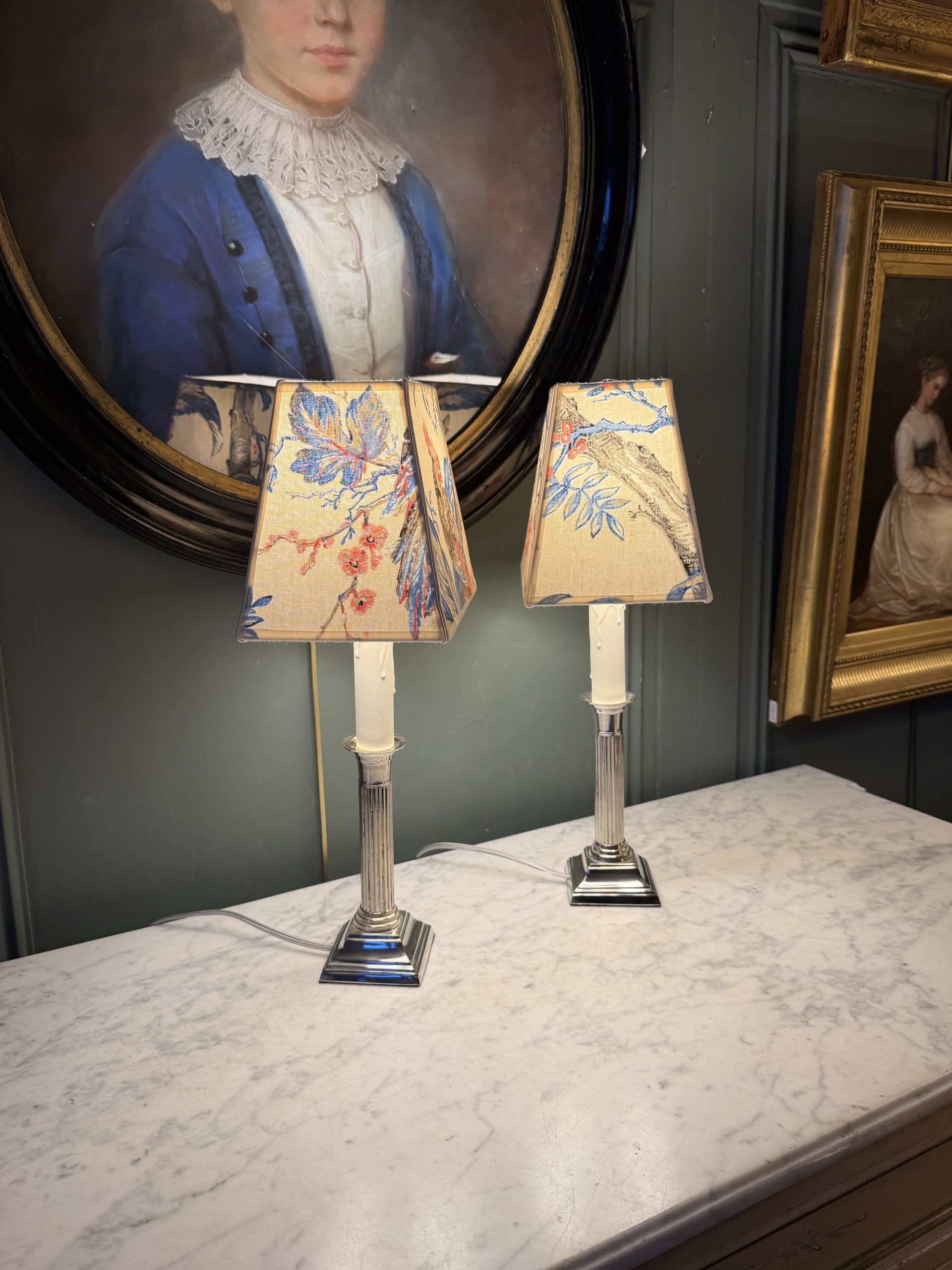 Paire de bougeoirs en métal argenté de style Louis XVI époque XXème montés en lampes.