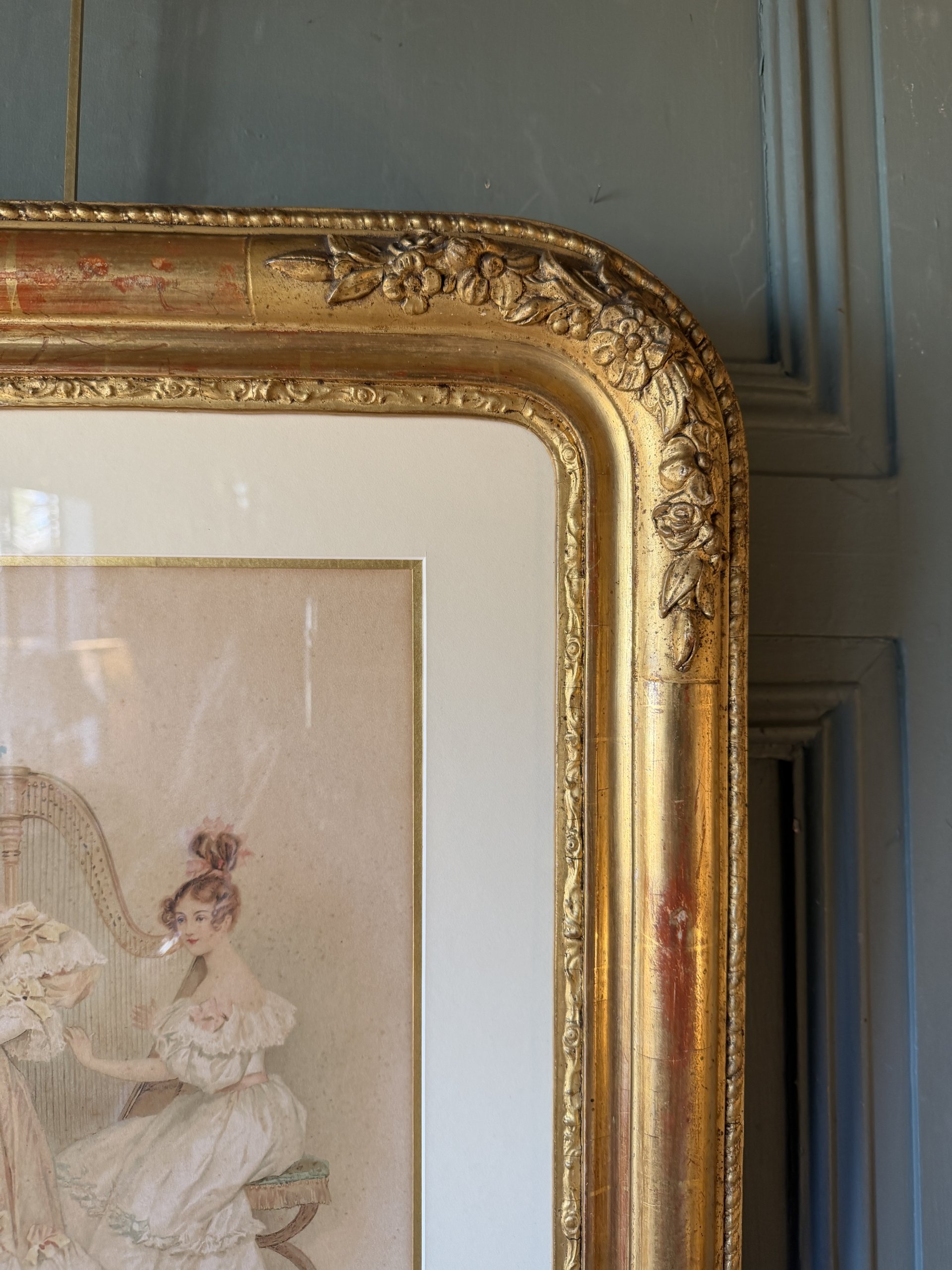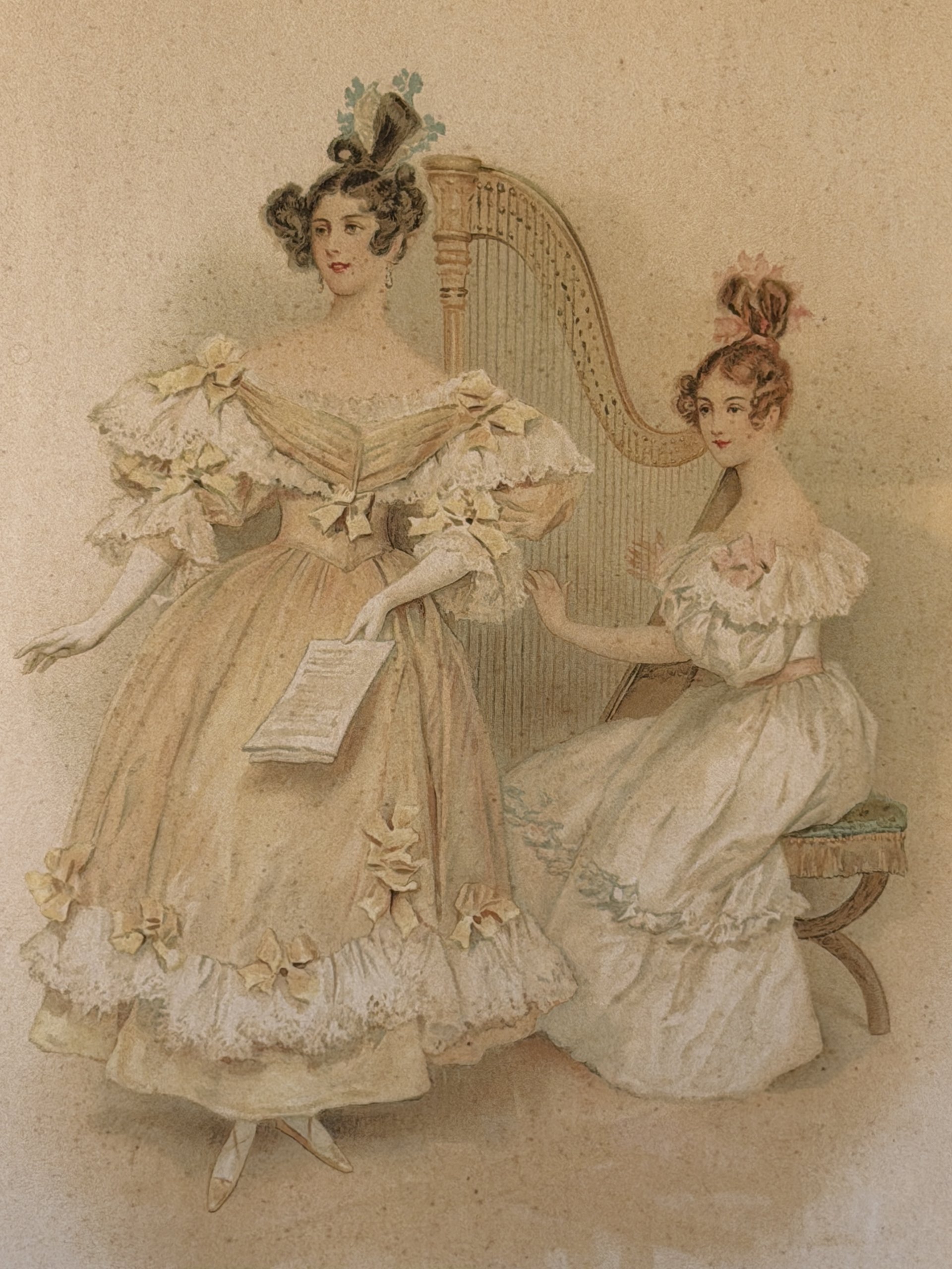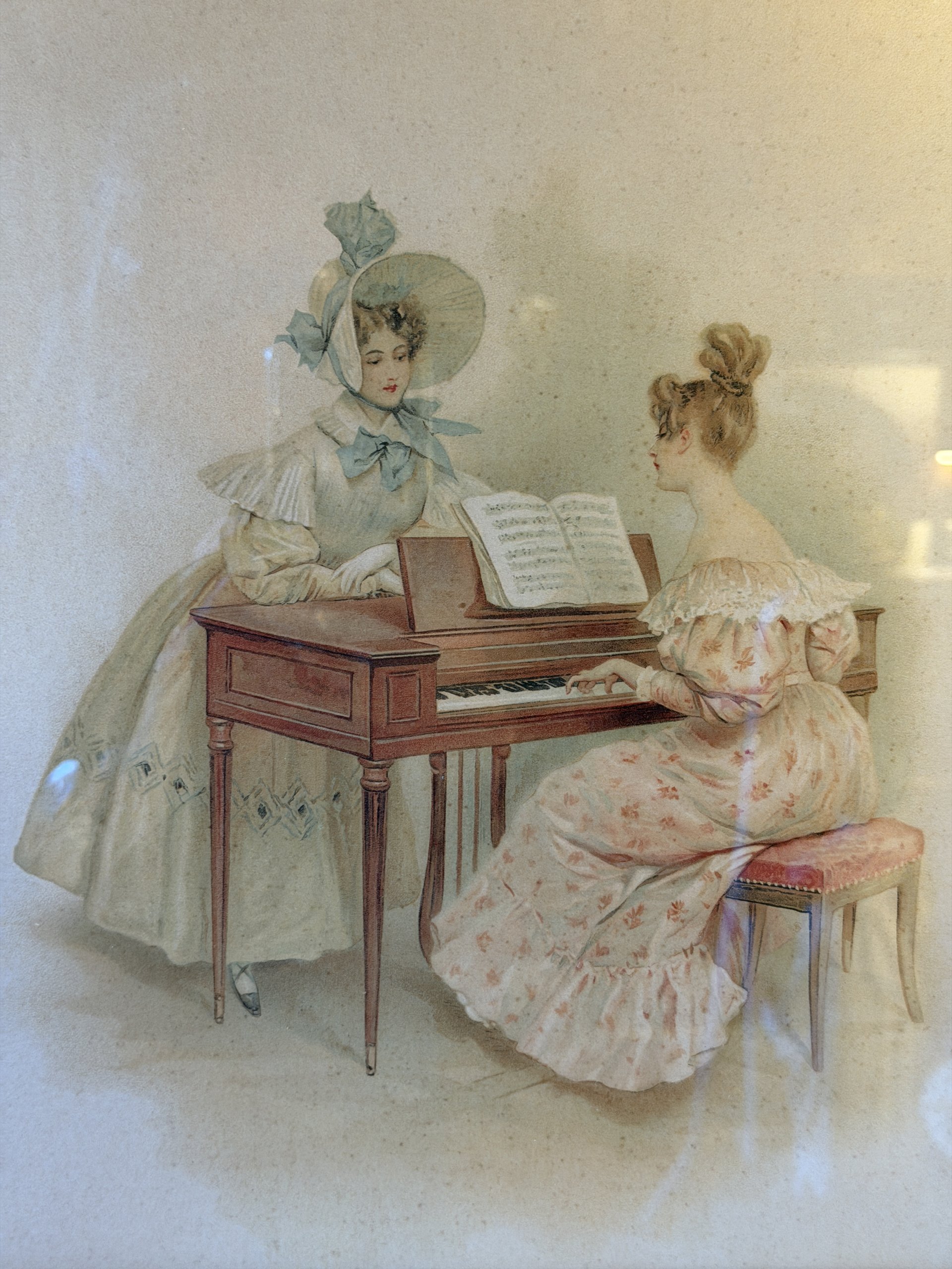 La leçon de Piano-forte et de Harpe, époque Restauration (vers 1830).