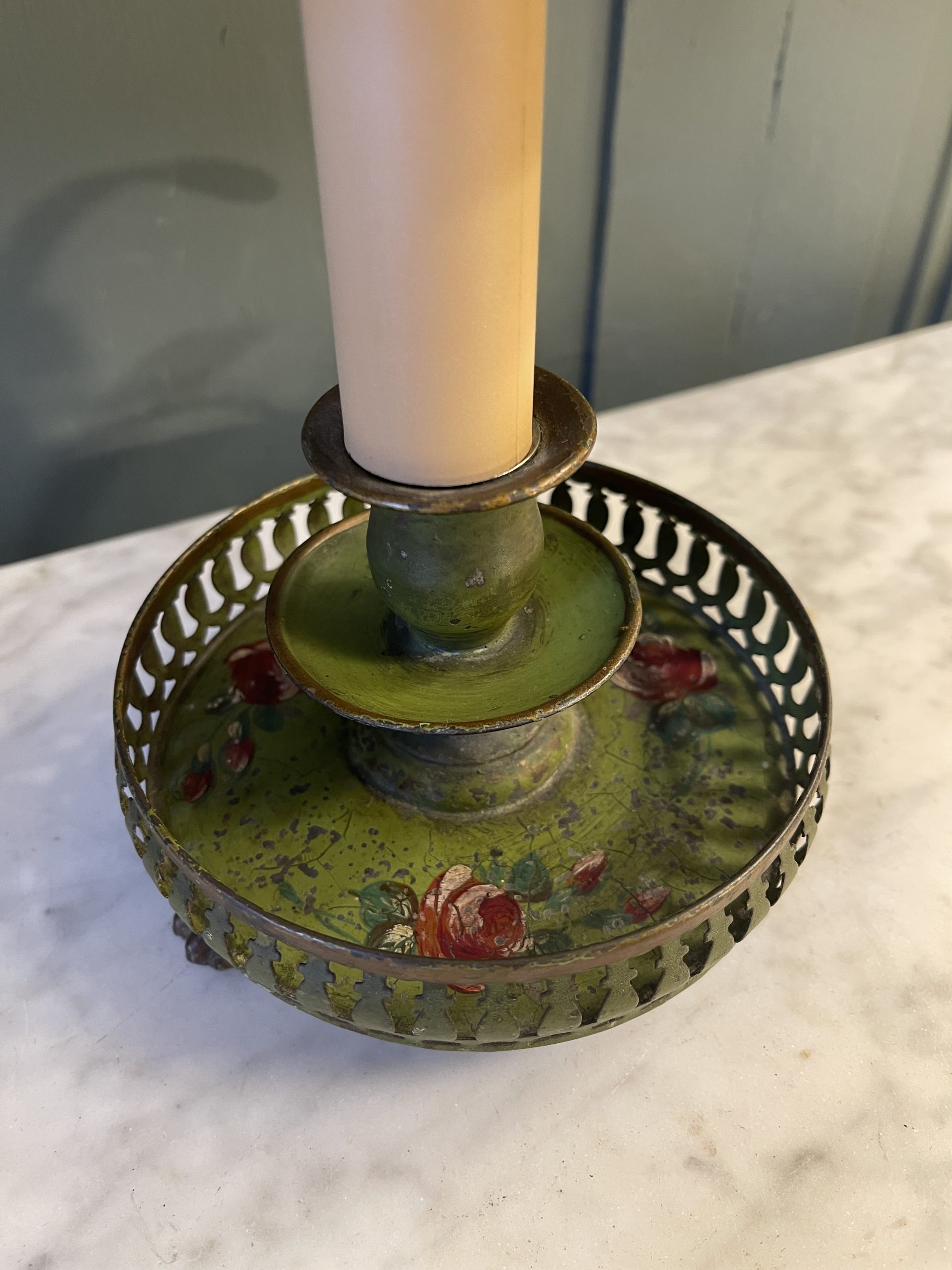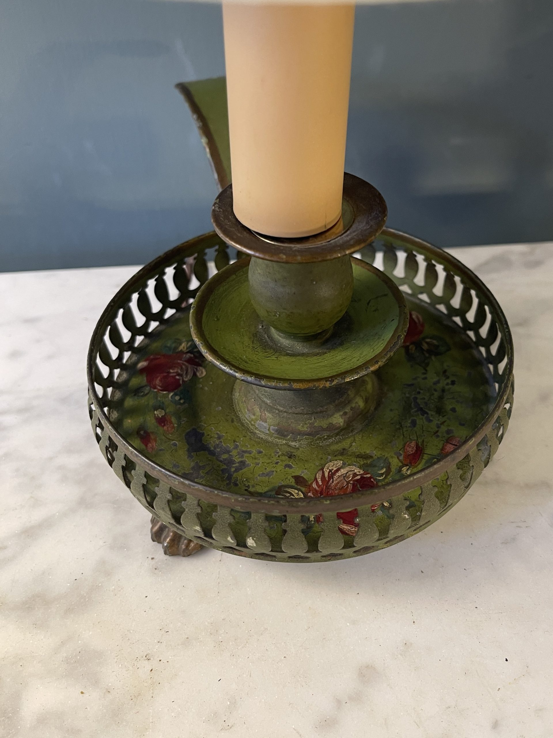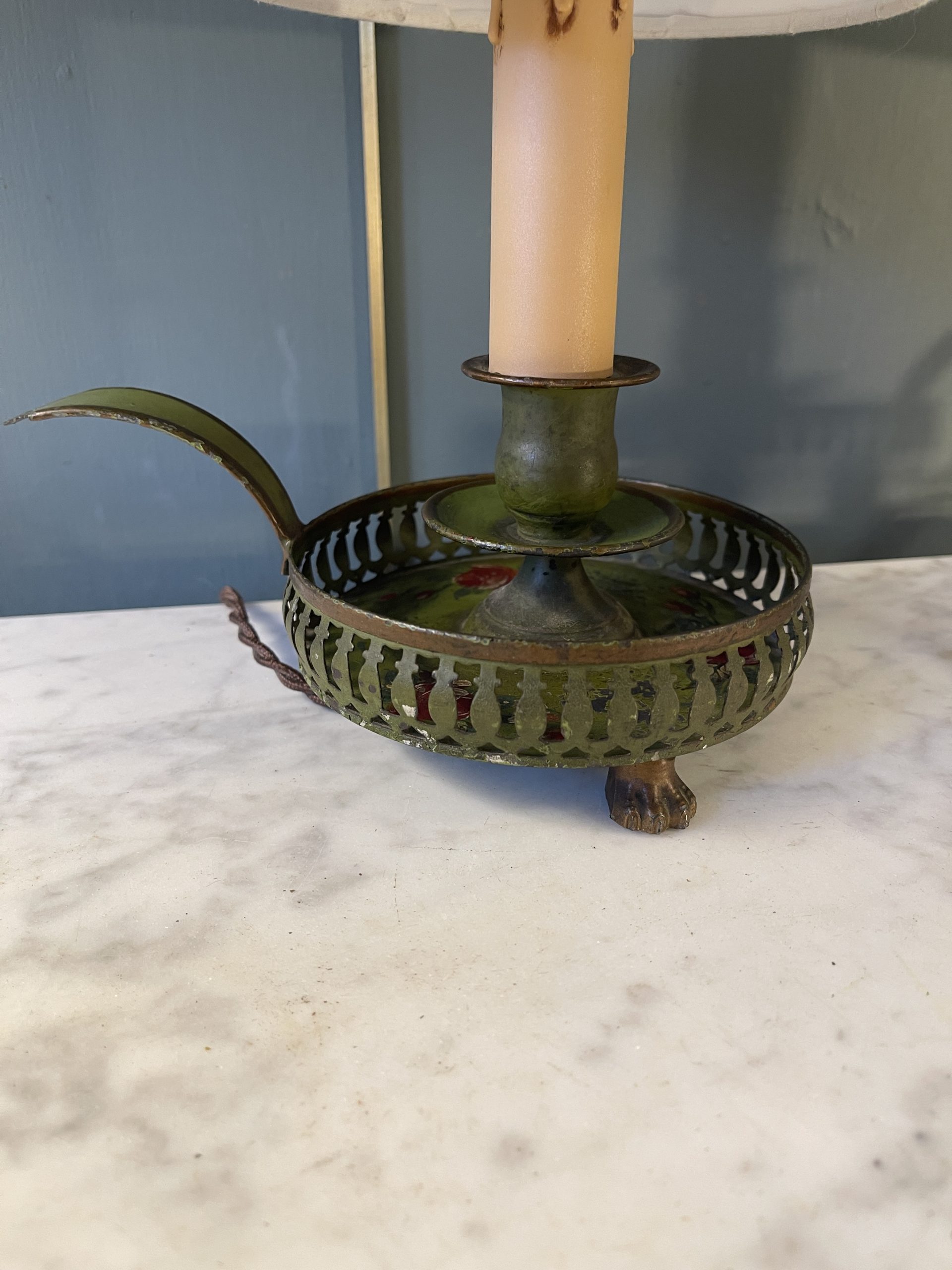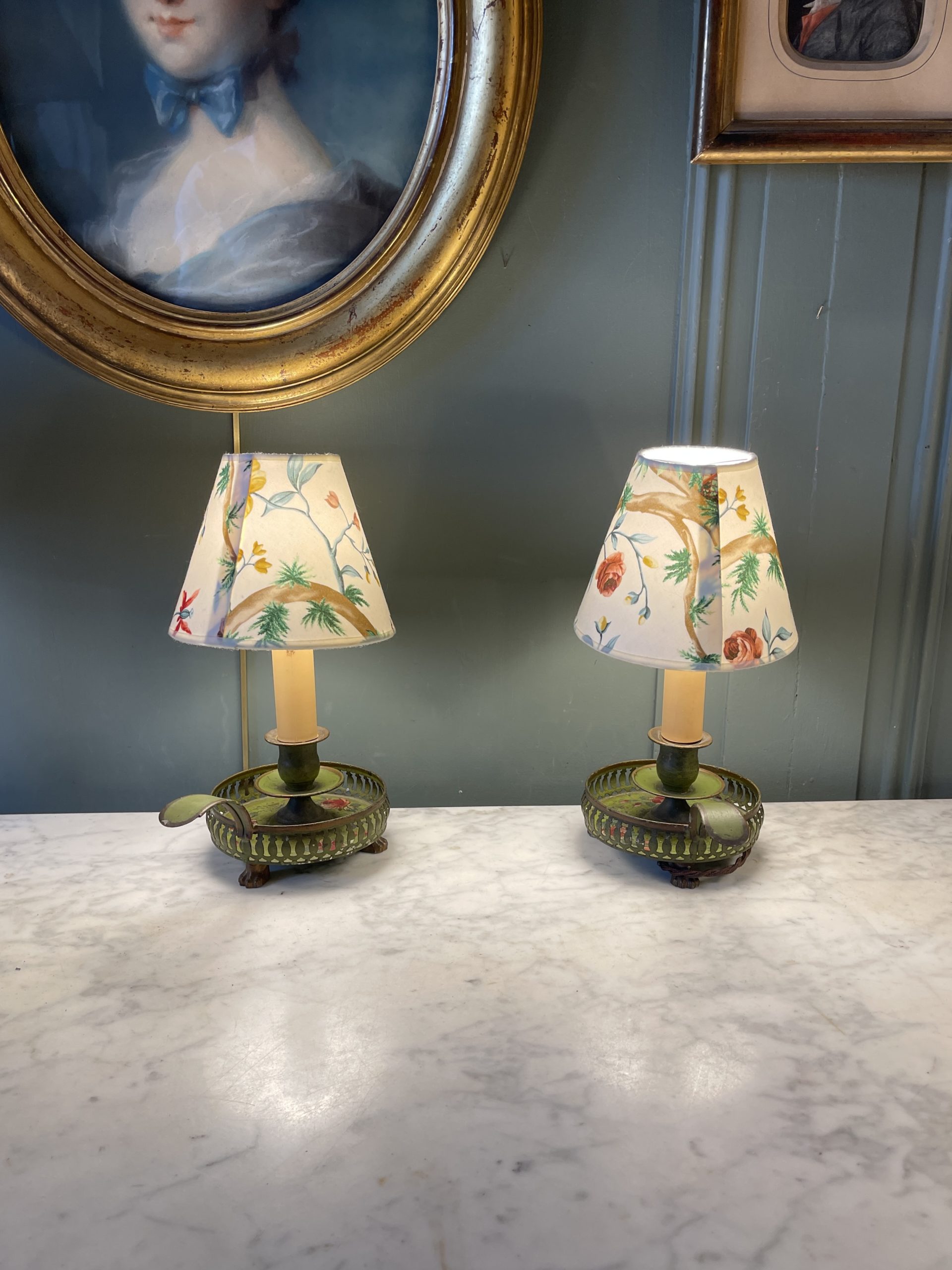 Paire de petits bougeoirs à main en tôle peinte à décor floral sur fond vert fin XIXème époque Napoléon III reposant sur trois pieds léonins montés en lampes.