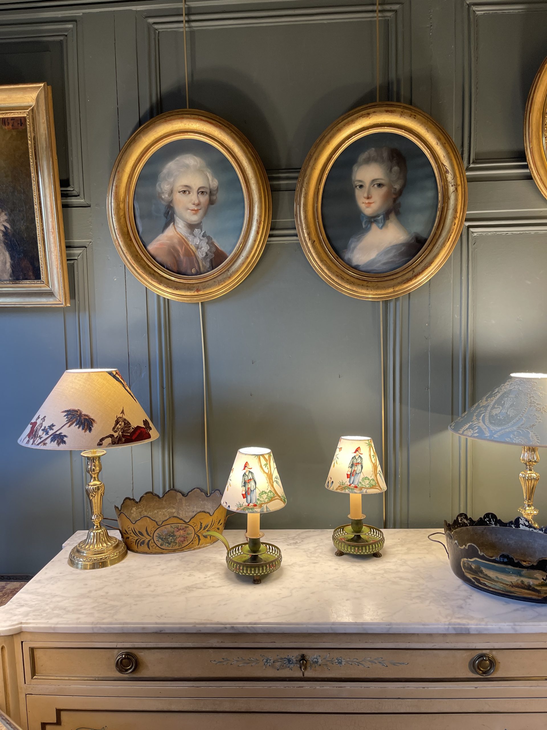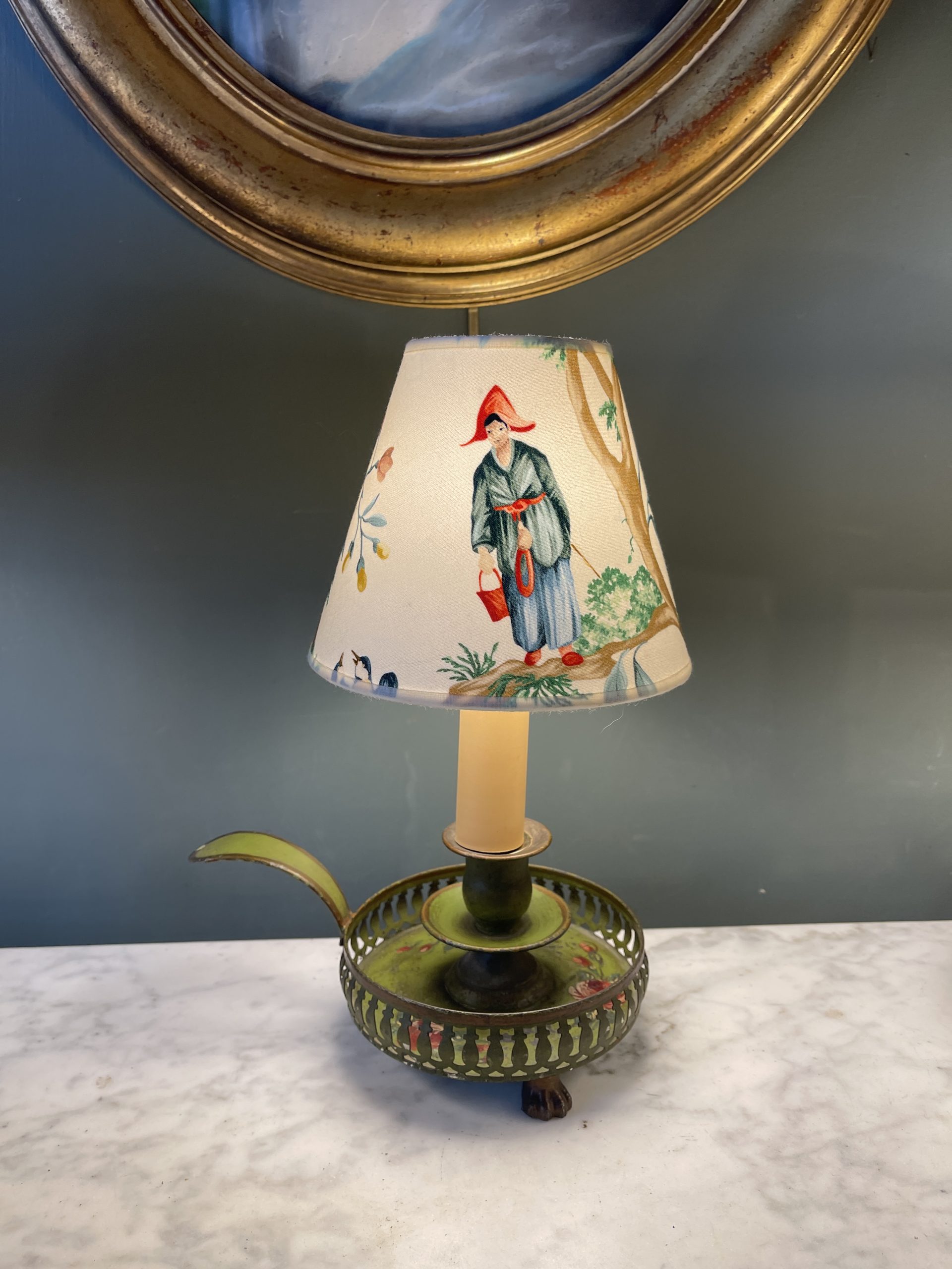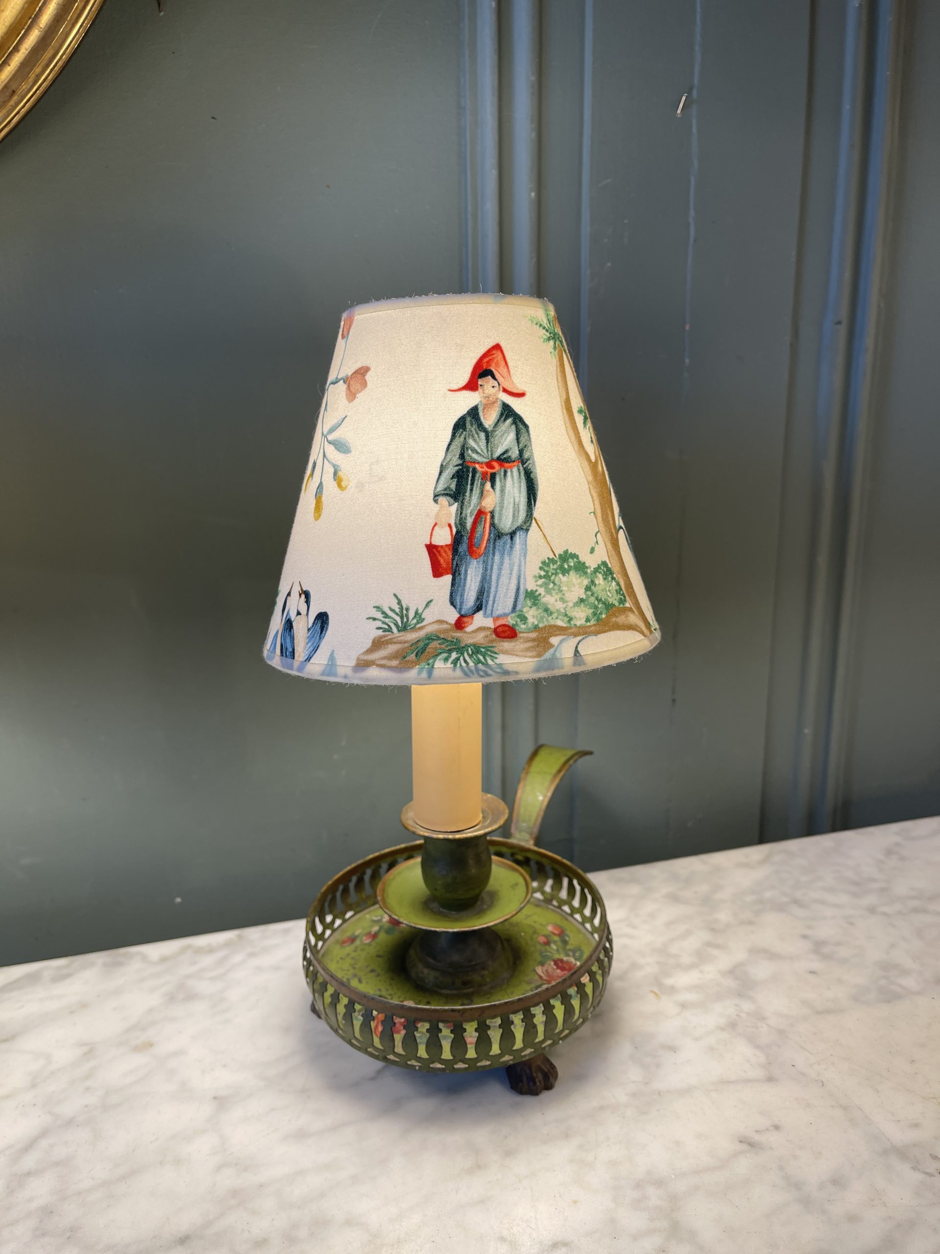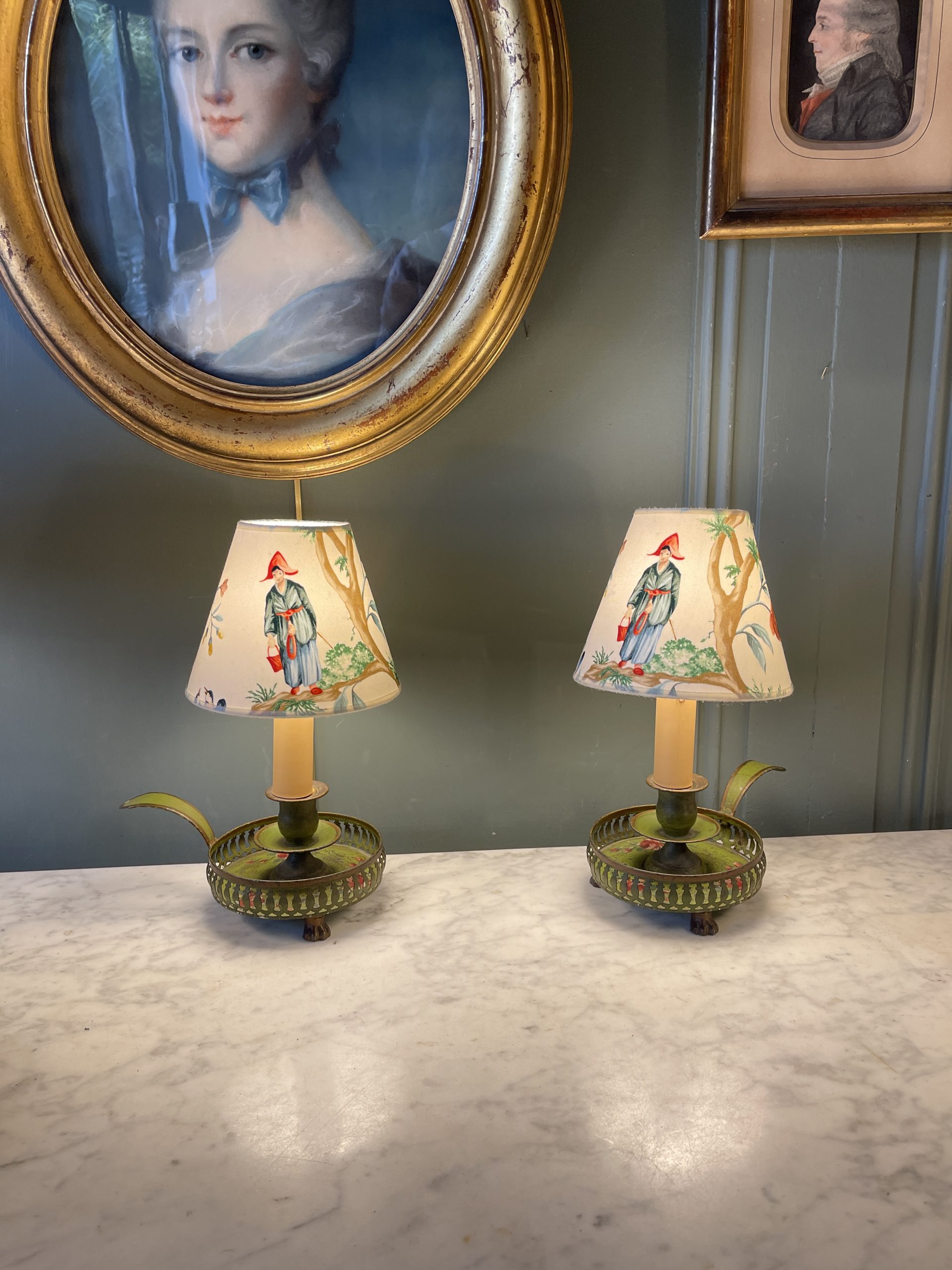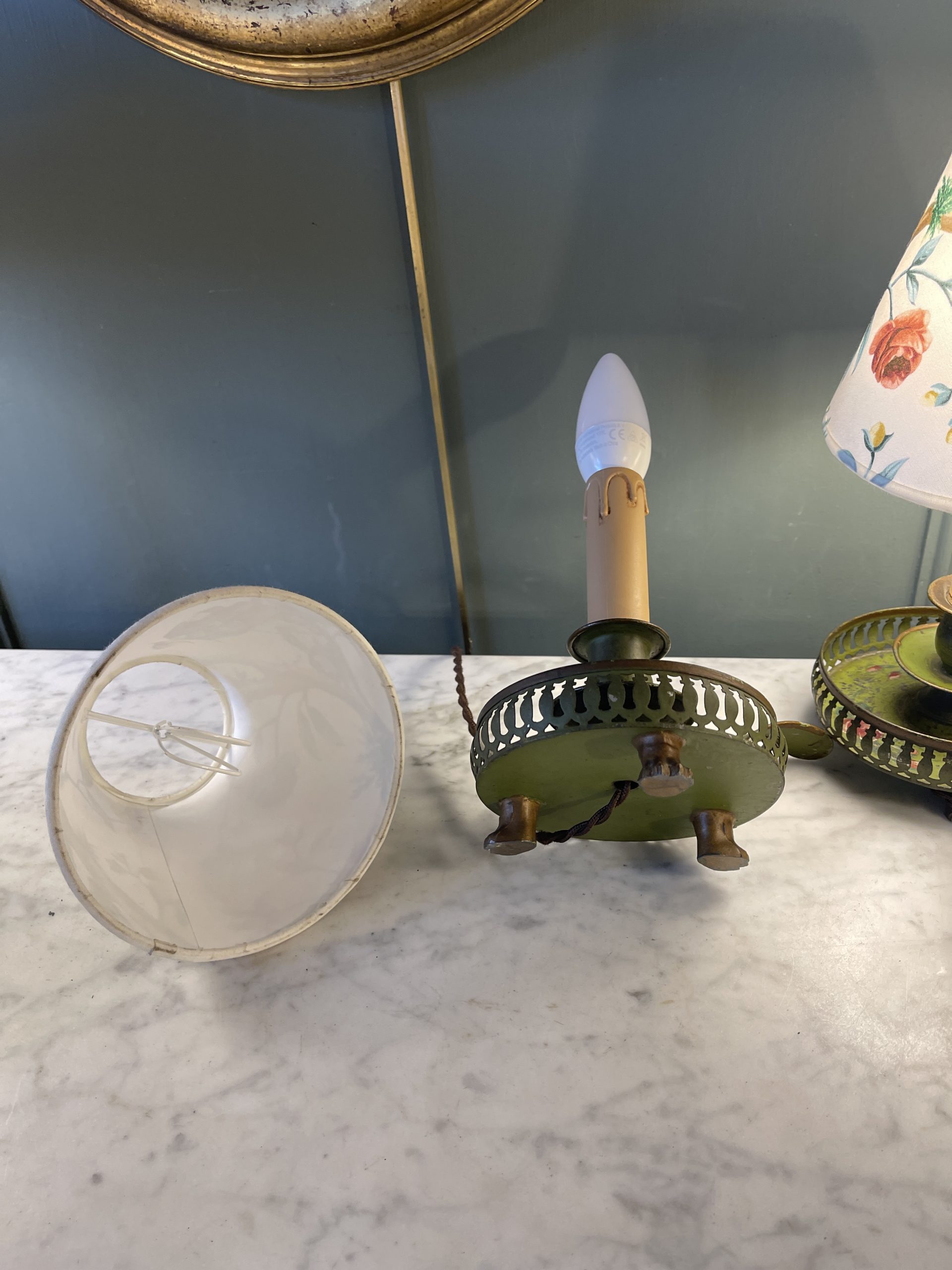 Paire de petits bougeoirs à main en tôle peinte à décor floral sur fond vert fin XIXème époque Napoléon III reposant sur trois pieds léonins montés en lampes.