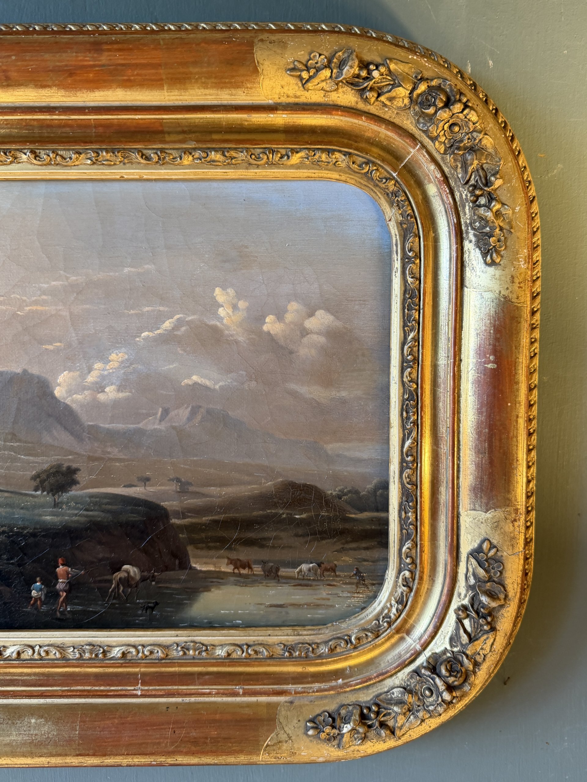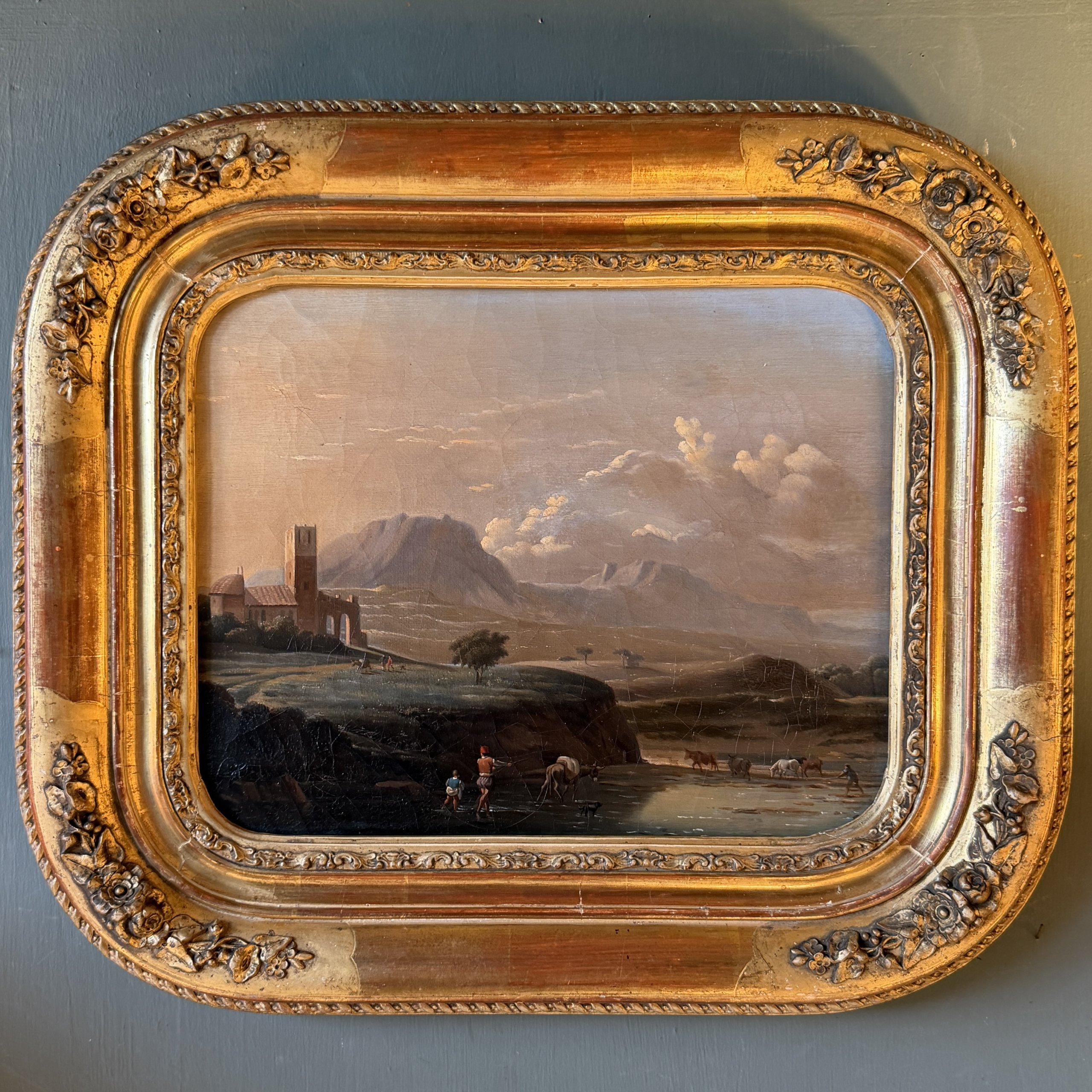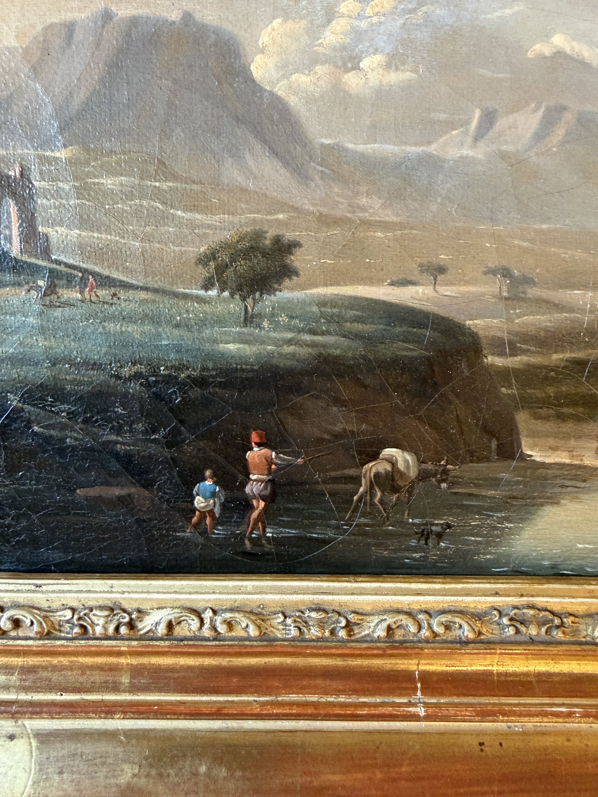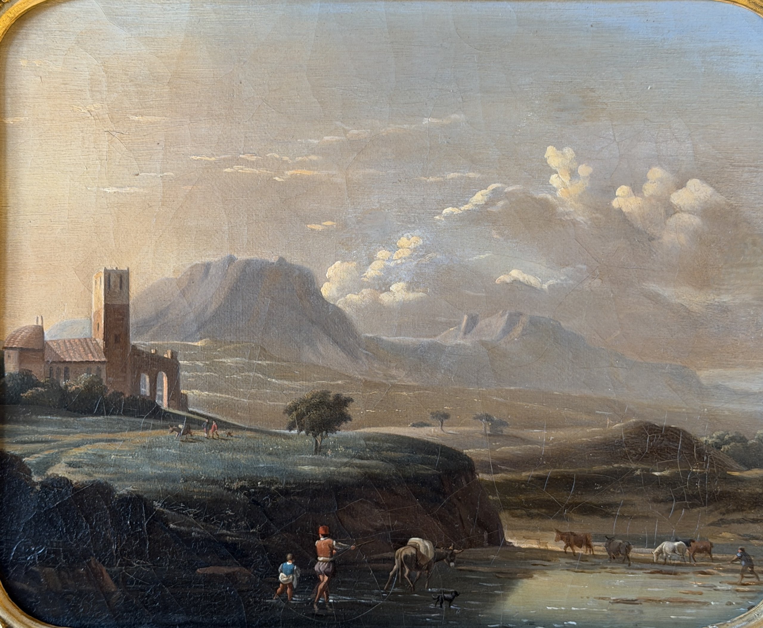 Paysage italien animé de personnages et d’animaux se trouvant auprès d’un cours d’eau.