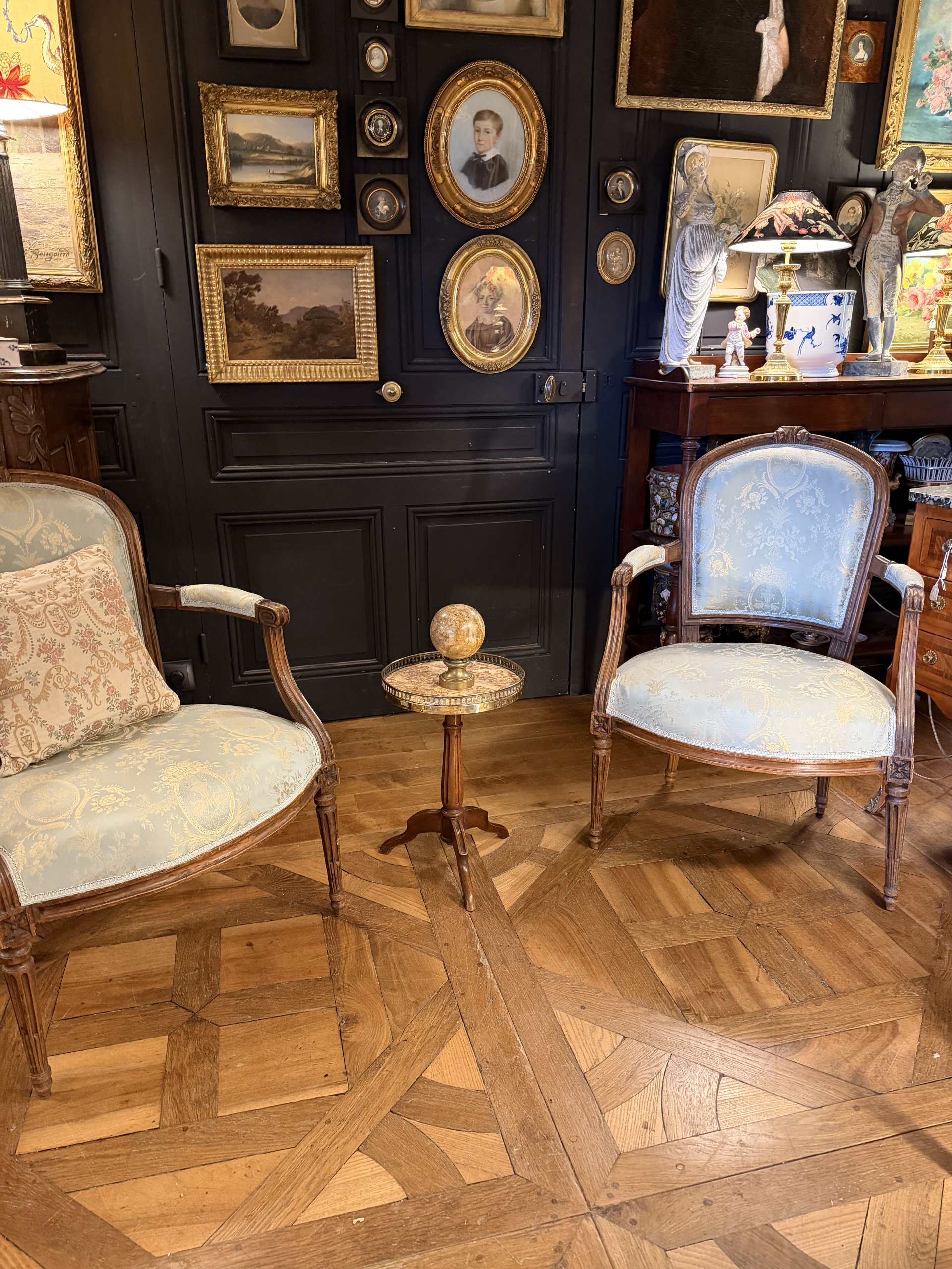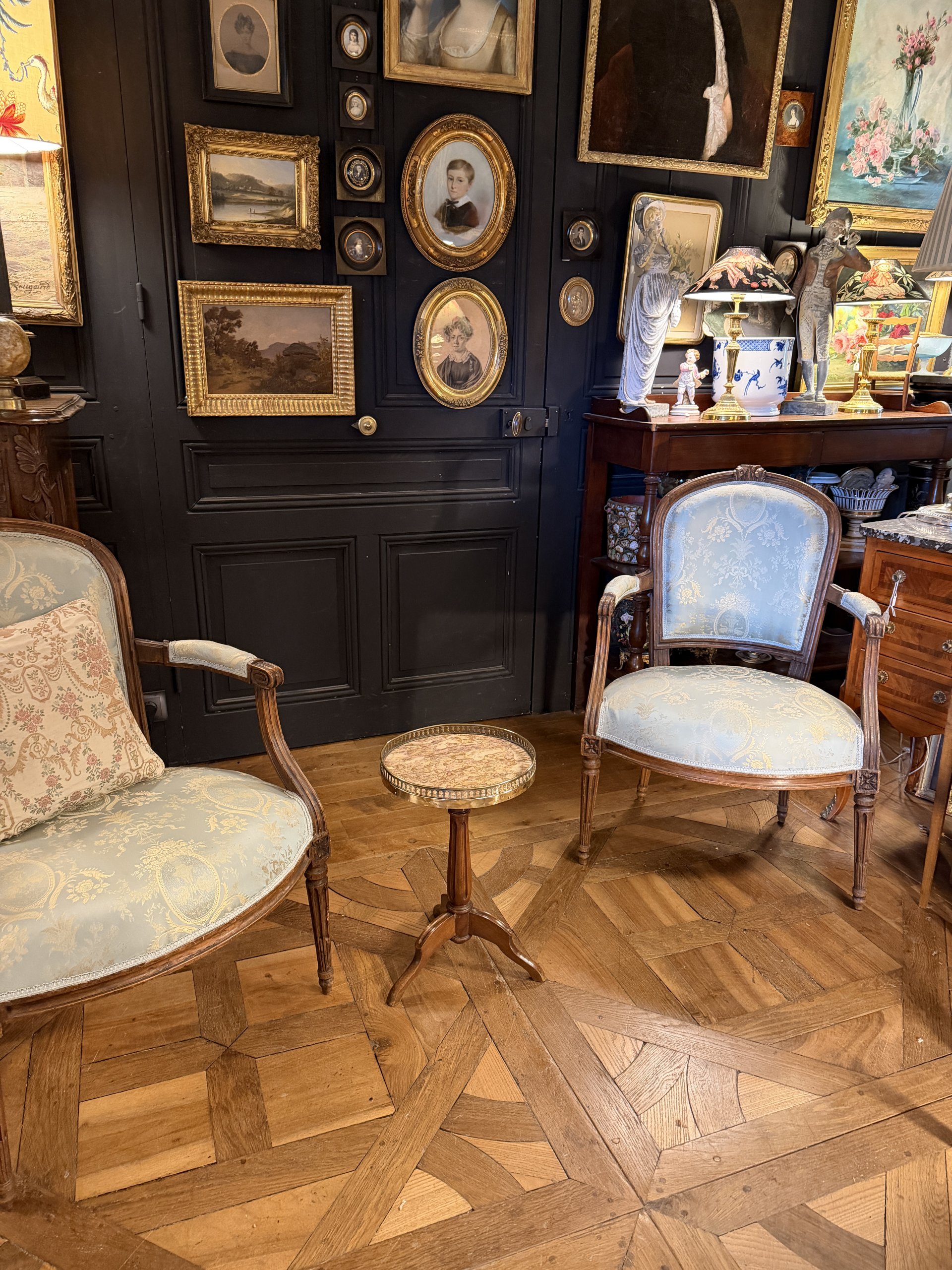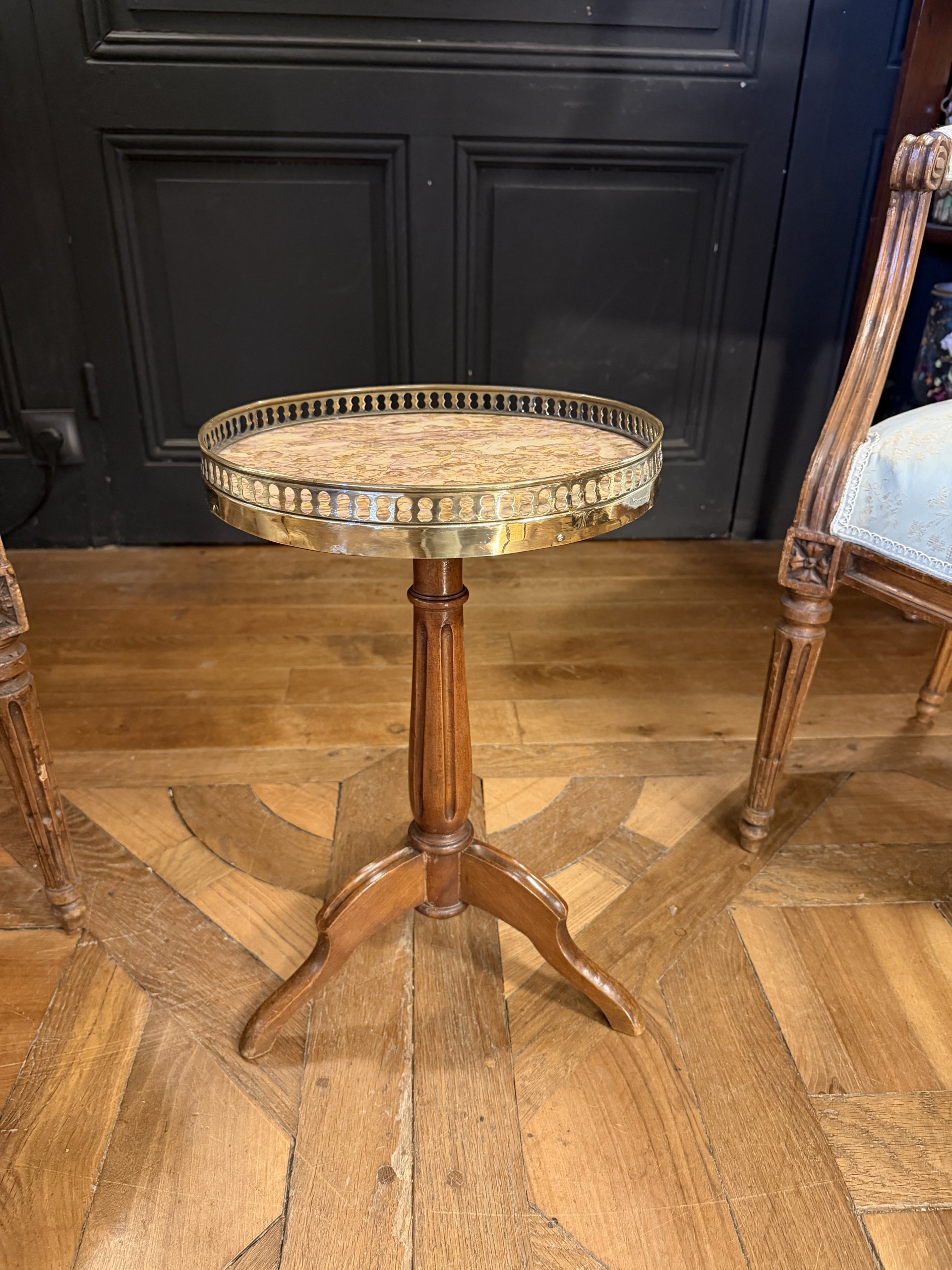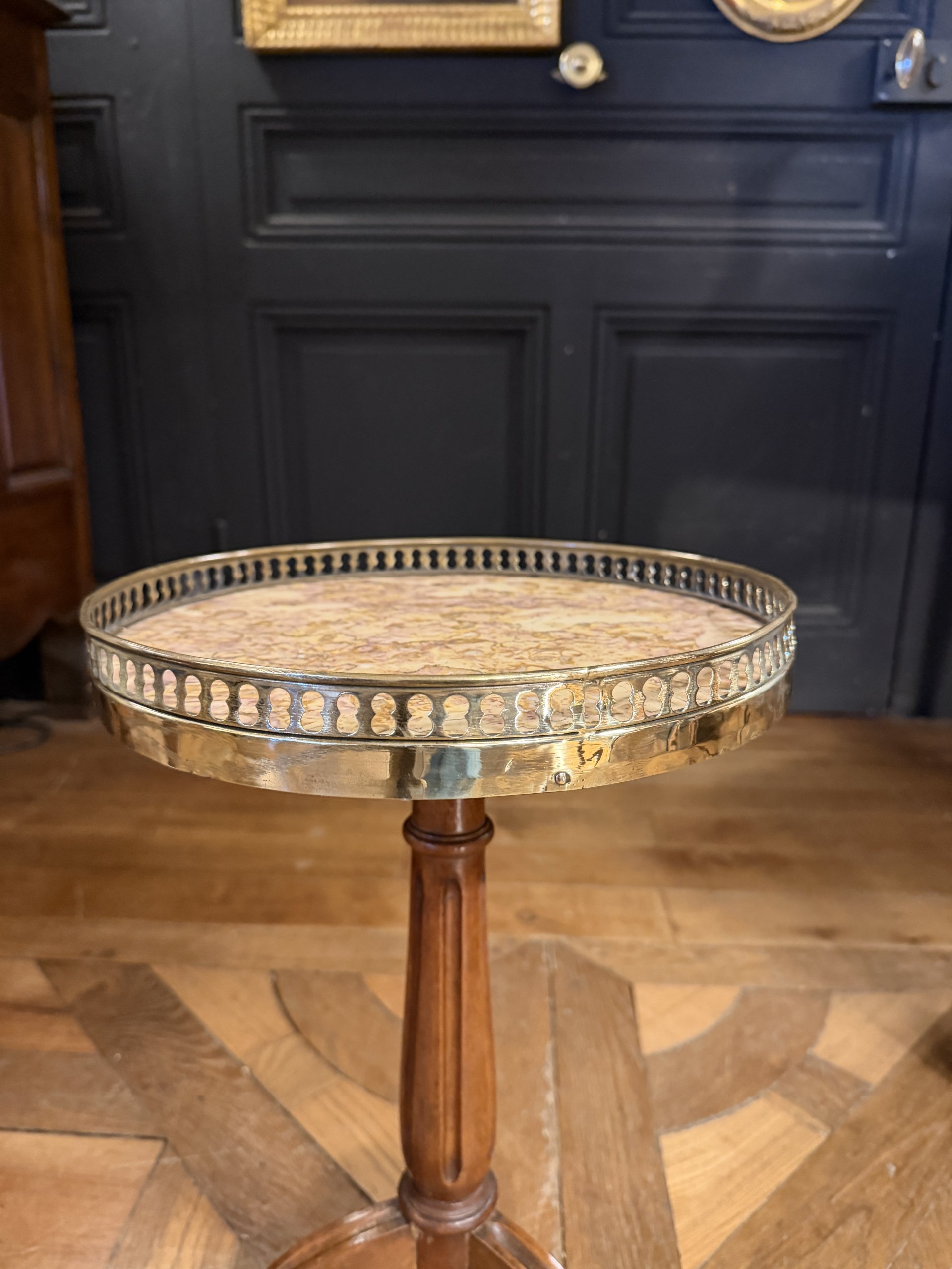 Son plateau est en marbre cerclé d’une galerie en laiton ajouré.
