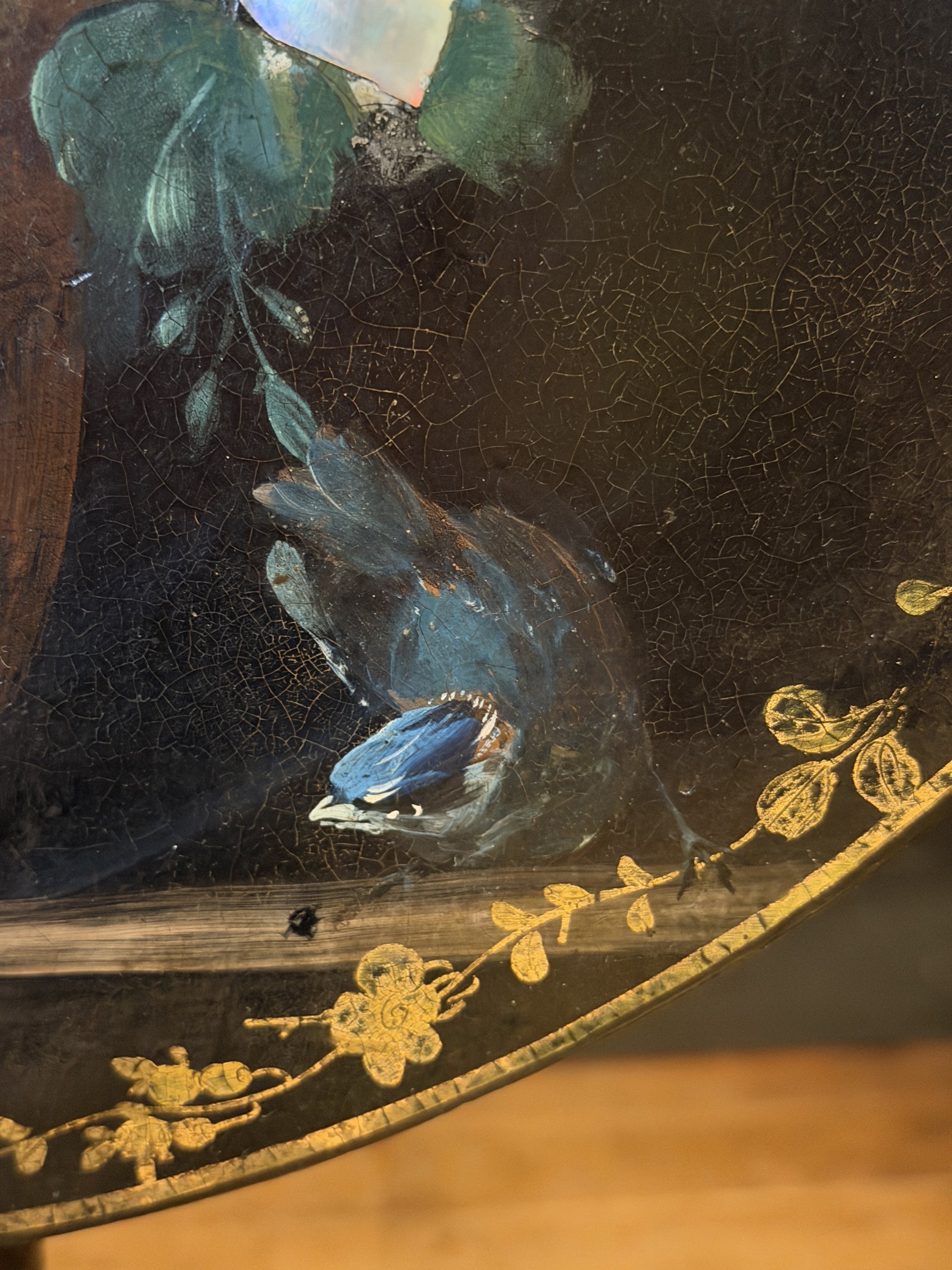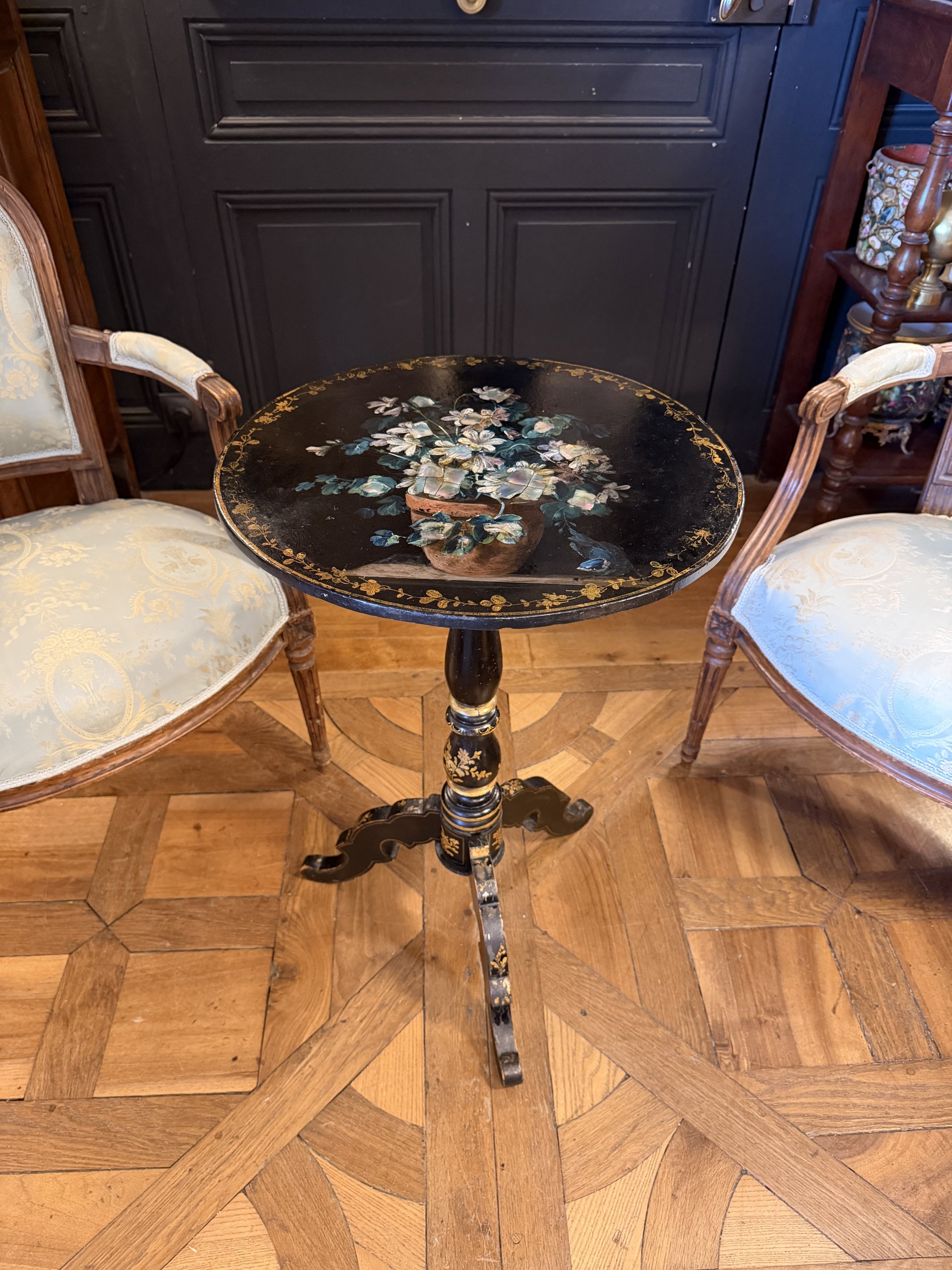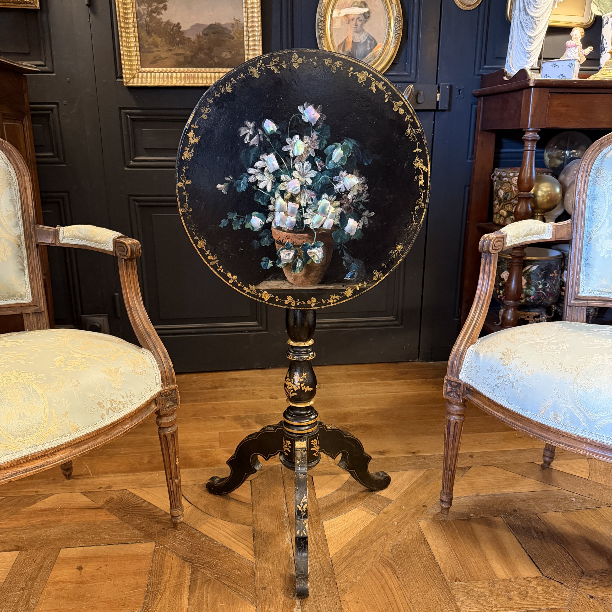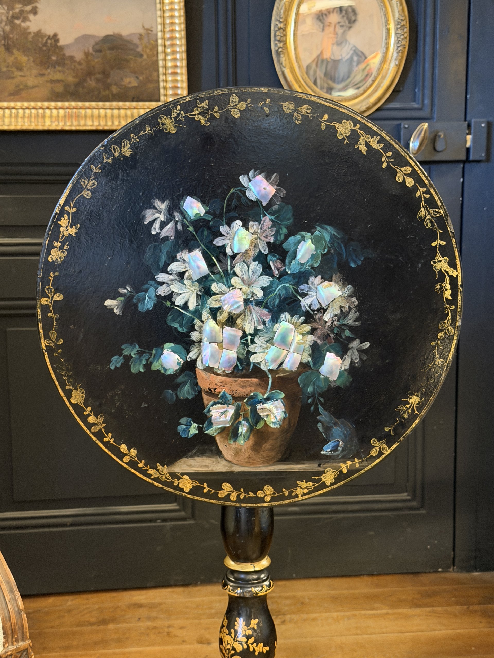 Petit guéridon tripode à bascule XIXème Napoléon III à décor d’un bouquet de fleurs dans un pot en terre cuite et d’un oiseau peint sur fond noir burgauté de nacre entouré d’une frise dorée à décor floral.