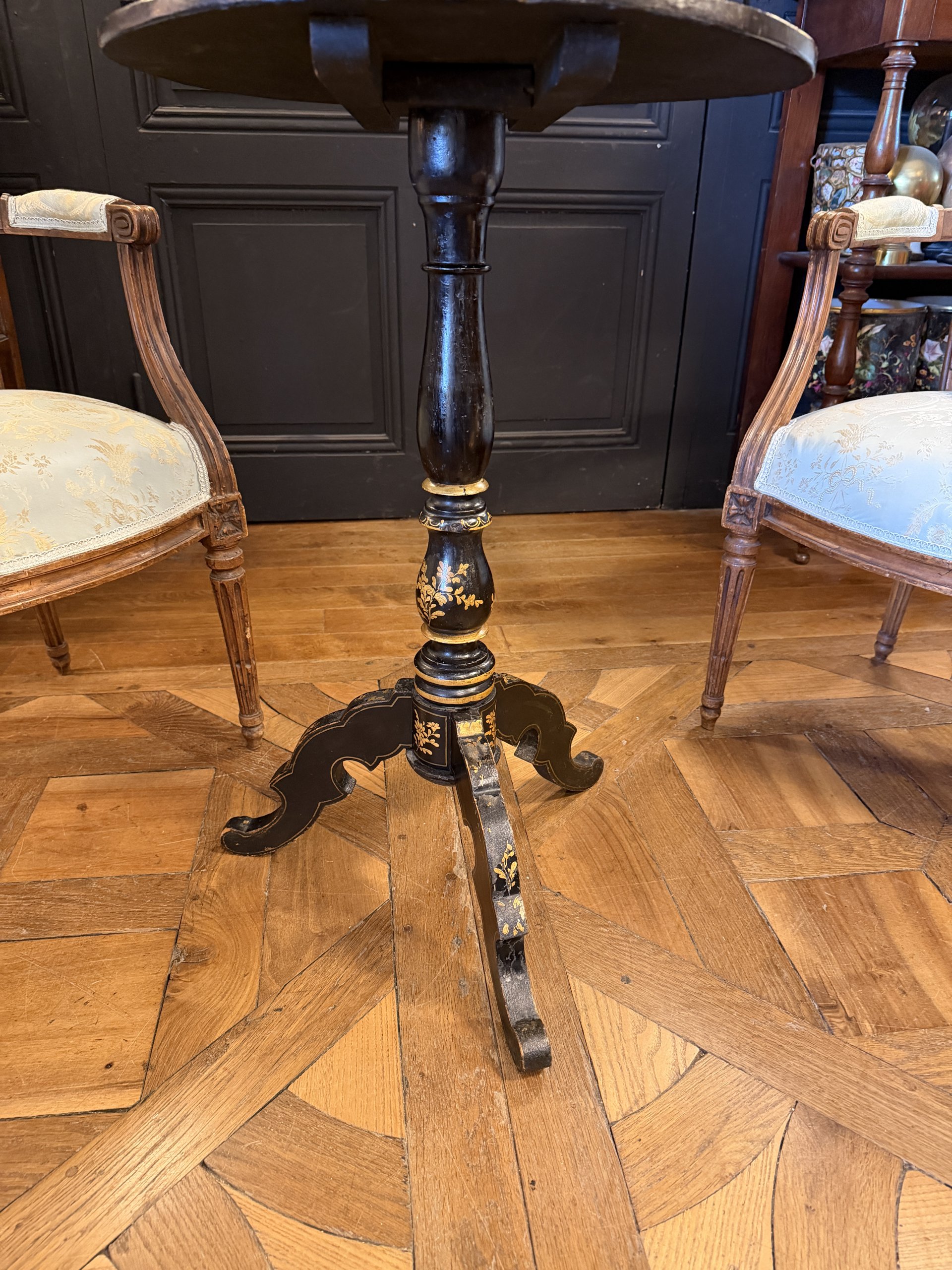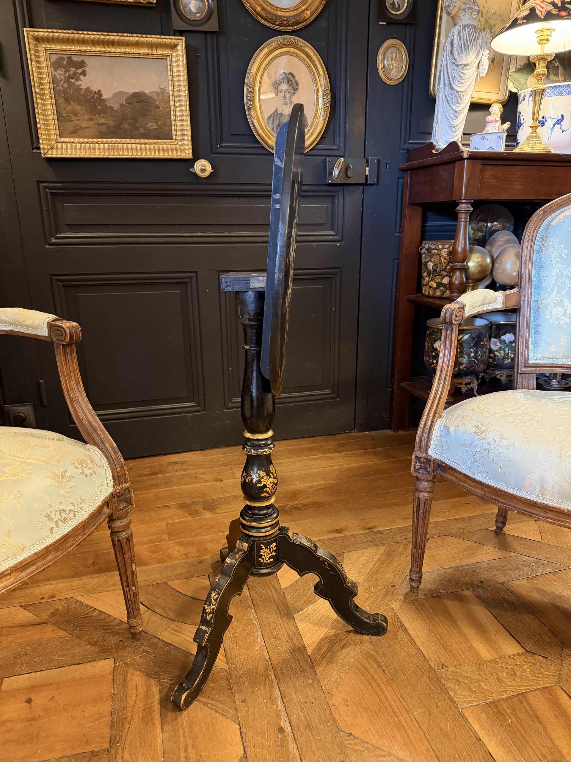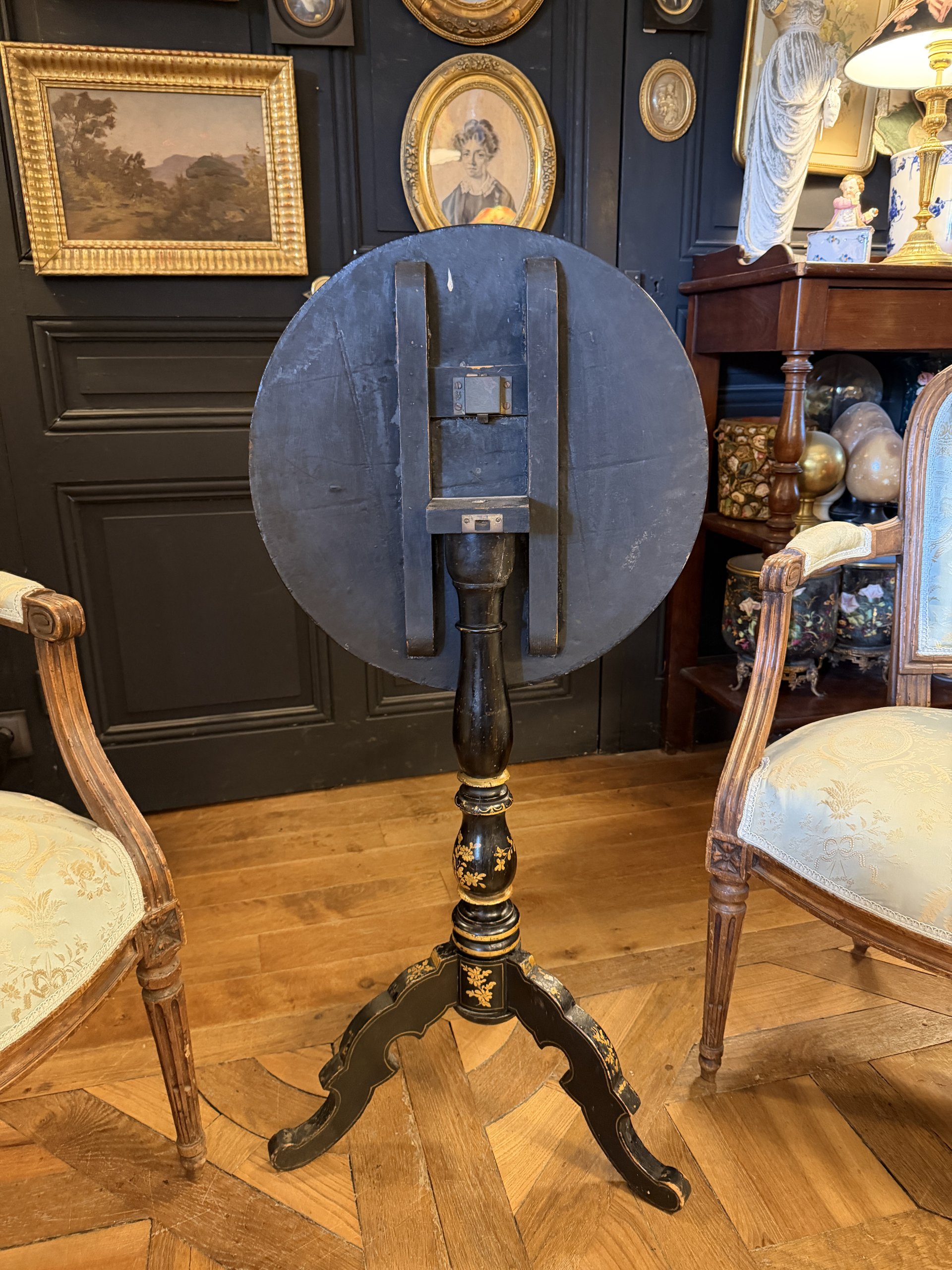 Petit guéridon tripode à bascule XIXème Napoléon III à décor d’un bouquet de fleurs dans un pot en terre cuite et d’un oiseau peint sur fond noir burgauté de nacre entouré d’une frise dorée à décor floral.