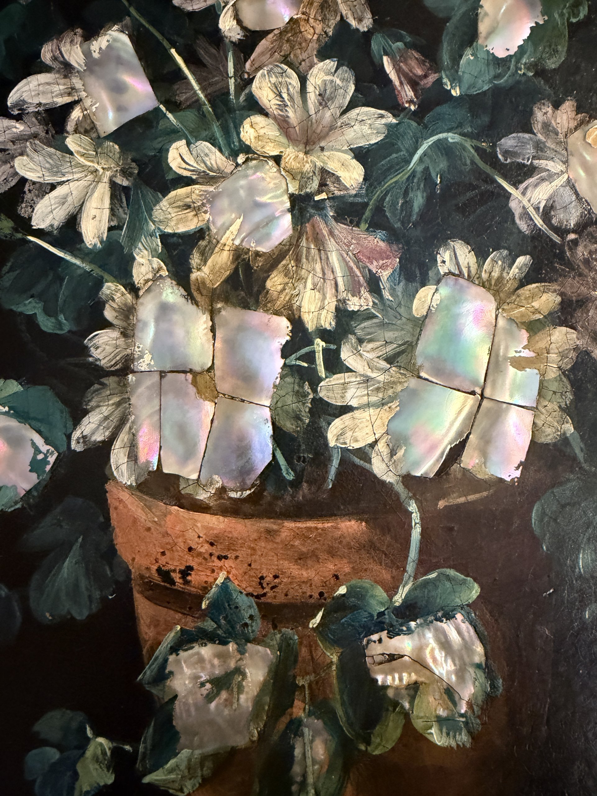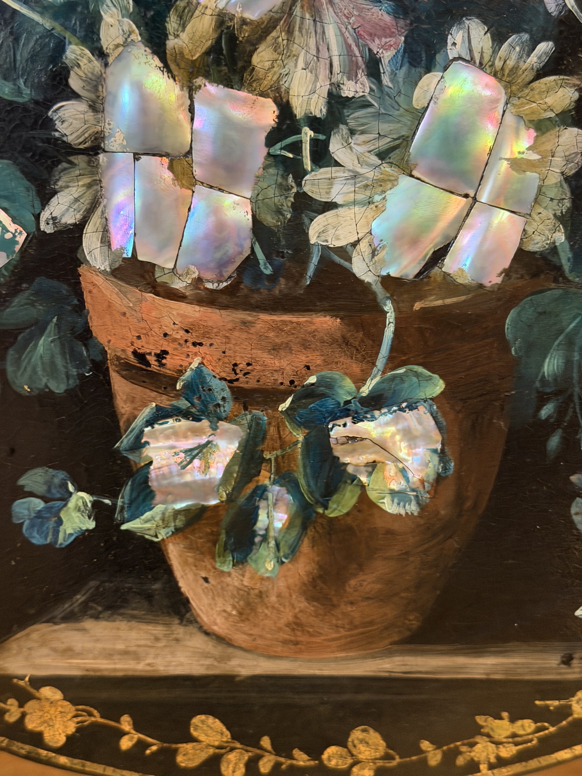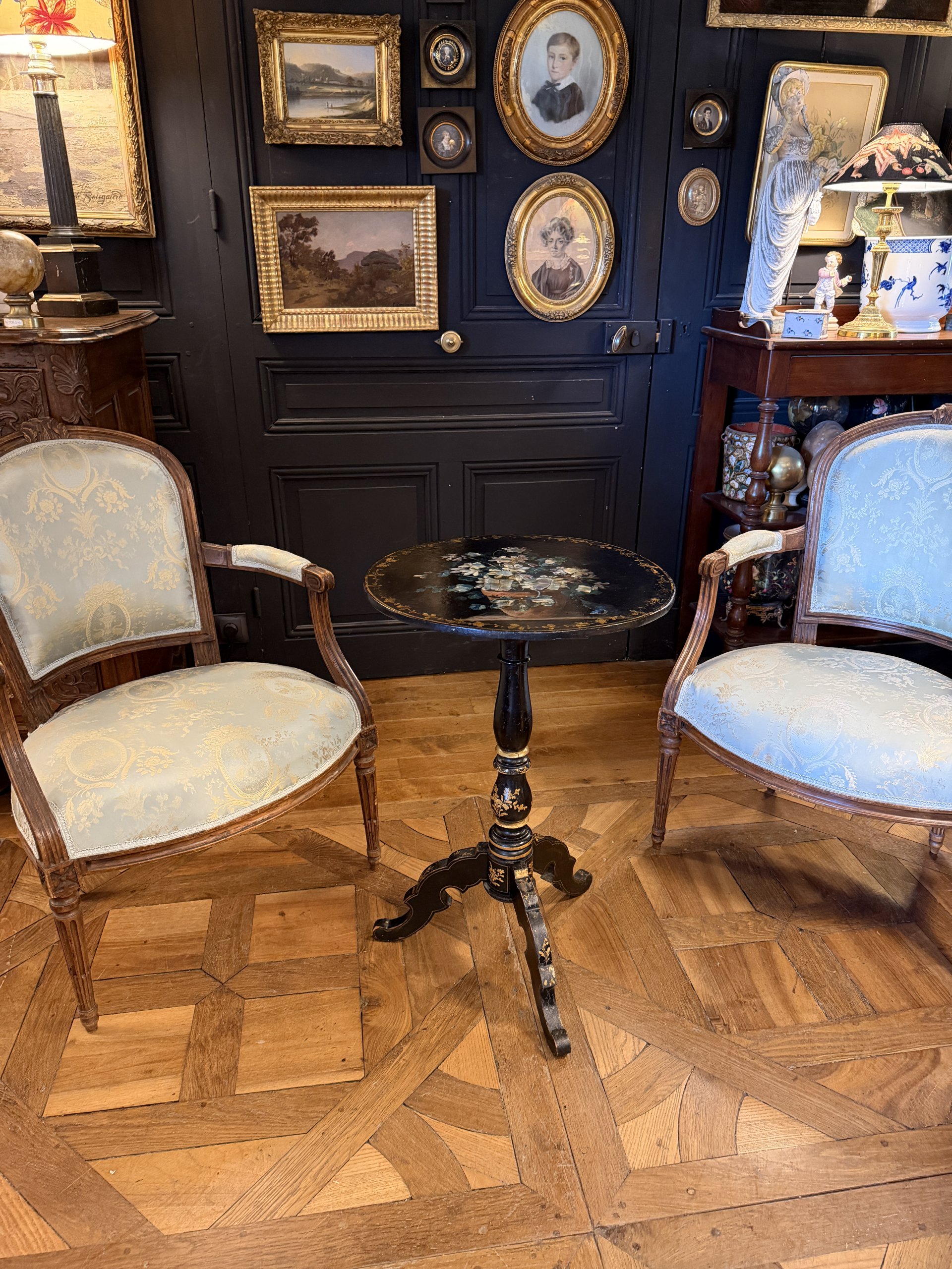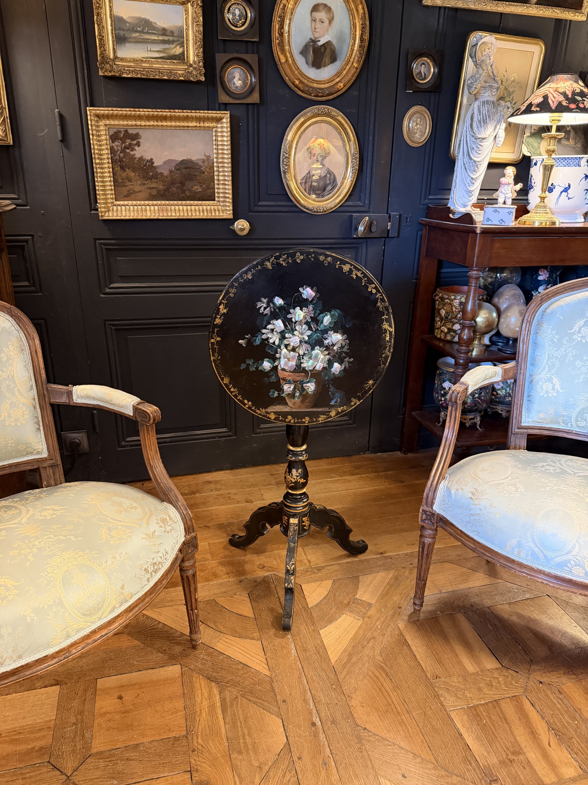 Petit guéridon tripode à bascule XIXème Napoléon III à décor d’un bouquet de fleurs dans un pot en terre cuite et d’un oiseau peint sur fond noir burgauté de nacre entouré d’une frise dorée à décor floral.