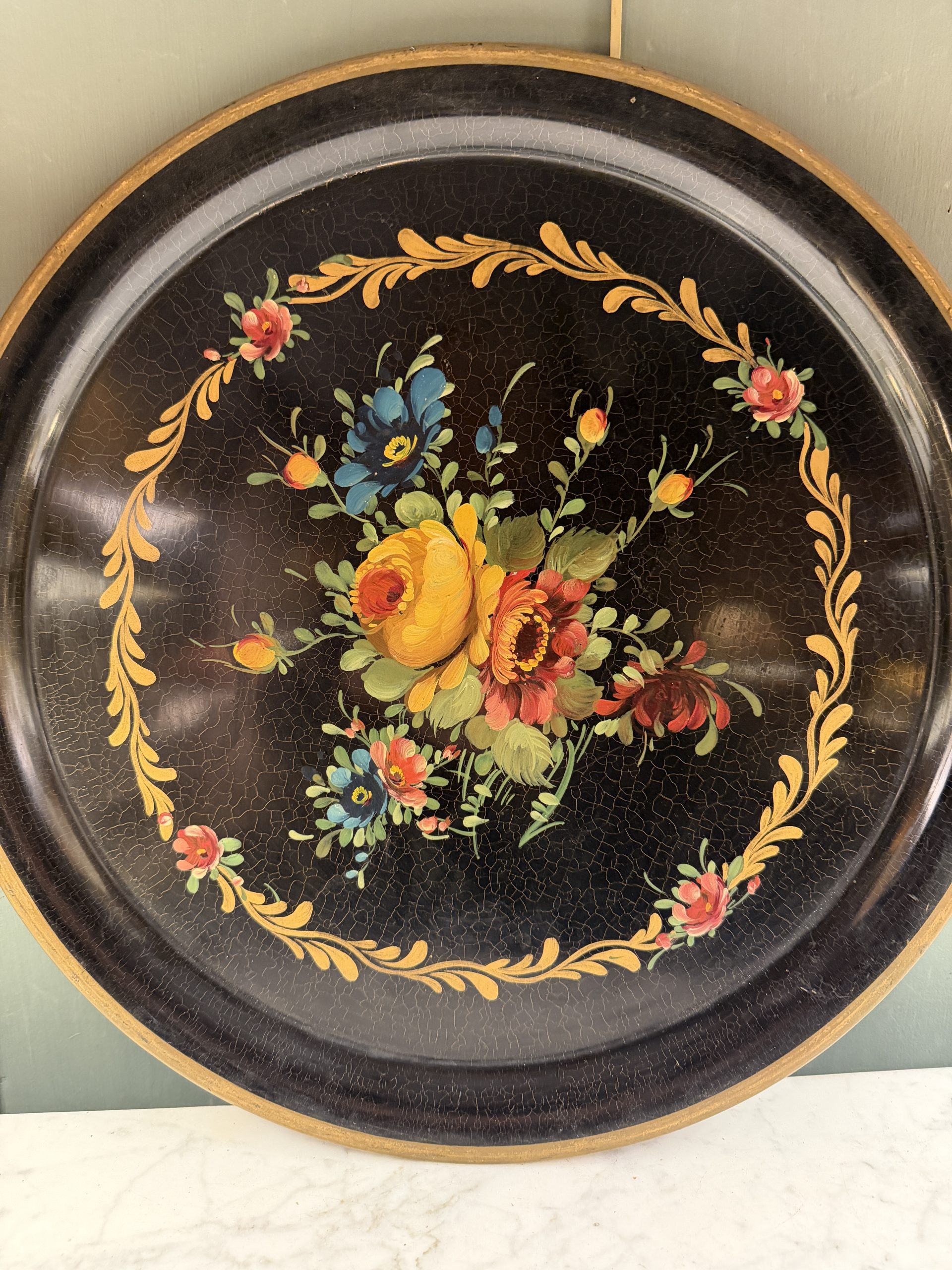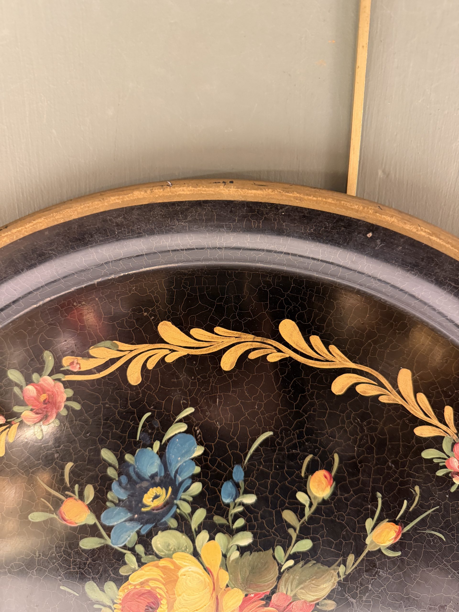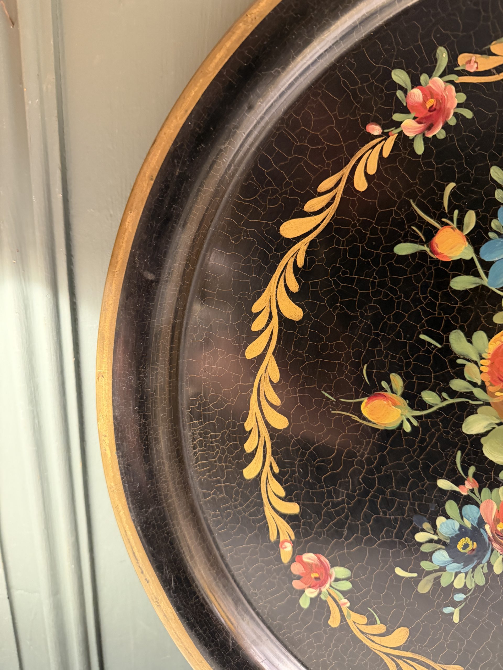 Plateau en tôle peinte à décor floral sur fond noir craquelé époque  XXème.
