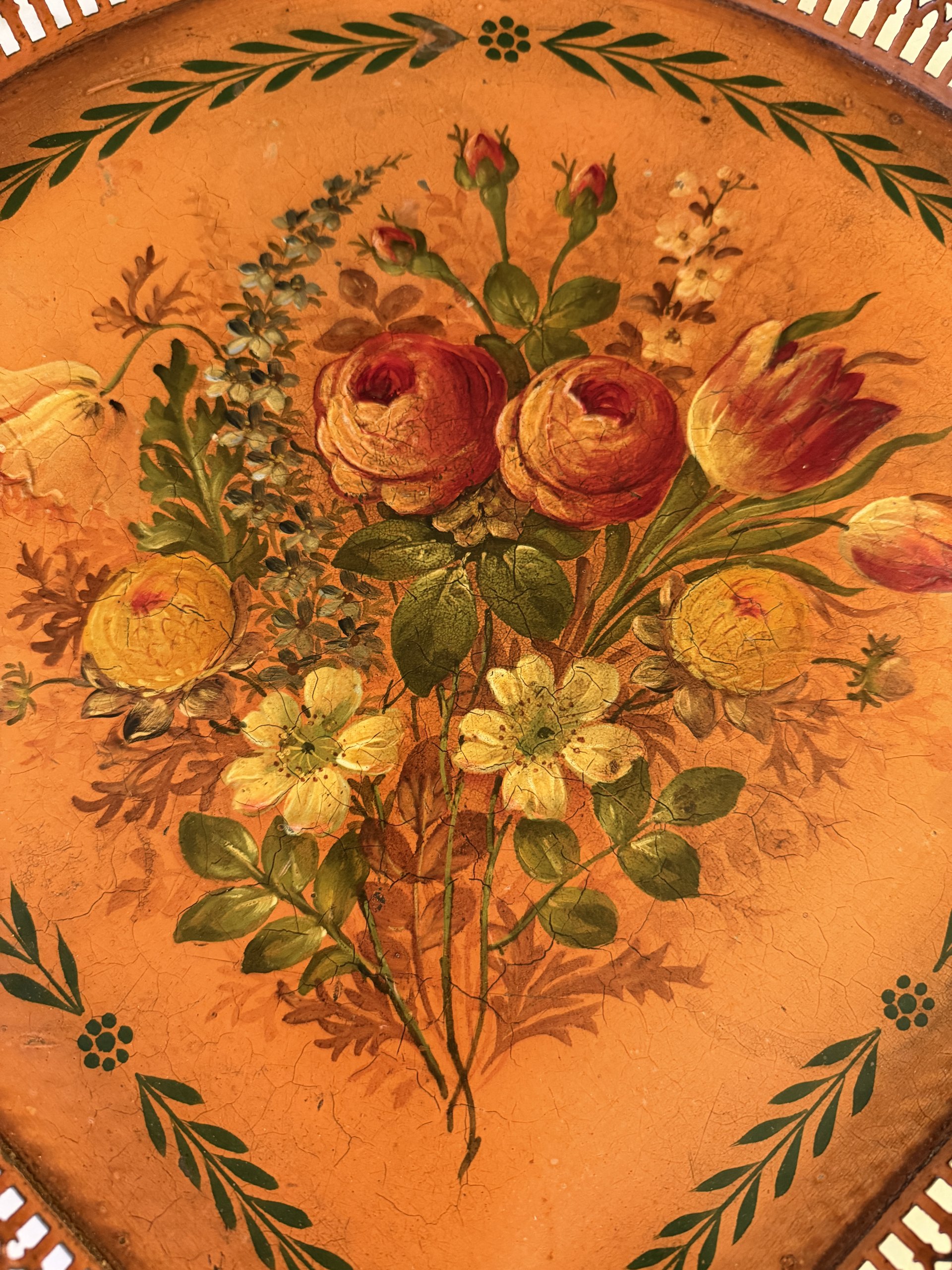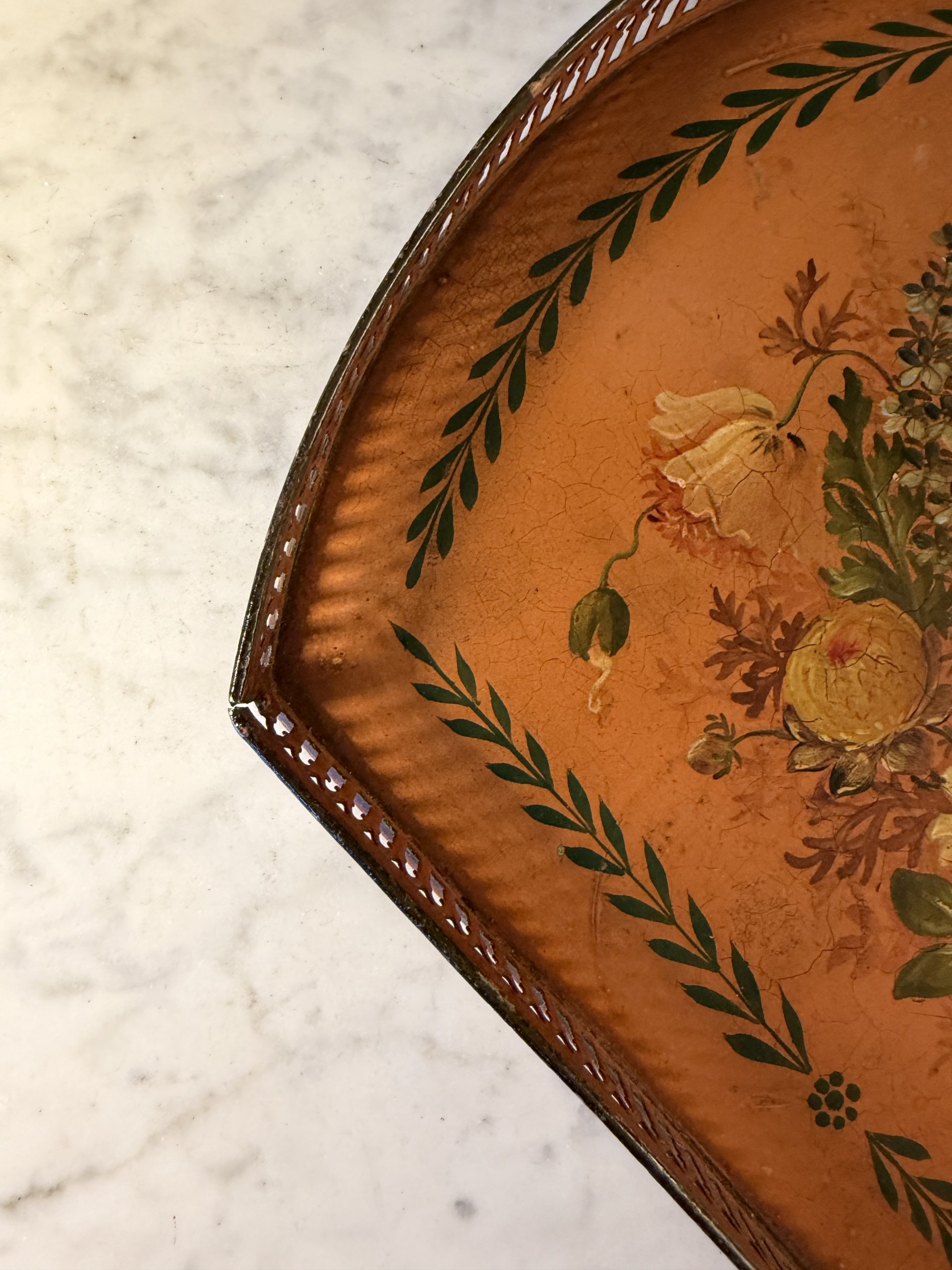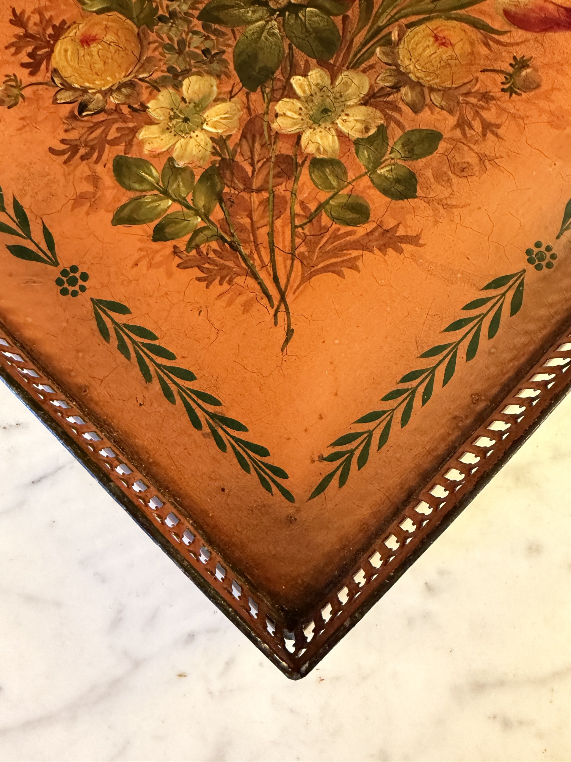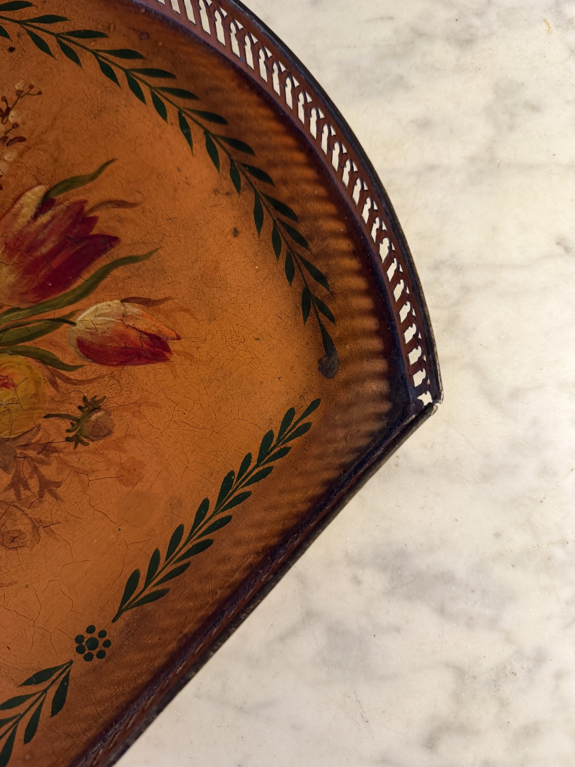 Plateau de forme quart de rond en tôle peinte à décor floral en son centre entouré d’une frise de feuillage stylisée.