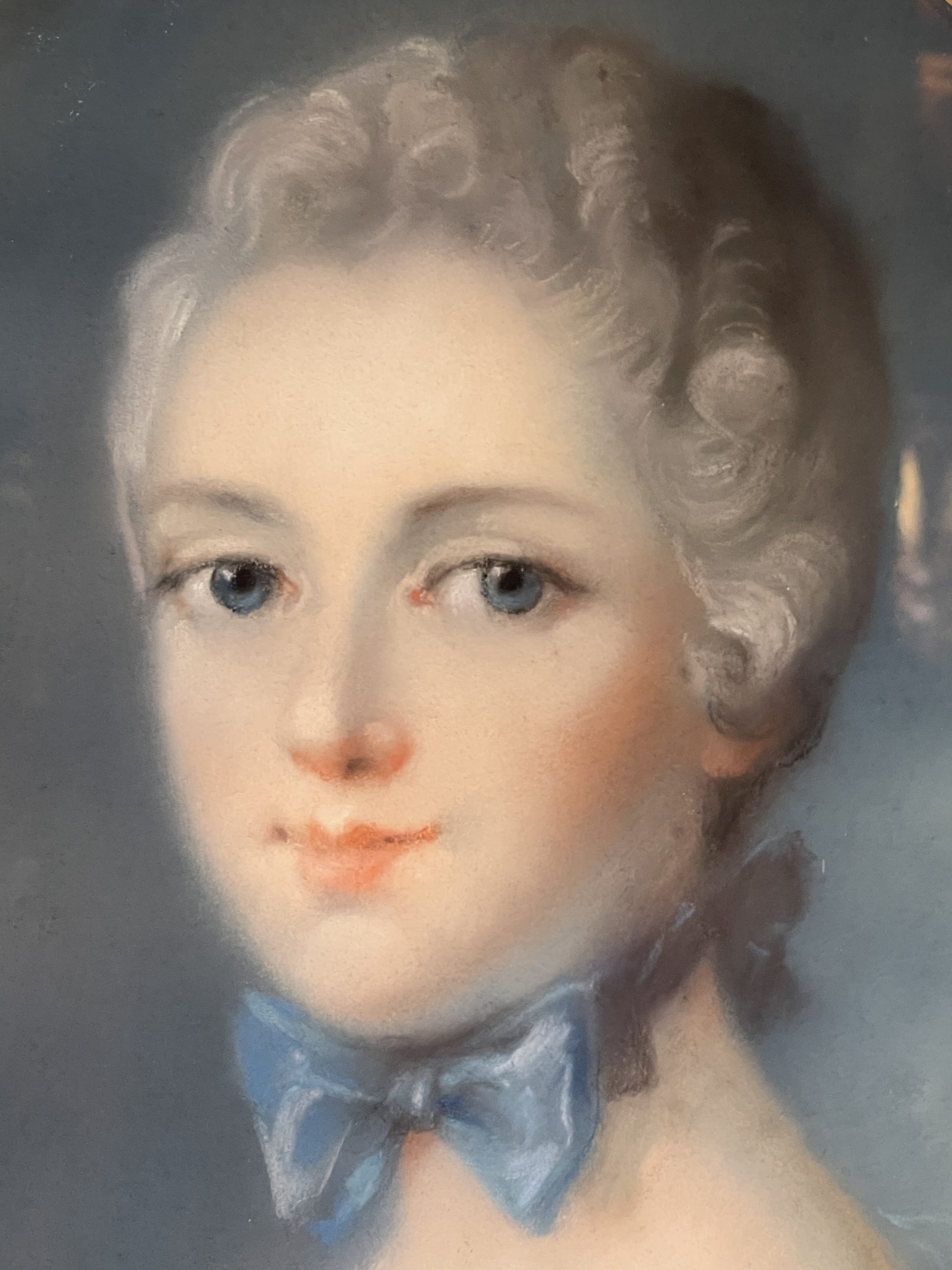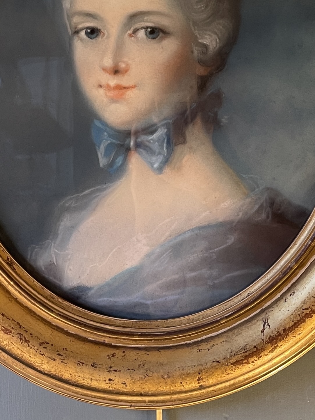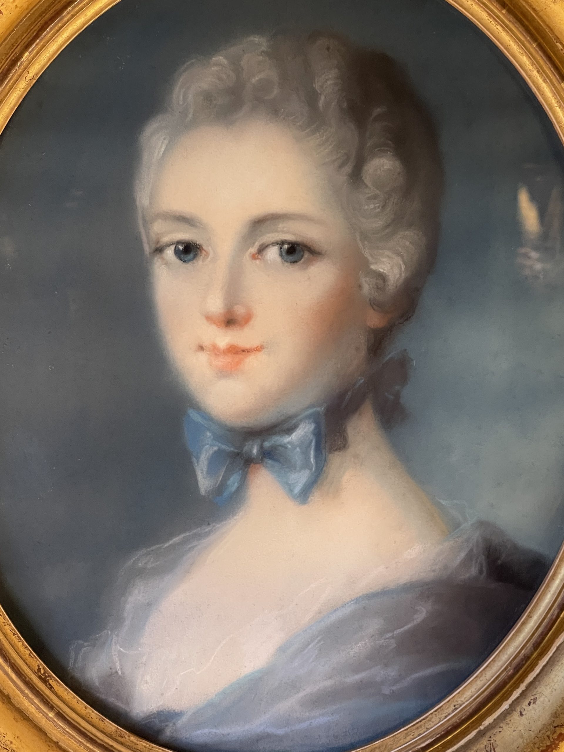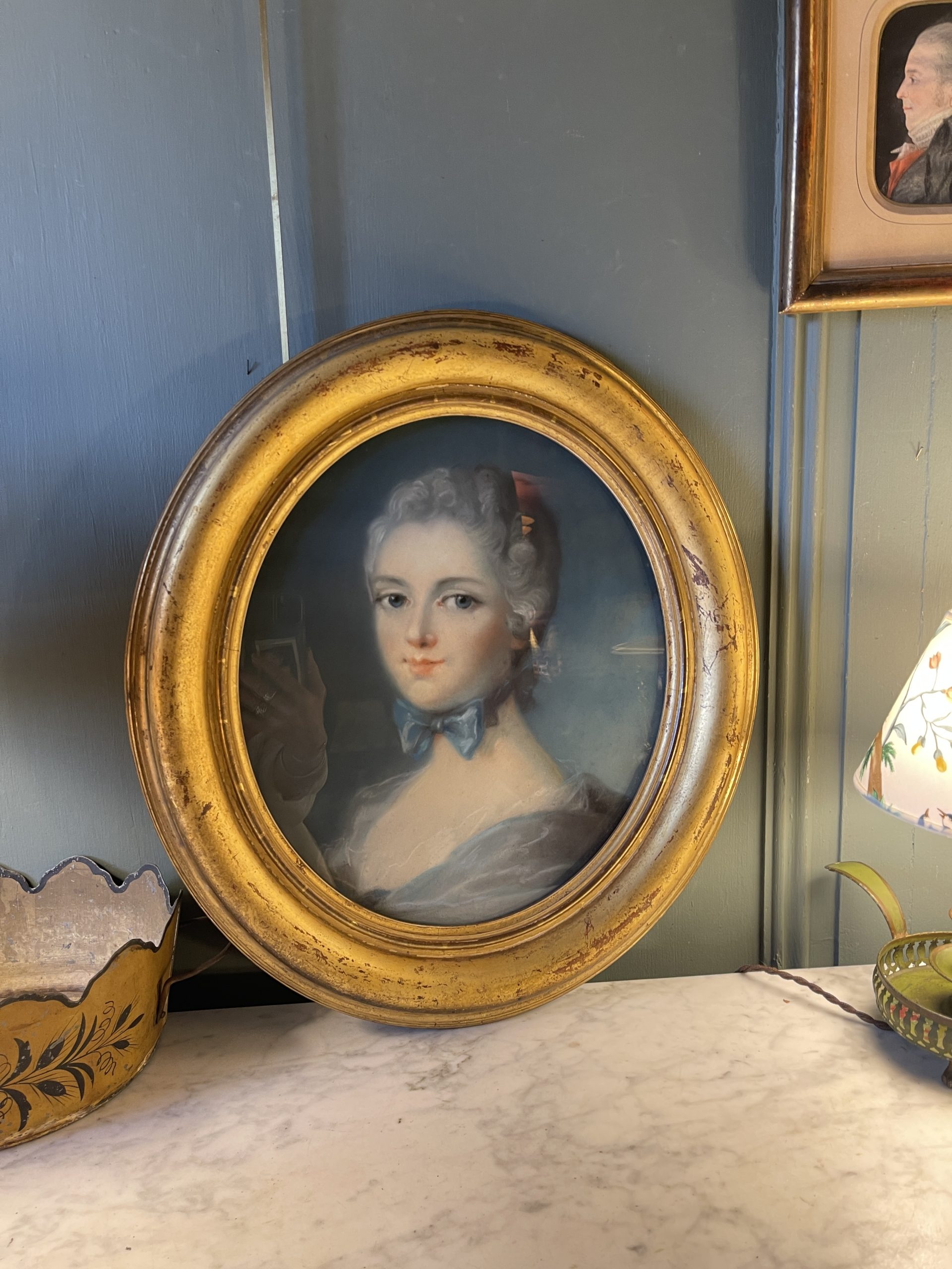 Portrait de dame au noeud bleu dans le goût du milieu du XVIIIème.
