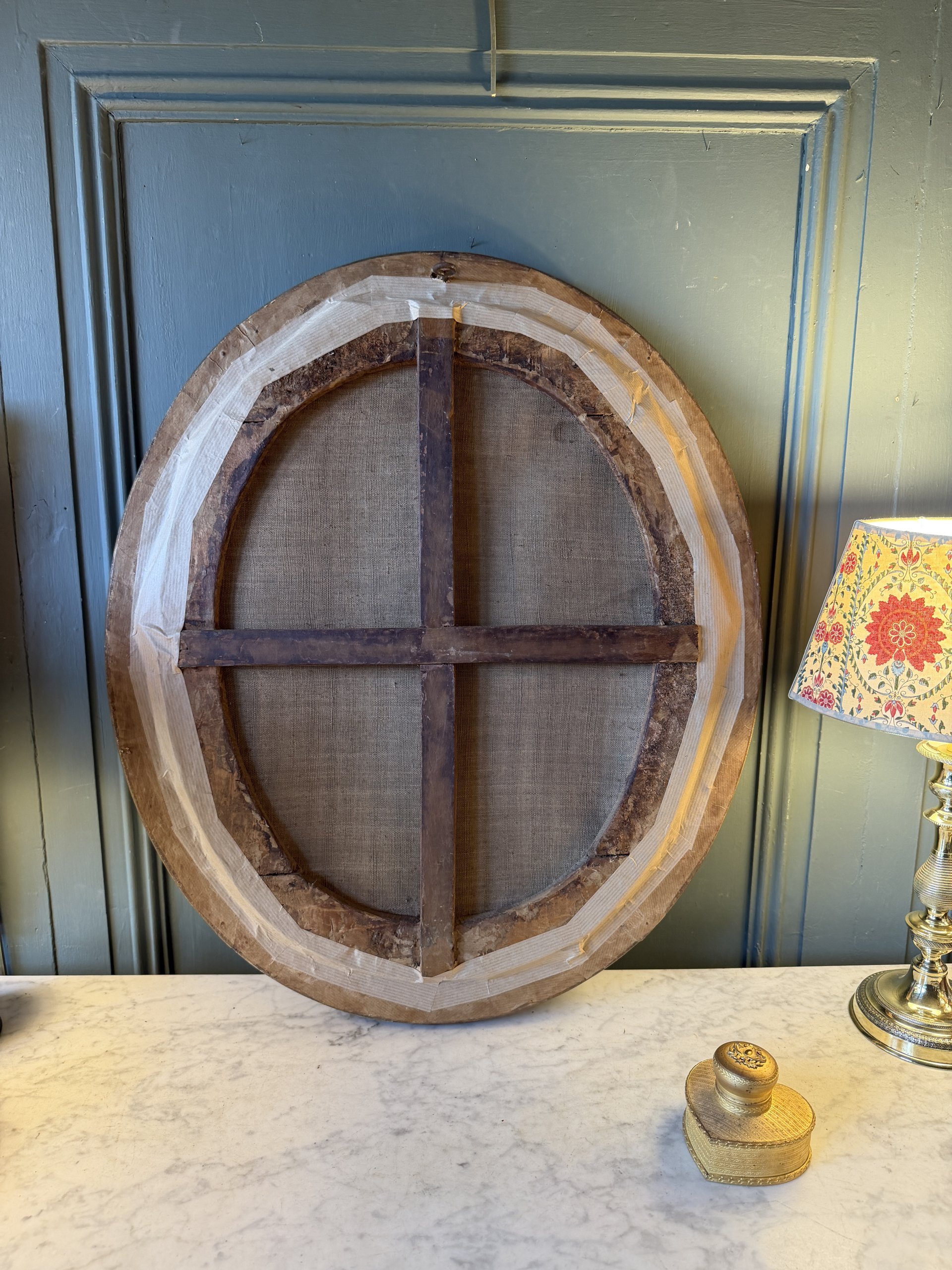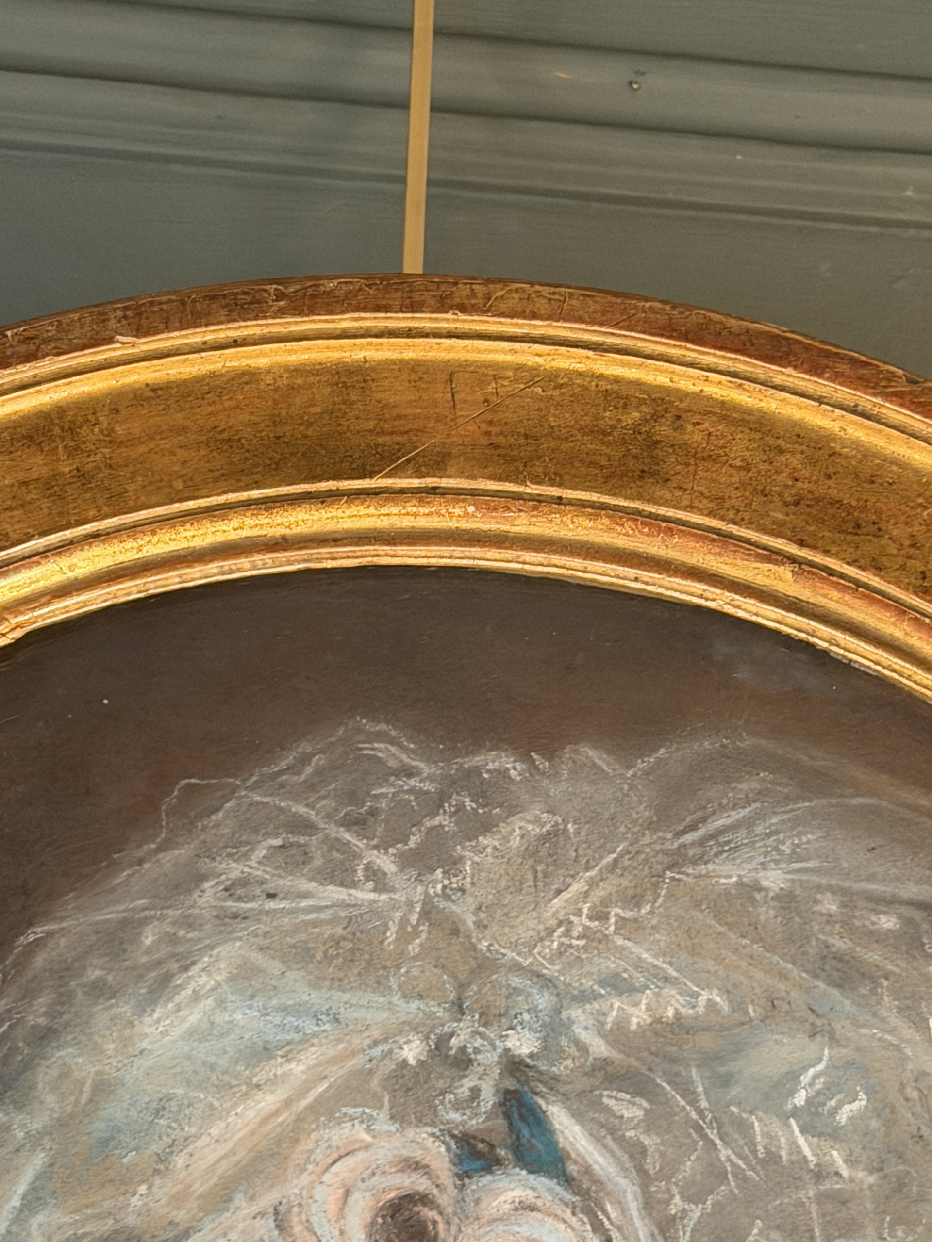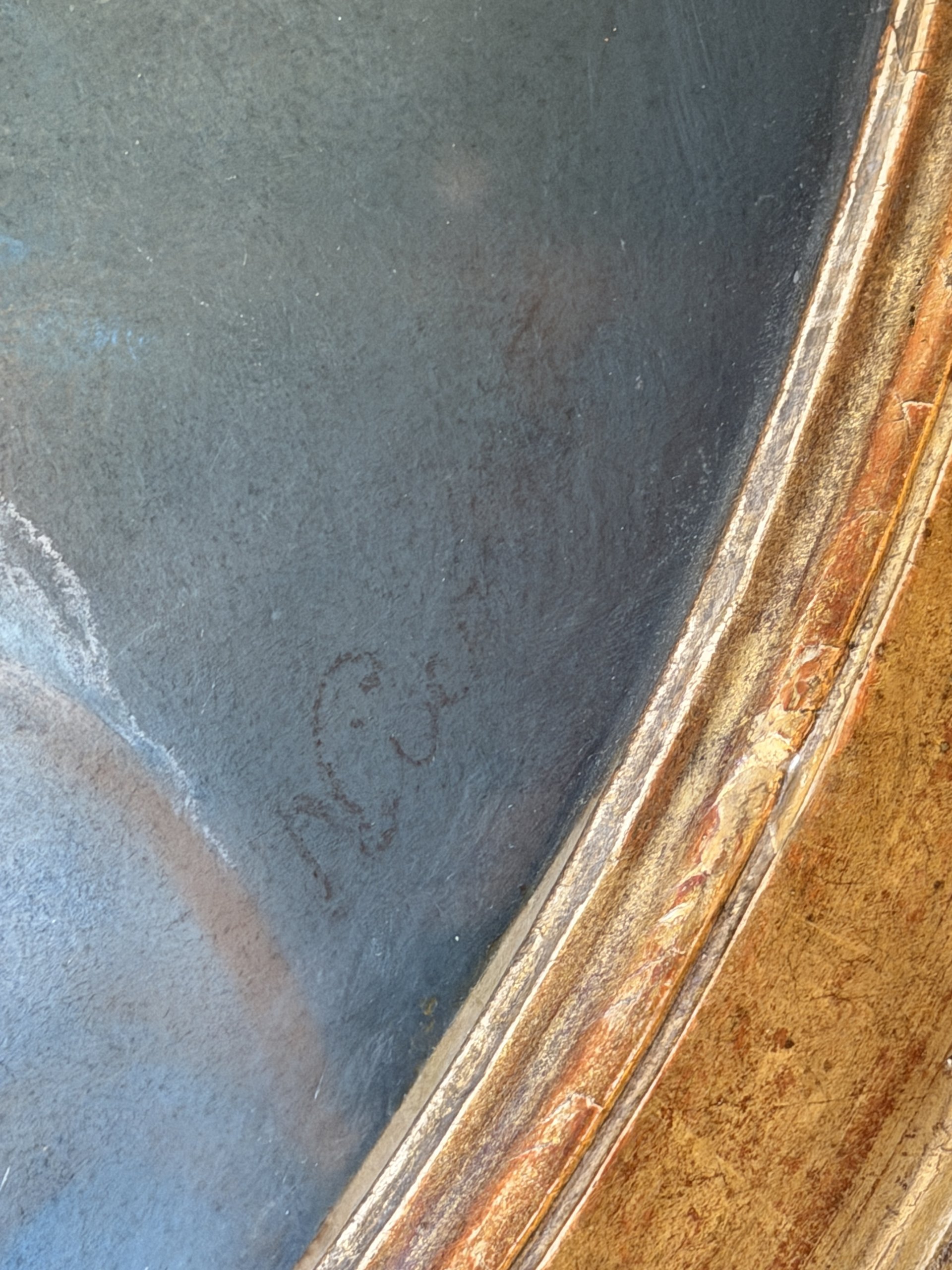 Encadrement doré à la feuille et verre bullé d’origine.
