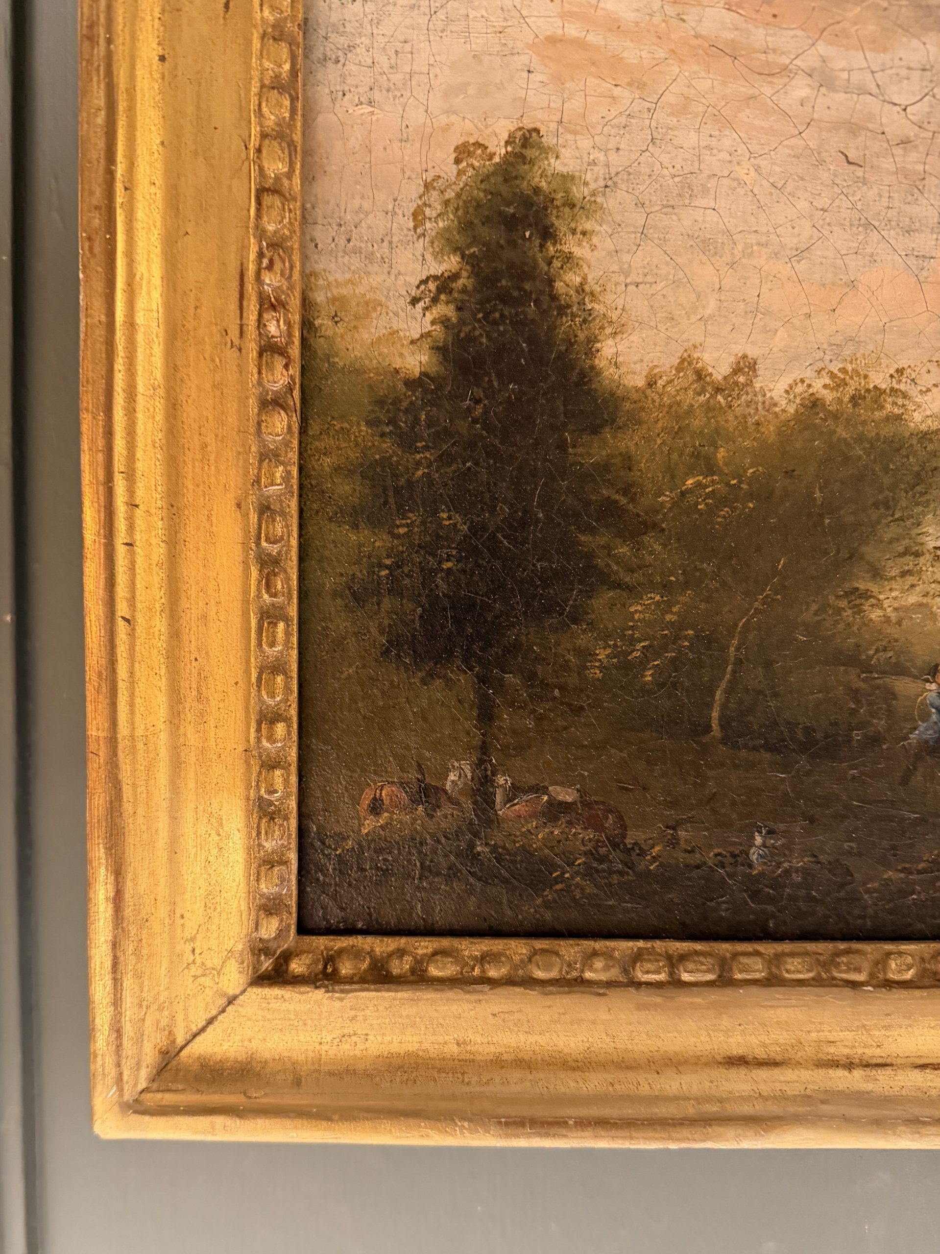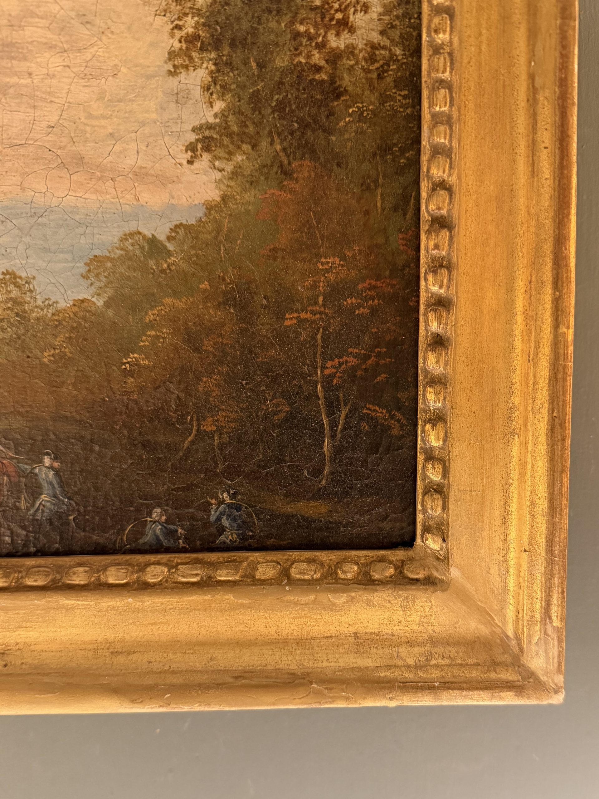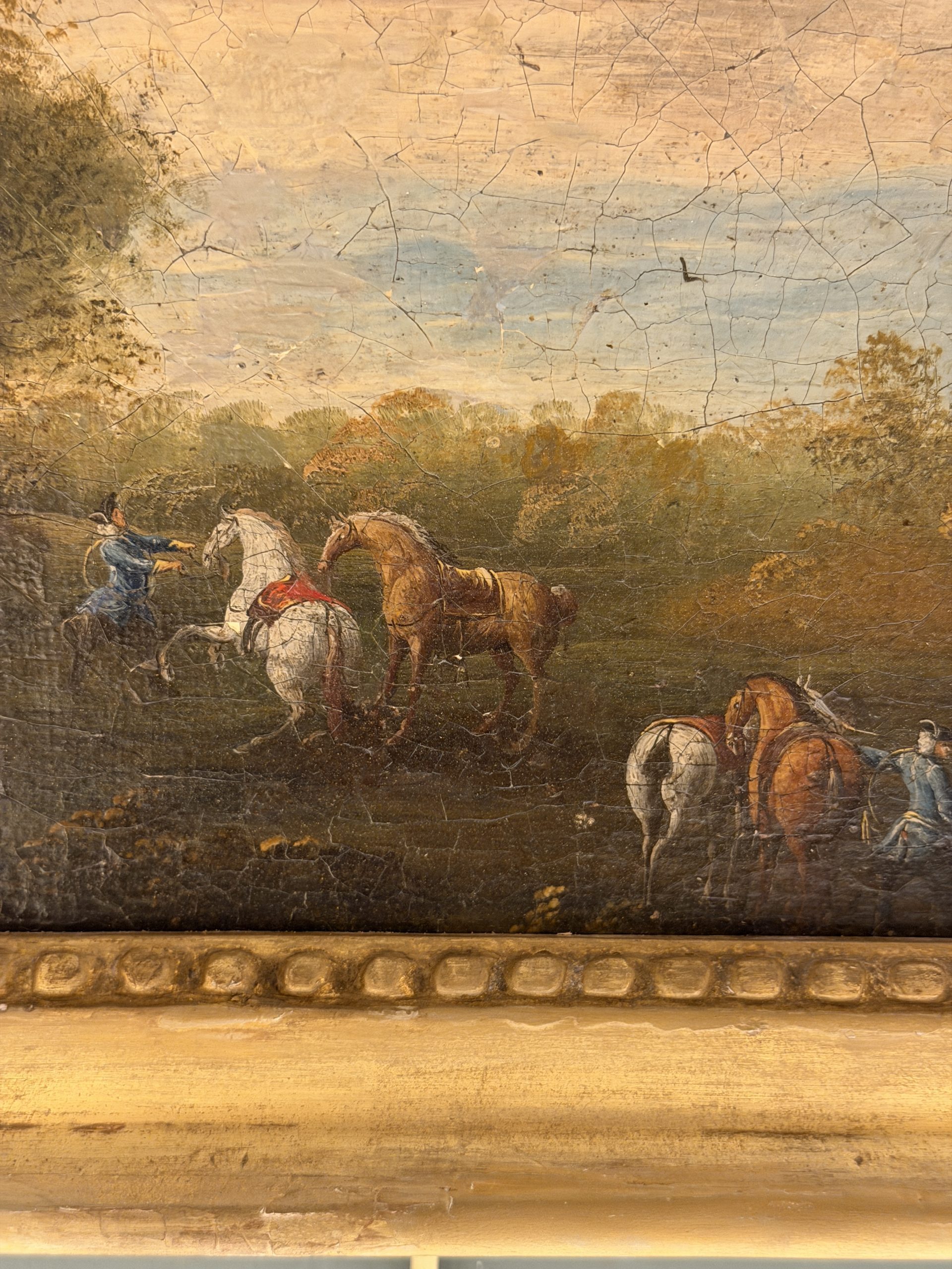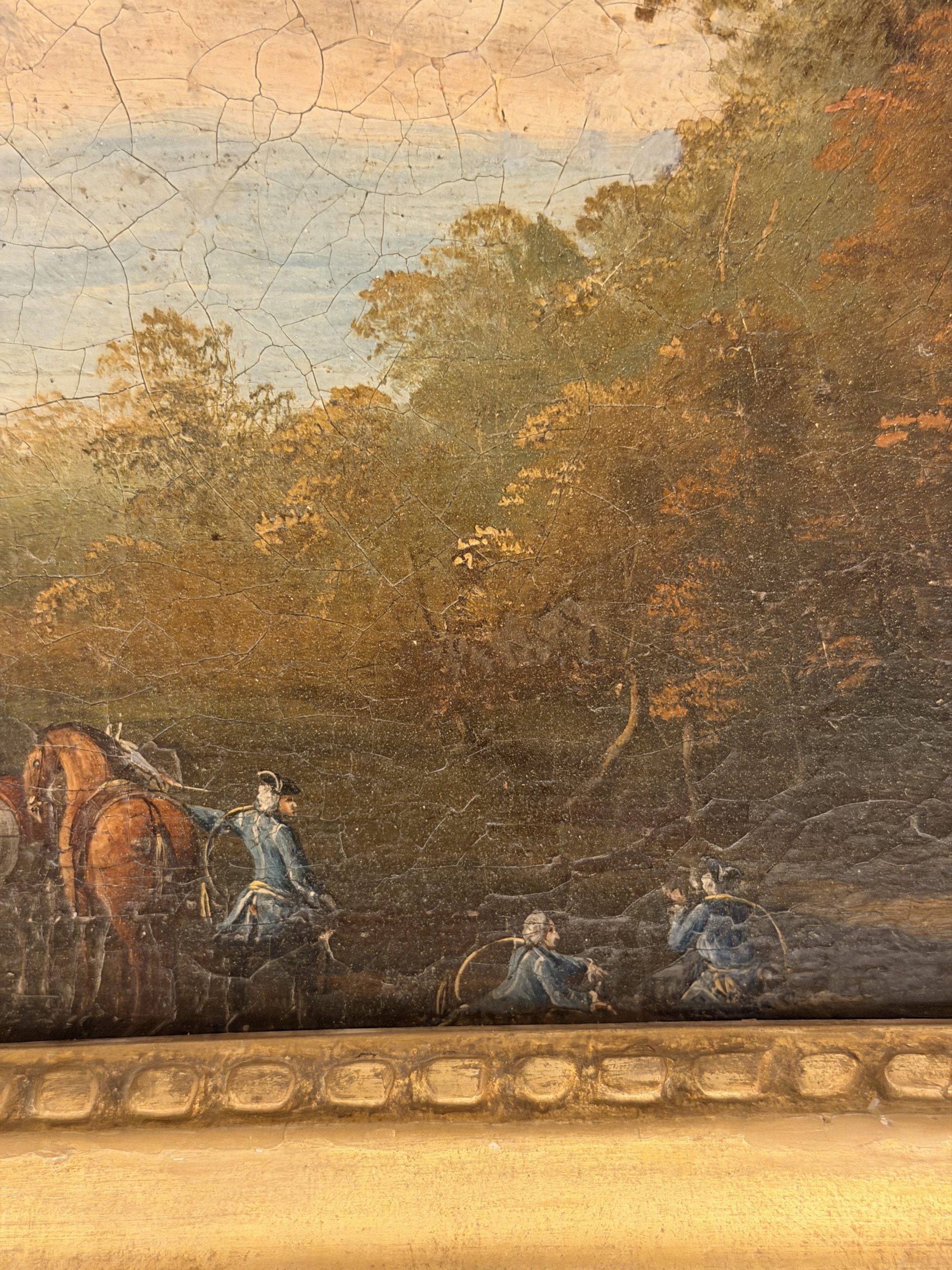 Scène de chasse à courre dans un bois, paysage animé de personnages et chevaux.