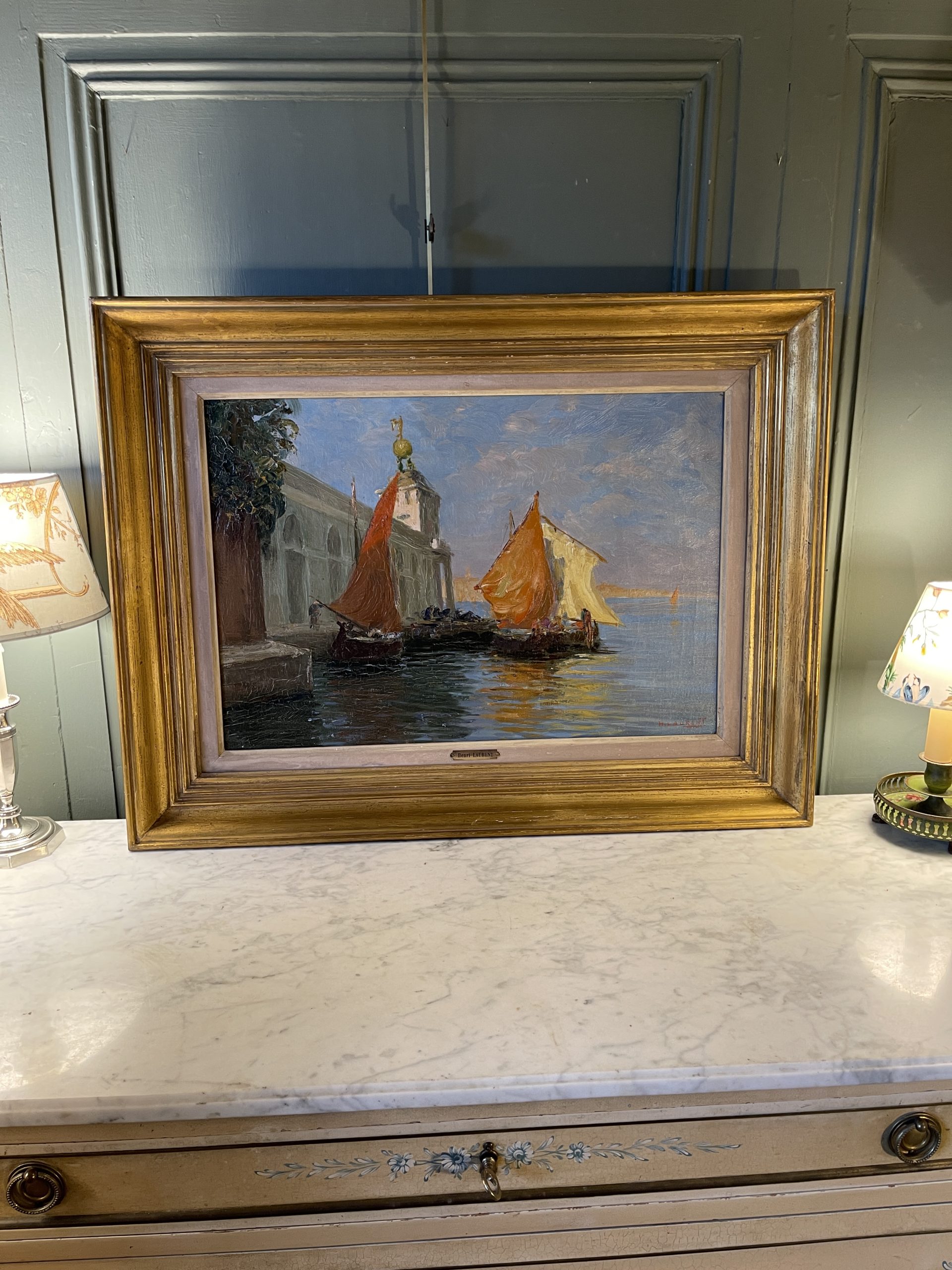Paysage animé de bateaux et personnages, vue de La Punta della Dogana depuis le canal de la Zueca à Venise.
