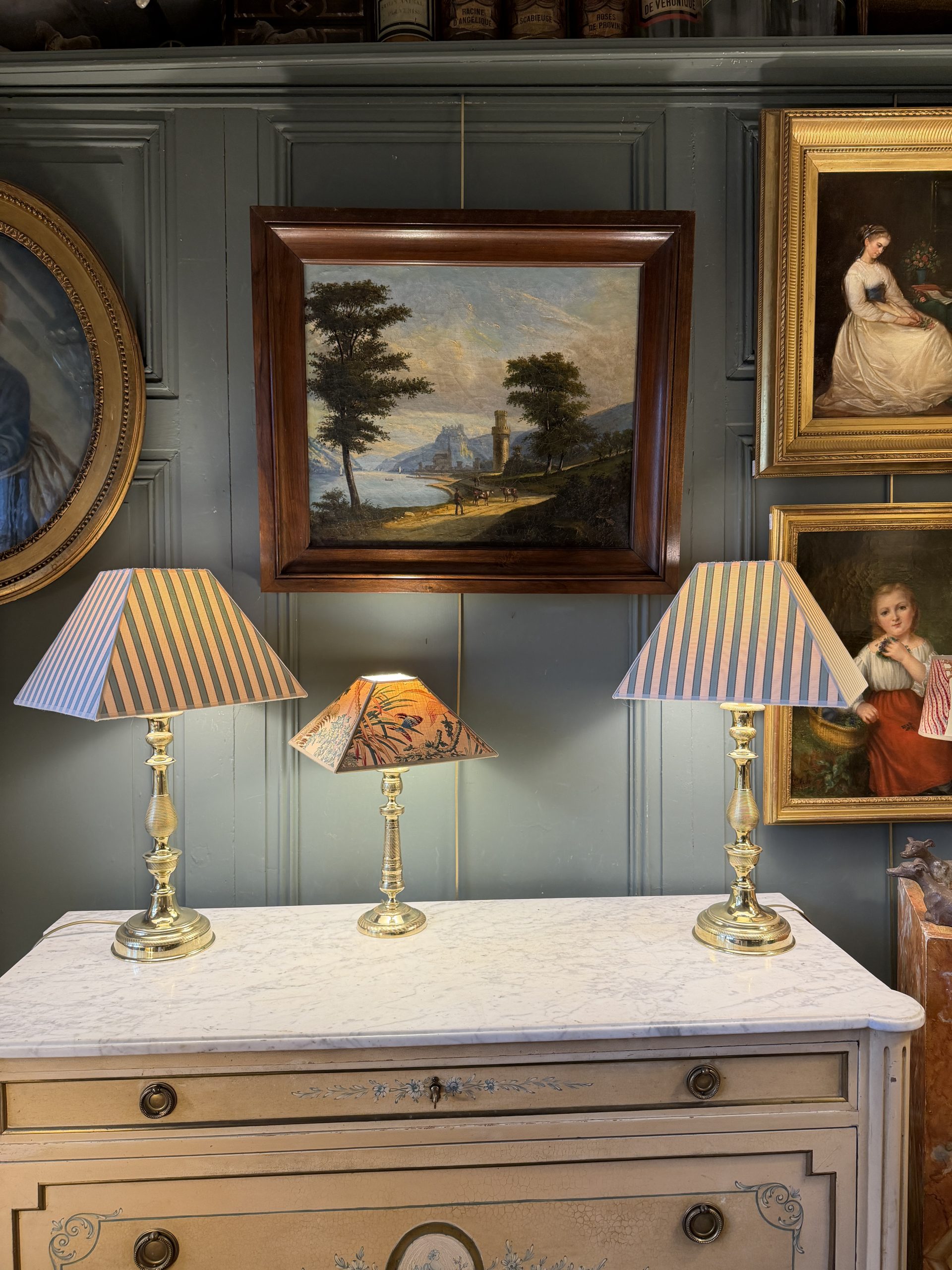 Paysage animé de personnages, vaches et bateaux époque XIXème.