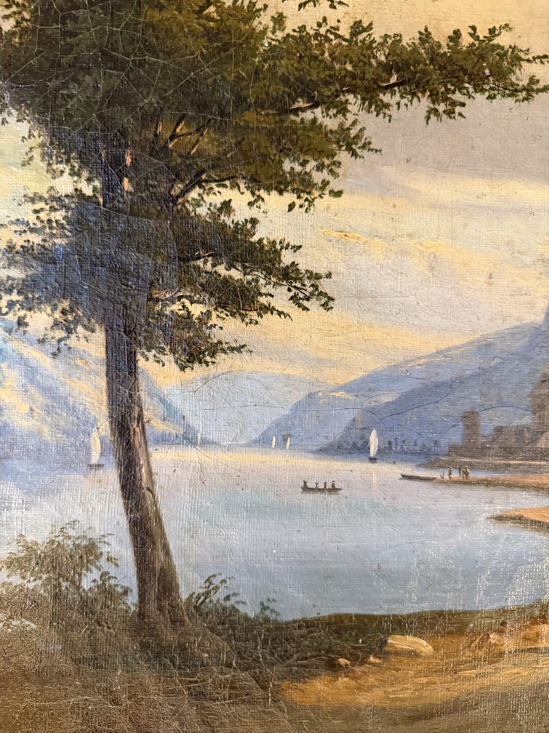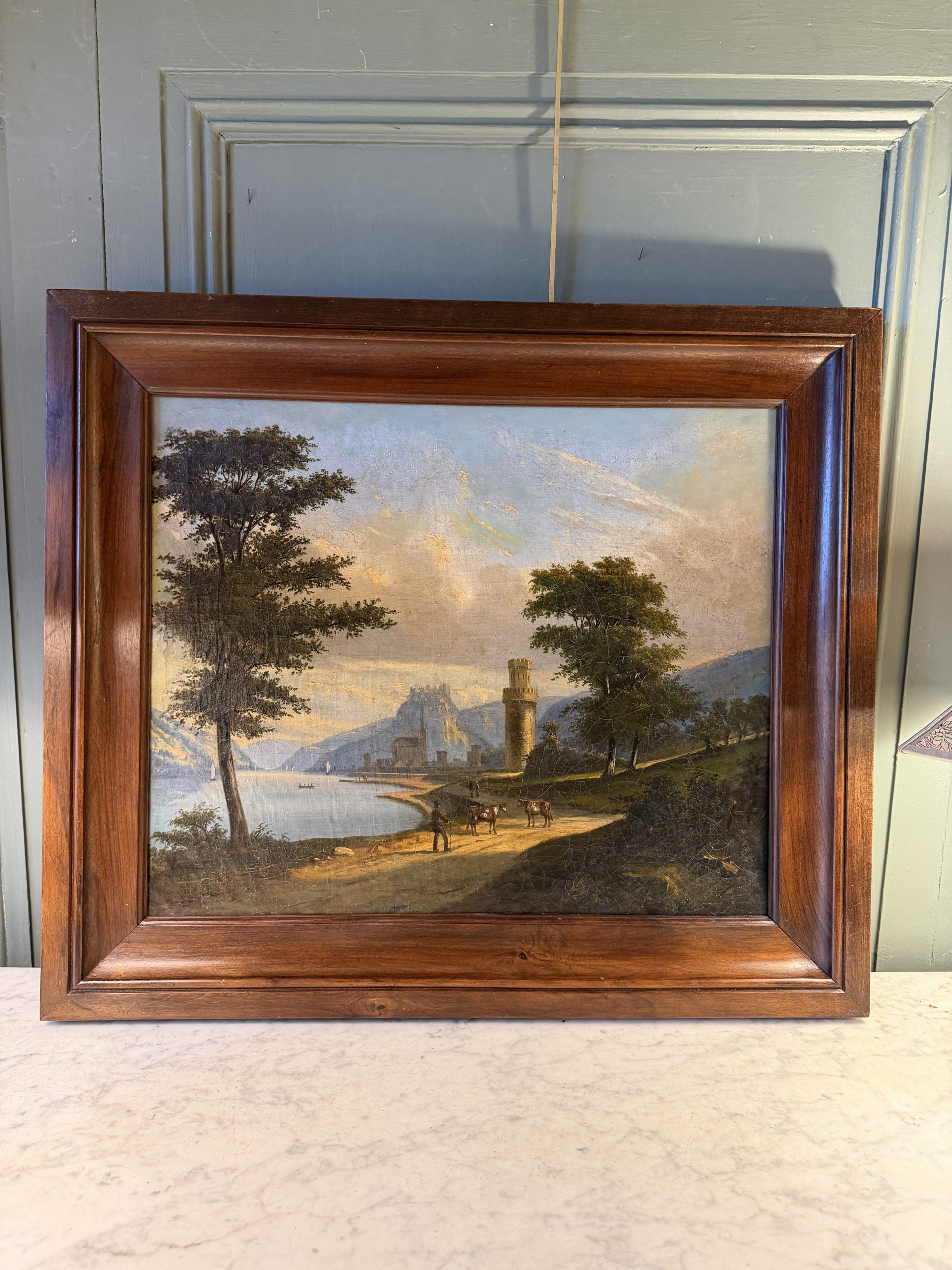 Vue d'Oberwesel depuis le bord du Rhins, paysage animé XIXème